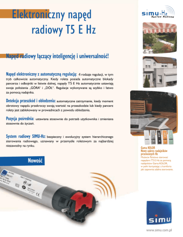 Elektroniczny nap´d radiowy T5 E Hz Nap´d radiowy ∏àczàcy inteligencj´ i uniwersalnoÊç! Nap´d elektroniczny z automatycznà regulacjà: 4 rodzaje regulacji, w tym tryb ca∏kowicie automatyczny. Kiedy roleta posiada automatyczne blokady pancerza i odbojniki w listwie dolnej, nap´dy T5 E Hz automatycznie ustawiajà swoje po∏o˝enia „GÓRA“ i „DÓ¸“. Regulacje wykonywane sà szybko i ∏atwo za pomocà nadajnika. Detekcja przeszkód i oblodzenia: automatyczne zatrzymanie, kiedy moment obrotowy nap´du przekroczy swojà wartoÊç na przeszkodzie lub kiedy pancerz rolety jest zablokowany w prowadnicach z powodu oblodzenia. Pozycja poÊrednia: ustawiana stosownie do potrzeb u˝ytkownika i zmieniana stosownie do ˝yczeƒ. System radiowy SIMU-Hz: bezpieczny i ewolucyjny system hierarchicznego sterowania radiowego, uznawany w przemyÊle roletowym za najbardziej niezawodny na rynku. NowoÊç Gama KOLOR Nowy zakres nadajników przenoÊnych Hz Mo˝ecie Paƒstwo sterowaç nap´dami T5 E Hz za pomocà nadajników Gama KOLOR, w pe∏ni korzystajàc z komfortu jaki zapewnia zdalne sterowanie. www.simu.com.pl Realizacja SIMU - znak nr 01.06 - 2007 PL SIMU Polska — Ten dokument nie jest prawnie wià˝àcy. W ka˝dej chwili zastrzegamy sobie prawo zmian i poprawy naszej oferty. SIMU nie bierze odpowiedzialnoÊci w przypadku u˝ycia przez osoby niekompetentne. This document is not legally binding. We reserve ourselves the right to make any useful modification in order to constantly develop and improve our tender. SIMU shall not be held responsible for misure by non-professionals. Charakterystyka techniczna • Napi´cie zasilajàce: 230 V - 50 Hz • Czas pracy (wy∏àcznik termiczny): 4 min. • Uk∏ad wy∏àczników kraƒcowych ze zliczaniem elektronicznym • Stopieƒ zabezpieczenia IP 44 • Kabel: 3 ˝y∏y 0,75 mm2. Bia∏y H05 VVF (d∏ugoÊç 2,5 m). Czarny H05 RRF (d∏ugoÊç 0,7 m) • Cz´stotliwoÊç radiowa: 433,42 MHz • Zasi´g: ~ 200 m w otwartym terenie ~ 20 m przez 2 Êciany ˝elbetonowe (zale˝ny od warunków Êrodowiska i zanieczyszczenia radiowego) • Automatyczna ponowna regulacja wy∏àczników kraƒcowych co 56 cykli • Najmniejszy pierÊcieƒ wy∏àczników kraƒcowych dla rury Ø 50 x 1,5 mm • Nap´d zgodny ze standardami E.M.C. (zgodnoÊç elektromagnetyczna) i D.B.T. Dost´pne sà tak˝e karty katalogowe pozosta∏ych produktów zakresu radiowego SIMU-Hz. Prosimy o kontakt. www.simu.com.pl