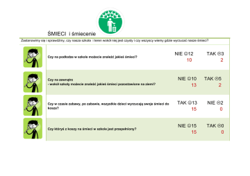 ŚMIECI i śmiecenie Zastanowimy się i sprawdźmy, czy nasza szkoła i teren wokół niej jest czysty i czy wszyscy wiemy gdzie wyrzucać nasze śmieci? Czy na podłodze w szkole możecie znaleźć jakieś śmieci? NIE 12 10 TAK 3 2 Czy na zewnątrz - wokół szkoły możecie znaleźć jakieś śmieci pozostawione na ziemi? NIE 10 13 TAK 5 2 Czy w czasie zabawy, po zabawie, wszystkie dzieci wyrzucają swoje śmieci do kosza? TAK 13 15 NIE 2 0 Czy któryś z koszy na śmieci w szkole jest przepełniony? NIE 15 15 TAK 0 0 Czy wszyscy w Waszej szkole wiedzą dlaczego należy wyrzucać śmieci w odpowiednie miejsce (do kosza, odpowiednich pojemników)? TAK 15 15 NIE 0 0 ODPADY - ograniczanie, ponowne wykorzystanie i recykling Czy większość uczniów przynosi swoje drugie śniadanie w opakowaniu, które można ponownie użyć (np. pudełko śniadaniowe)? TAK 0 0 NIE15 15 Czy nauczyciele i wychowawcy drukują i kserują dokumenty dwustronnie (obie strony są zadrukowane) kiedy to tylko możliwe? TAK 14 15 NIE 1 0 Czy używacie drugiej strony papieru (zadrukowanego jednostronnie) do rysunków, notatek, itp. zanim trafi do kosza? TAK 13 15 NIE 2 0 Czy w toalecie szkolnej używany jest papier z recyklingu? TAK 15 15 NIE 0 0 Czy w szkole organizowane są wymiany lub giełdy używanych książek, gier, filmów, itp.? TAK 2 6 NIE 13 9 Czy w koszach do sortowania śmieci zawsze znajdują się odpowiednie odpady? TAK 15 15 NIE 0 0 Czy w Waszej szkole znajduje się kompost? TAK 0 0 NIE 15 15 Czy osoby gotujące w szkolnej kuchni wyrzucają odpady po warzywach i owocach na kompost? TAK 0 0 NIE 15 15 Czy wiecie co dzieje się z odpadami, które trafiły do recyklingu? TAK 12 14 NIE 3 1 Czy wiecie co dzieje się ze śmieciami, które trafiły do zwykłego kosza na śmieci? TAK 13 15 NIE 2 0 Czy szkoła używa poczty elektronicznej (e-mail) do kontaktu z rodzicami? TAK 15 15 NIE 0 0 Czy światło jest zawsze wyłączane, kiedy klasa jest pusta? TAK 15 15 NIE 0 0 Czy światło jest gaszone jeśli w klasie jest wystarczająco słonecznie? TAK 15 15 NIE 0 0 Czy sprawdzacie, czy wszystkie światła i komputery są wyłączone np. w czasie długiej przerwy lub po lekcjach? TAK 15 15 NIE 0 0 Czy okna i drzwi są zamykane kiedy ogrzewanie jest włączone? TAK 13 13 NIE 2 2 Czy zasłony, firanki w czasie ogrzewania zasłaniają kaloryfer? NIE 15 15 TAK 0 0 WODA Czy z któregoś kranu cieknie/kapie woda po zakręceniu? NIE 14 14 TAK 1 1 Czy zdarza się, że ktoś pozostawia włączoną wodę w łazience i wychodzi? NIE 13 14 TAK 2 1 Czy spłuczka posiada funkcję start-stop lub ma dwudzielny przycisk? TAK 2 12 NIE 13 3 Jeśli nie - to czy w spłuczkach znajduje się ogranicznik spłukiwanej wody? (specjalne opakowanie lub plastikowa butelka napełniona wodą) TAK 0 12 NIE 15 3 TAK 1 2 NIE 14 13 Czy wiecie, czy w Waszej miejscowości można pić bezpiecznie wodę z kranu? TAK 13 15 NIE 2 0 Czy wiecie dlaczego tak ważne jest oszczędzanie wody? TAK 15 15 NIE 0 0 Czy na zewnątrz szkoły znajduje się zbiornik lub zbiorniki na wodę deszczową? (wykorzystywaną później np. do podlewania kwiatów) TRANSPORT i AKTYWNOŚĆ Czy droga piesza do Twojej szkoły jest bezpieczna? TAK 15 15 NIE 0 0 Czy do Twojej szkoły można dojechać bezpiecznie na rowerze? (np. ścieżkami rowerowymi) TAK 12 14 NIE 3 1 TAK 2 1 NIE 13 14 TAK 15 15 NIE 0 0 Czy przed szkołą znajdują się stojaki rowerowe dla rodziców i uczniów? Czy codziennie w szkole macie ćwiczenia ruchowe? Czy w roku szkolnym są dni, w których zachęcacie jak największą liczbę dzieci do przyjścia pieszo do szkoły? Czy w szkole organizowane są wspólne piesze wycieczki? Czy rano i na koniec lekcji, przed szkołą znajduje się duża liczba zaparkowanych samochodów? Czy w szkole prowadzone są zajęcia jak bezpiecznie jeździć na rowerze? Czy badacie, ilu uczniów podwozi samochodem jeden rodzic? (np. rodzice podwożą dzieci sąsiadów) TAK 4 7 NIE 11 8 TAK 15 15 NIE 0 0 NIE 1 3 TAK 14 12 TAK 15 15 NIE 0 0 TAK 4 9 NIE 11 6 TAK 5 10 NIE 10 5 Czy rodzice czekający w samochodzie na dzieci, wyłączają silnik w zaparkowanym samochodzie? TAK 11 14 NIE 4 1 Czy wszystkie dzieci wiedzą jak bezpiecznie przechodzić przez ulicę? TAK 14 15 NIE 1 0 TAK 15 15 NIE 0 0 Czy w szkole liczycie co jakiś czas ile osób dojeżdża do szkoły rowerem lub chodzi pieszo? ZDROWA ŻYWNOŚĆ W SZKOLE Czy każdego dnia jecie owoce (np. w trakcie przerwy, po obiedzie)? Czy do szkolnego obiadu serwowana jest sałatka/warzywa? TAK 15 15 NIE 0 0 Czy możliwe jest żeby mieć ze sobą butelkę wody w trakcie lekcji/zajęć? TAK 15 15 NIE 0 0 Czy dzieci uprawiają jakieś warzywa lub owoce w szkole (np. w ogródku, w doniczkach)? TAK 15 15 NIE 0 0 Czy w sklepiku szkolnym można kupić świeżo przygotowane kanapki, warzywa lub owoce? TAK 0 0 NIE 15 15 Czy w szkole znajduje się dystrybutor ze słodyczami lub/i napojami gazowanymi? NIE 15 15 TAK 0 0 Czy obiady szkolne przygotowywane są ze świeżych i nieprzetworzonych produktów? Czy dzieci przynoszą na drugie śniadanie warzywa, owoce lub kanapki z warzywami? TAK 15 15 NIE 0 0 TAK 6 2 NIE 9 13 ZIELONE TERENY PRZYSZKOLNE Teren przyszkolny to miejsce, które otacza szkołę do jej ogrodzenia - niekiedy jest to duży zielony ogród, a czasem jedynie niewielki skrawek terenu, jednak nawet w takie miejsce można zmienić na bardziej przyjazne naturze i dzieciom Czy na terenie przyszkolnym znajdują się drzewa i/lub żywopłot? Czy na terenie przyszkolnym znajduje się oczko wodne/staw? TAK 15 15 TAK 0 0 NIE 0 0 NIE 15 15 Czy na terenie szkolnym jest miejsce w którym są dziko rosnące kwiaty i trawa (łąka)? TAK 15 15 NIE 0 0 Dowiedz się w jakich warunkach mogą znaleźć schronienie takie zwierzęta jak: jeż, trzmiel, motyl, pszczoła murarka? Czy na terenie Waszej szkoły są miejsca, w których mogą znaleźć schronienie? TAK 7 12 NIE 8 3 Czy teren szkoły jest przyjazny dla ptaków? - znajduje się w nim np.: budka lęgowa 