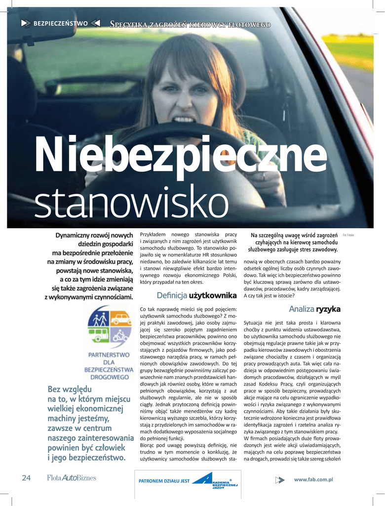 BEZPIECZEŃSTWO Specyfika zagro$e" kierowcy flotowego Niebezpieczne stanowisko Dynamiczny rozwój nowych dziedzin gospodarki ma bezpośrednie przełożenie na zmiany w środowisku pracy, powstają nowe stanowiska, a co za tym idzie zmieniają się także zagrożenia związane z wykonywanymi czynnościami. 24 Przykładem nowego stanowiska pracy i związanych z nim zagrożeń jest użytkownik samochodu służbowego. To stanowisko pojawiło się w nomenklaturze HR stosunkowo niedawno, bo zaledwie kilkanaście lat temu i stanowi niewątpliwie efekt bardzo intensywnego rozwoju ekonomicznego Polski, który przypadał na ten okres. Definicja użytkownika Bez względu na to, w którym miejscu wielkiej ekonomicznej machiny jesteśmy, zawsze w centrum naszego zainteresowania powinien być człowiek i jego bezpieczeństwo. Co tak naprawdę mieści się pod pojęciem: użytkownik samochodu służbowego? Z mojej praktyki zawodowej, jako osoby zajmującej się szeroko pojętym zagadnieniem bezpieczeństwa pracowników, powinno ono obejmować wszystkich pracowników korzystających z pojazdów firmowych, jako podstawowego narzędzia pracy, w ramach pełnionych obowiązków zawodowych. Do tej grupy bezwzględnie powinniśmy zaliczyć powszechnie nam znanych przedstawicieli handlowych jak również osoby, które w ramach pełnionych obowiązków, korzystają z aut służbowych regularnie, ale nie w sposób ciągły. Jednak przytoczoną definicją powinniśmy objąć także menedżerów czy kadrę kierowniczą wyższego szczebla, którzy korzystają z przydzielonych im samochodów w ramach dodatkowego wyposażenia socjalnego do pełnionej funkcji. Biorąc pod uwagę powyższą definicję, nie trudno w tym momencie o konkluzję, że użytkownicy samochodów służbowych sta- FlotaAutoBiznes PATRONEM DZIAŁU JEST Na szczególną uwagę wśród zagrożeń czyhających na kierowcę samochodu służbowego zasługuje stres zawodowy. nowią w obecnych czasach bardzo poważny odsetek ogólnej liczby osób czynnych zawodowo. Tak więc ich bezpieczeństwo powinno być kluczową sprawą zarówno dla ustawodawców, pracodawców, kadry zarządzającej. A czy tak jest w istocie? Analiza ryzyka Sytuacja nie jest taka prosta i klarowna choćby z punktu widzenia ustawodawstwa, bo użytkownika samochodu służbowego nie obejmują regulacje prawne takie jak w przypadku kierowców zawodowych i obostrzenia związane chociażby z czasem i organizacją pracy prowadzących auta. Tak więc cała nadzieja w odpowiednim postępowaniu świadomych pracodawców, działających w myśl zasad Kodeksu Pracy, czyli organizujących prace w sposób bezpieczny, prowadzących akcje mające na celu ograniczenie wypadkowości i ryzyka związanego z wykonywanymi czynnościami. Aby takie działania były skutecznie wdrożone konieczna jest prawidłowa identyfikacja zagrożeń i rzetelna analiza ryzyka związanego z tym stanowiskiem pracy. W firmach posiadających duże floty prowadzonych jest wiele akcji uświadamiających, mających na celu poprawę bezpieczeństwa na drogach, prowadzi się także szereg szkoleń www.fab.com.pl Fot. Fotolia BEZPIECZEŃSTWO 40% wszystkich wypadków w ruchu drogowym dotyczy osób pełniących obowiązki zawodowe lub będące w drodze do lub z pracy. 11-godzinnego nieprzerwanego odpoczynku i prace powyżej przeciętnie pięciu dni w tygodniu w przyjętym okresie rozliczeniowym. związanych z kształtowaniem odpowiednich zachowań. Partnerstwo dla Bezpieczeństwa Drogowego zrzesza takie właśnie przedsiębiorstwa, prowadząc wiele skutecznych projektów, którym przyświeca jeden cel: podniesienie bezpieczeństwa na drogach. Niestety, statystyki związane z wypadkami przy pracy osób jeżdżących samochodami służbowymi są bardzo dalekie od ideału, żeby nie użyć słowa zatrważające. Specyfika zagrożeń Użytkownik samochodu służbowego to stanowisko pracy o szczególnym charakterze, obwarowane szczególnymi wymaganiami w stosunku do pracownika. Jest narażone na szereg zagrożeń, wśród których wypadek komunikacyjny należy zaliczyć do tych najpoważniejszych. Powinniśmy pamiętać, że nawet najnowocześniejsze samochody nie będą sprawnie funkcjonować bez sprawnego i zdrowego kierowcy. Specyficzne wymagania, o których wspomniano powyżej, to przede wszystkim: • szczególna sprawność w zakresie szybkiego reagowania na złożone reakcje bodźcowe • dobra koordynacja wzrokowo-ruchowa • sprawność ruchowa • koncentracja i podzielność uwagi • szczególna sprawność narządu zmysłów • odporność emocjonalna w tym odporność na stres • umiejętność zarządzania własnym czasem i priorytetami • sztuka negocjacji i komunikatywność w przypadku przedstawicieli handlowych. Specyfika zagrożeń czyhających na przedstawiciela handlowego wynika ze złożoności czynników środowiska jego pracy, mających niejednokrotnie niekorzystny wpływ na zdrowie i sprawność psychofizyczną. Warto tu wymienić czynniki fizyczne, takie jak: hałas, mikroklimat, tlenki węgla i azotu, związki ołowiu i pyły organiczne; czynniki ergonomiczne i organizacyjne to długotrwała pozycja siedzącą, monotonia pracy wynikająca ze stałego powtarzania tych samych Przerażające statystyki www.fab.com.pl Niebezpieczny stres Na szczególną uwagę wśród zagrożeń zasługuje stres zawodowy. To wręcz kluczowy czynnik oddziałujący negatywnie na stan zdrowia i sprawność psychofizyczną osób kierujących samochodami służbowymi. Stanowi rezultat konieczności bezpiecznej jazdy, przy jednoczesnym obowiązku przestrzegania reżimu czasowego i kulturalnego oraz profesjonalnego zachowania w stosunku do klientów. Wszyscy doskonale wiemy, że praca w warunkach dużego obciążenia psychicznego skutkuje poważnymi zaburzeniami psychosomatycznymi, szybszym narastaniem zmęczenia, co stwarza sytuacje zagrażające bezpośrednio bezpieczeństwu samego kierującego pojazdem oraz innych użytkowników dr