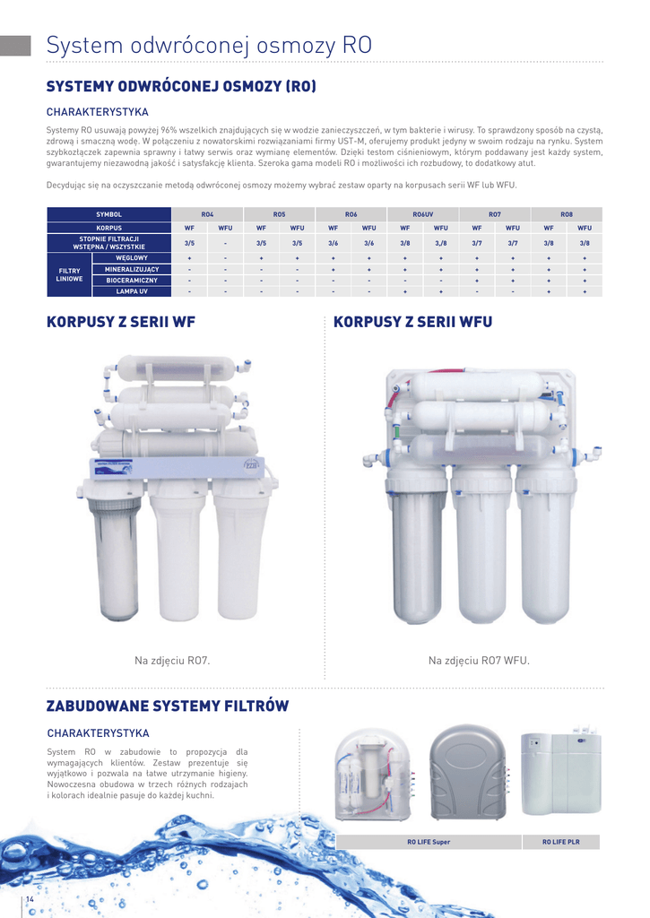 System odwróconej osmozy RO SYSTEMY ODWRÓCONEJ OSMOZY (RO) Charakterystyka Systemy RO usuwają powyżej 96% wszelkich znajdujących się w wodzie zanieczyszczeń, w tym bakterie i wirusy. To sprawdzony sposób na czystą, zdrową i smaczną wodę. W połączeniu z nowatorskimi rozwiązaniami firmy UST-M, oferujemy produkt jedyny w swoim rodzaju na rynku. System szybkozłączek zapewnia sprawny i łatwy serwis oraz wymianę elementów. Dzięki testom ciśnieniowym, którym poddawany jest każdy system, gwarantujemy niezawodną jakość i satysfakcję klienta. Szeroka gama modeli RO i możliwości ich rozbudowy, to dodatkowy atut. Decydując się na oczyszczanie metodą odwróconej osmozy możemy wybrać zestaw oparty na korpusach serii WF lub WFU. symbol RO4 RO5 RO6 RO6UV RO7 RO8 KORPUS WF WFU WF WFU WF WFU WF WFU WF WFU WF WFU STOPNIE FILTRACJI WSTĘPNA / WSZYSTKIE FILTRY LINIOWE 3/5 - 3/5 3/5 3/6 3/6 3/8 3,/8 3/7 3/7 3/8 3/8 WĘGLOWY + - + + + + + + + + + + MINERALIZUJĄCY - - - - + + + + + + + + BIOCERAMICZNY - - - - - - - - + + + + LAMPA UV - - - - - - + + - - + + korpusY z serii WF Na zdjęciu RO7. korpusY z serii WFU Na zdjęciu RO7 WFU. Zabudowane systemy filtrów Charakterystyka System RO w zabudowie to propozycja dla wymagających klientów. Zestaw prezentuje się wyjątkowo i pozwala na łatwe utrzymanie higieny. Nowoczesna obudowa w trzech różnych rodzajach i kolorach idealnie pasuje do każdej kuchni. RO LIFE Super 14 RO LIFE PLR