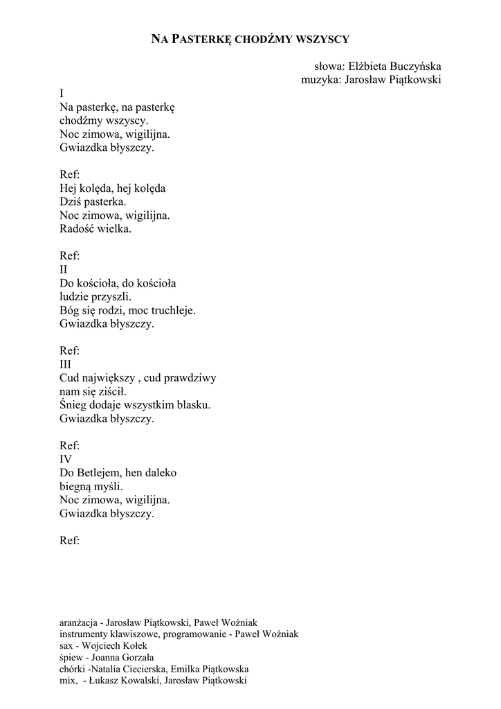 NA PASTERKĘ CHODŹMY WSZYSCY słowa: Elżbieta Buczyńska muzyka: Jarosław Piątkowski I Na pasterkę, na pasterkę chodźmy wszyscy. Noc zimowa, wigilijna. Gwiazdka błyszczy. Ref: Hej kolęda, hej kolęda Dziś pasterka. Noc zimowa, wigilijna. Radość wielka. Ref: II Do kościoła, do kościoła ludzie przyszli. Bóg się rodzi, moc truchleje. Gwiazdka błyszczy. Ref: III Cud największy , cud prawdziwy nam się ziścił. Śnieg dodaje wszystkim blasku. Gwiazdka błyszczy. Ref: IV Do Betlejem, hen daleko biegną myśli. Noc zimowa, wigilijna. Gwiazdka błyszczy. Ref: aranżacja - Jarosław Piątkowski, Paweł Woźniak instrumenty klawiszowe, programowanie - Paweł Woźniak sax - Wojciech Kołek śpiew - Joanna Gorzała chórki -Natalia Ciecierska, Emilka Piątkowska mix, - Łukasz Kowalski, Jarosław Piątkowski