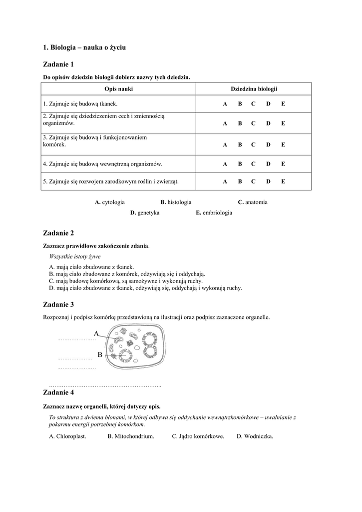 1. Biologia – nauka o życiu Zadanie 1 Do opisów dziedzin biologii dobierz nazwy tych dziedzin. Opis nauki Dziedzina biologii 1. Zajmuje się budową tkanek. A B C D E 2. Zajmuje się dziedziczeniem cech i zmiennością organizmów. A B C D E 3. Zajmuje się budową i funkcjonowaniem komórek. A B C D E 4. Zajmuje się budową wewnętrzną organizmów. A B C D E 5. Zajmuje się rozwojem zarodkowym roślin i zwierząt. A B C D E A. cytologia B. histologia D. genetyka C. anatomia E. embriologia Zadanie 2 Zaznacz prawidłowe zakończenie zdania. Wszystkie istoty żywe A. mają ciało zbudowane z tkanek. B. mają ciało zbudowane z komórek, odżywiają się i oddychają. C. mają budowę komórkową, są samożywne i wykonują ruchy. D. mają ciało zbudowane z tkanek, odżywiają się, oddychają i wykonują ruchy. Zadanie 3 Rozpoznaj i podpisz komórkę przedstawioną na ilustracji oraz podpisz zaznaczone organelle. A B …………………………………………………….. Zadanie 4 Zaznacz nazwę organelli, której dotyczy opis. To struktura z dwiema błonami, w której odbywa się oddychanie wewnątrzkomórkowe – uwalnianie z pokarmu energii potrzebnej komórkom. A. Chloroplast. B. Mitochondrium. C. Jądro komórkowe. D. Wodniczka. Zadanie 5 Uzupełnij tabelę, wpisując znak „+”, jeśli organella występuje w danej komórce, lub znak „–”, gdy jej brak. Komórka bakteryjna Komórka zwierzęca Wodniczka Mitochondrium Jądro komórkowe Ściana komórkowa Błona komórkowa Rybosomy Zadanie 6 Zaznacz punkt dotyczący zadań systematyki. A. Badanie budowy zewnętrznej i sposobów rozmnażania się organizmów. B. Szukanie pokrewieństwa między roślinami a zwierzętami. C. Nadawanie nazw oraz określanie środowisk życia organizmów jednokomórkowych. D. Opisywanie organizmów, nadawanie im nazw, podział organizmów na grupy oraz szukanie pokrewieństwa między nimi. Zadanie 7 Podane stwierdzenia dotyczą klasyfikacji organizmów. Oceń ich prawdziwość, zaznaczając literę P (zdanie prawdziwe) lub F (zdanie fałszywe). Podstawową jednostką klasyfikacji jest gatunek. Naturalny system klasyfikacji opiera się na podobieństwie budowy zewnętrznej organizmów. Wyróżniamy 4 królestwa organizmów: rośliny, zwierzęta, grzyby i bakterie. Królestwo jest mniejszą jednostką niż gatunek. P F P F P F P F Zadanie 8 Ponumeruj poniższe zdania, tak aby powstała instrukcja przygotowania prostego preparatu mikroskopowego. Umieść obiekt w kropli wody na szkiełku podstawowym. Przykryj preparat szkiełkiem nakrywkowym. Wypreparuj igłą preparacyjną i pęsetą obiekt, który chcesz obejrzeć pod mikroskopem. Zakraplaczem nanieś kroplę wody na środek szkiełka podstawowego. Zadanie 9 Określ rodzaj komórki przedstawionej na rysunku, a następnie wpisz w kwadraty litery odpowiadające funkcjom zaznaczonych na rysunku struktur komórki. A) Utrzymuje odpowiedni stan uwodnienia komórki; w płynie, który ją wypełnia, mogą znajdować się substancje zapasowe, barwniki i produkty przemiany materii. B) Zawiera kwasy nukleinowe; kieruje wszystkimi czynnościami życiowymi komórki. C) Otacza komórkę; jest zbudowana głównie z celulozy; nadaje sztywność komórkom, ochrania je przed parowaniem, przed czynnikami chorobotwórczymi i uszkodzeniami mechanicznymi. D) Zawiera zielony barwnik – chlorofil; jest miejscem przebiegu fotosyntezy. Jest to komórka .................................... . Zadanie 10 Poniżej wymieniono charakterystyczne cechy przedstawicieli pięciu królestw organizmów. Wpisz oznaczenia literowe tych cech w odpowiednie rubryki tabeli. UWAGA: Niektóre cechy mogą dotyczyć kilku królestw. Bezjądrowe Protisty Grzyby Rośliny Zwierzęta A) organizmy wielokomórkowe cudzożywne B) organizmy jednokomórkowe C) organizmy D) komórka z jądrem samożywne E) komórka bez jądra F) organizmy Zadanie 11 Na rysunkach przedstawiono przebieg doświadczenia, za pomocą którego sprawdzano, czy drożdże podczas fermentacji alkoholowej wydzielają dwutlenek węgla. Podaj numer zestawu, który był próbą badawczą. zestaw 1 Próbą badawczą był zestaw zestaw 2 ................................ .