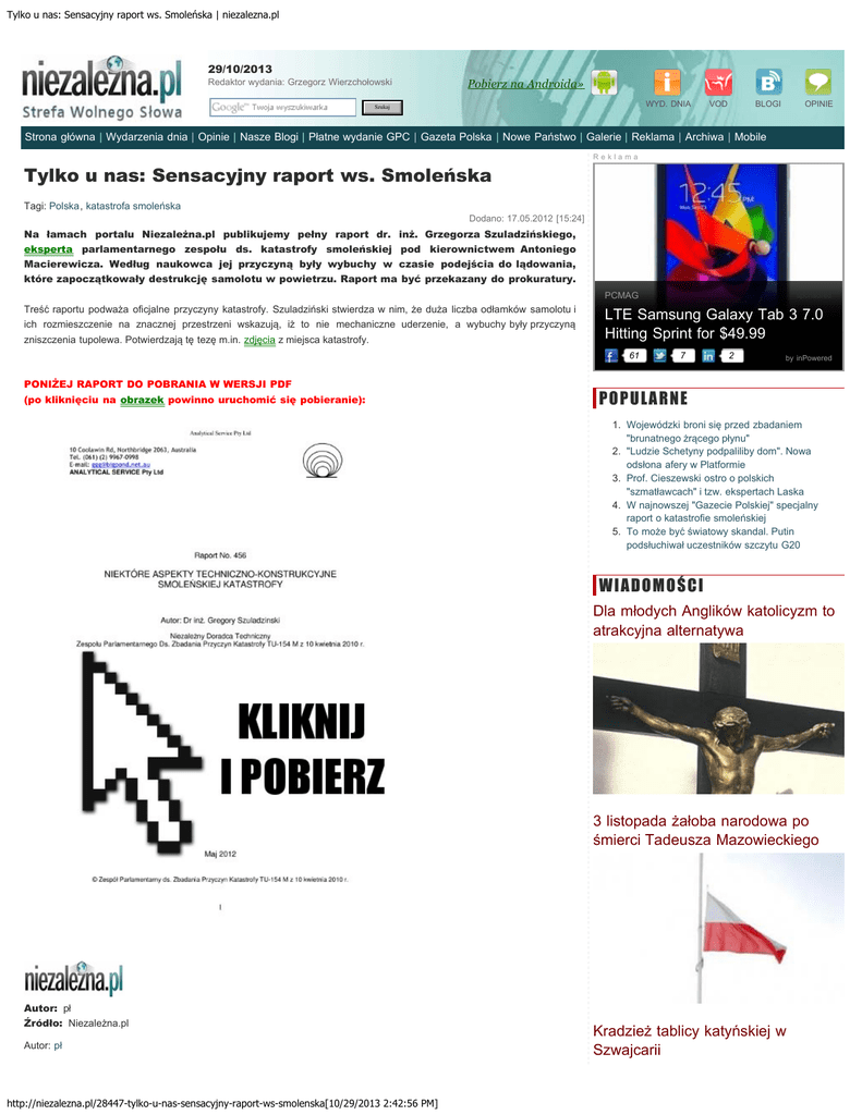 Tylko u nas: Sensacyjny raport ws. Smoleńska | niezalezna.pl 29/10/2013 Redaktor wydania: Grzegorz Wierzchołowski Pobierz na Androida» WYD. DNIA Szukaj VOD BLOGI OPINIE Strona główna | Wydarzenia dnia | Opinie | Nasze Blogi | Płatne wydanie GPC | Gazeta Polska | Nowe Państwo | Galerie | Reklama | Archiwa | Mobile Reklama Tylko u nas: Sensacyjny raport ws. Smoleńska Tagi: Polska, katastrofa smoleńska Dodano: 17.05.2012 [15:24] Na łamach portalu Niezależna.pl publikujemy pełny raport dr. inż. Grzegorza Szuladzińskiego, eksperta parlamentarnego zespołu ds. katastrofy smoleńskiej pod kierownictwem Antoniego Macierewicza. Według naukowca jej przyczyną były wybuchy w czasie podejścia do lądowania, które zapoczątkowały destrukcję samolotu w powietrzu. Raport ma być przekazany do prokuratury. PCMAG Treść raportu podważa oficjalne przyczyny katastrofy. Szuladziński stwierdza w nim, że duża liczba odłamków samolotu i ich rozmieszczenie na znacznej przestrzeni wskazują, iż to nie mechaniczne uderzenie, a wybuchy były przyczyną zniszczenia tupolewa. Potwierdzają tę tezę m.in. zdjęcia z miejsca katastrofy. LTE Samsung Galaxy Tab 3 7.0 Hitting Sprint for $49.99 61 PONIŻEJ RAPORT DO POBRANIA W WERSJI PDF (po kliknięciu na obrazek powinno uruchomić się pobieranie): sponsored 7 2 by inPowered POPULARNE 1. Wojewódzki broni się przed zbadaniem "brunatnego żrącego płynu" 2. "Ludzie Schetyny podpaliliby dom". Nowa odsłona afery w Platformie 3. Prof. Cieszewski ostro o polskich "szmatławcach" i tzw. ekspertach Laska 4. W najnowszej "Gazecie Polskiej" specjalny raport o katastrofie smoleńskiej 5. To może być światowy skandal. Putin podsłuchiwał uczestników szczytu G20 W IADOM OŚC I Dla młodych Anglików katolicyzm to atrakcyjna alternatywa 3 listopada żałoba narodowa po śmierci Tadeusza Mazowieckiego Autor: pł Źródło: Niezależna.pl Autor: pł http://niezalezna.pl/28447-tylko-u-nas-sensacyjny-raport-ws-smolenska[10/29/2013 2:42:56 PM] Kradzież tablicy katyńskiej w Szwajcarii Tylko u nas: Sensacyjny raport ws. Smoleńska | niezalezna.pl Lubię to! Lubię to! WyślijWyślij Nie lubię Lubię to! WyślijWyślij 12 Udostępnij 12 Tweetnij wykop Ty i 701 inne osoby to lubicie.Liczba osób, które to lubią: 701. Zarejestruj się, aby 8 47 Dodaj swoją opinię (106) DRUKUJ Reklama NASZEBLOGI.PL Quanta Cloud Server 29 października 1611 - HOŁD RUSKI www.QuantaQCT.com 11-11-2013 – Kraków jak w judo: uchylić się, aby zwyciężyć Quanta's Intel® Xeon® server, storage&switch for cloud datacenter Mazowiecki-ostatni premier PRL, czy pierwszy premier III RP? "Żołnierze Niepodległości" - w czwartek KONKURS! Nowa jakość partii Jarosława Kaczyńskiego Aaaaaaby głosy kupić tanio… Odpiełpapieł się od pana płemieła ! Krew na bruku Warszawy Sojusz sępa z hieną POLECAMY 29-10-2013 Protasiewicz za poparcie obiecał załatwić pracę w burdelu ? 29-10-2013 W najnowszej "Gazecie Polskiej" specjalny raport o katastrofie smoleńskiej 28-10-2013 Sytuacja demograficzna w Polsce jest dramatyczna Reklama 27-10-2013 Kopacz nie odważyła się. Zespół A. Macierewicza będzie dalej pracował 27-10-2013 Sikorski o "rosyjskiej winie" ws. Smoleńska. Za co odpowiada Moskwa? Publikujemy listę 27-10-2013 „Chcemy zupełnie innej Polski, z której rzeczywiście będziemy mogli być dumni” Prof. Gliński: Refleksja nad kondycją Polski po II Konferencji Smoleńskiej OPINIE Reklama http://niezalezna.pl/28447-tylko-u-nas-sensacyjny-raport-ws-smolenska[10/29/2013 2:42:56 PM] Radiowa Jedynka, czyli „dzień kundelka” Październiki Decydujące starcie Przyczynek do oceny politycznej Tylko u nas: Sensacyjny raport ws. Smoleńska | niezalezna.pl Opinie użytkowników Forum jest miejscem wymiany opinii użytkowników, myśli, informacji, komentarzy, nawiązywania kontaktów i rodzenia się inicjatyw. Dlatego eliminowane będą wszelkie wpisy wielokrotne, zawierające wulgarne słowa i wyrażenia, groźby karalne, obrzucanie się obelgami, obrażanie forumowiczów, członków redakcji i innych osób. Bezwzględnie będziemy zwalczali trollowanie, wszczynanie awantur i prowokowanie. Jeśli czyjaś opinia nie została dopuszczona, to znaczy, że zaliczona została do jednej z wymienionych kategorii. Uwagi i reklamacje kierowane do nas należy kierować na adres: straznik(at)niezalezna.pl Jednocześnie podkreślamy, iż rozumiemy, że nasze środowisko chce mieć miejsce odreagowywania wielu lat poniżania i ciągłej nagonki na nas przez obóz "miłości", ale nie upoważnia to do stosowania wulgarnego języka. Dopuszczalna jest natomiast nawet najostrzejsza krytyka, ale bez wycieczek osobistych. Komunikaty ukazujące się na blogu Morusa są rozwinięciem niniejszego regulaminu. rycerz111 () 17/05/2012 - 19:51. KRUCJATA RÓŻAŃCOWA ZA OJCZYZNĘ ! Módl się za POLSKĘ !!! www.krucjatarozancowazaojczyzne.pl odpowiedz Lori () 17/05/2012 - 19:40. Raport ciekawy lecz wątpliwości pozostają. Mówią nam i każą wierzyć że nic się nie stało, bo to „Polska właśnie”. Historia smoleńska, o czym należy przypominać bez ustanku, zaczyna się w Polsce przed świtem 10 Kwietnia, a nie na Siewiernym w „godzinie Batera”. W Polsce, powtarzam. To na Okęciu zapanował „blackout”, to z warszawskiego lotniska nie ma do dziś żadnych wiarygodnych, miarodajnych, poważnych materiałów pozwalających zrekonstruować dokładny przebieg tamtejszych wydarzeń: jak dokonywano roszad z pasażerami, kto czym dyrygował, jakie samoloty odleciały – w jakiej kolejności i ilości oraz z kim na pokładach. To na Okęciu zatem trzeba by przeprowadzić poważne dochodzenie. Już zresztą podczas prac „komisji Millera” ukazały się „dziwy” okęckie, w postaci fałszowanej dokumentacji 36 splt, różnych sprzeczności ws. samolotów zapasowych dla delegacji prezydenckiej czy choćby „gumowej salonki 3”, o której głośno było w blogosferze, salonk