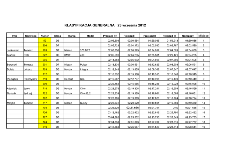 KLASYFIKACJA GENERALNA 23 września 2012 Imię Nazwisko Marka Model Przejazd TR Przejazd I Przejazd II Przejazd III Najlepszy Miejsce Numer Klasa 59 D6 02:06,303 02:00,554 01:59,086 01:59,913 01:59,086 1 906 D7 02:05,723 02:04,172 02:02,580 02:02,767 02:02,580 2 Jankowski Tomasz 999 D7 Nissan 370 BRT 02:08,850 02:06,325 02:24,932 02:04,089 02:04,089 3 Iwański Piotr 822 D6 BMW e39 02:06,591 02:04,235 02:35,501 02:29,421 02:04,235 4 905 D7 02:11,368 02:05,972 02:04,606 02:07,666 02:04,606 5 Boroński Tomasz 901 D7 Nissan Pulsar 02:13,830 02:06,591 02:12,629 02:08,908 02:06,591 6 Dolata Łukasz 703 D5 Honda Integra 02:18,348 02:13,855 02:09,362 02:07,647 02:07,647 7 712 D5 02:16,332 02:15,110 02:10,315 02:10,840 02:10,315 8 710 D5 02:19,287 02:12,797 02:10,995 02:10,449 02:10,449 9 500 D5 02:22,452 02:15,565 02:15,235 02:15,028 02:15,028 10 PieniąŜek Przemysław Renault Clio Adamiak Jarek 714 D5 Honda Civic 02:23,578 02:19,308 02:17,241 02:16,559 02:16,559 11 Musialik Jędrzej 722 D5 Honda Civic EJ2 02:23,339 02:19,169 02:16,661 02:18,068 02:16,661 12 702 D5 02:26,195 02:19,369 02:17,820 02:16,724 02:16,724 13 717 D5 02:25,631 02:20,529 02:19,591 02:19,350 02:19,350 14 704 D5 02:26,629 02:21,666 02:21,791 DNS 02:21,666 15 726 D5 03:12,162 02:22,432 02:22,616 02:25,780 02:22,432 16 727 D5 03:04,882 02:25,532 02:23,733 02:26,649 02:23,733 17 724 D5 02:31,633 02:31,073 02:27,767 02:28,015 02:27,767 18 810 D6 02:48,568 02:36,967 02:34,527 02:28,614 02:28,614 19 Matyka Tomasz Nissan Sunny