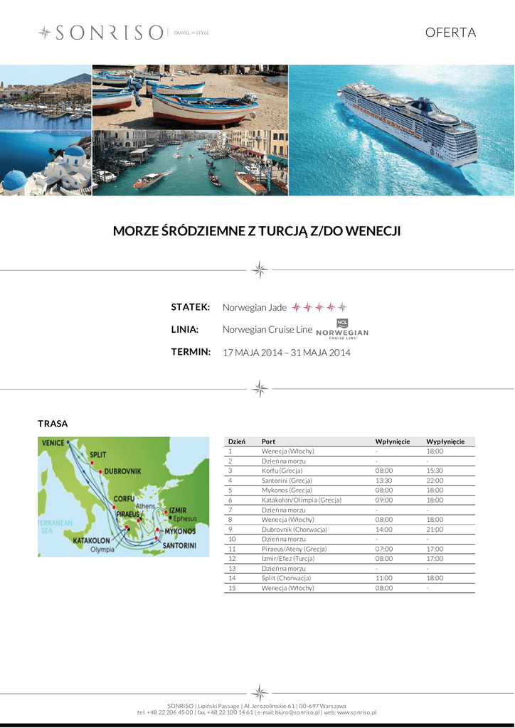 OFERTA MORZE ŚRÓDZIEMNE Z TURCJĄ Z/DO WENECJI STATEK: Norwegian Jade LINIA: Norwegian Cruise Line TERMIN: 17 MAJA 2014 – 31 MAJA 2014 TRASA Dzień 1 2 3 4 5 6 7 8 9 10 11 12 13 14 15 Port Wenecja (Włochy) Dzień na morzu Korfu (Grecja) Santorini (Grecja) Mykonos (Grecja) Katakolon/Olimpia (Grecja) Dzień na morzu Wenecja (Włochy) Dubrovnik (Chorwacja) Dzień na morzu Piraeus/Ateny (Grecja) Izmir/Efez (Turcja) Dzień na morzu Split (Chorwacja) Wenecja (Włochy) Wpłynięcie 08:00 13:30 08:00 09:00 08:00 14:00 07:00 08:00 11:00 08:00 SONRISO | Lipiński Passage | Al. Jero zo limskie 61 | 00-697 Warszawa tel. +48 22 206 45 00 | fax. +48 22 100 14 61 | e-mail: biuro @so nriso .pl | web: www.so nriso .pl Wypłynięcie 18:00 15:30 22:00 18:00 18:00 18:00 21:00 17:00 17:00 18:00 - OFERTA CENA Typ kabiny Cena z osobę Kabina wewnętrzna od 1 209 EUR Kabina z oknem od 1 429 EUR Kabina z balkonem od 2 159 EUR Mini Suite od 2 329 EUR Penthouse od 3 359 EUR CENA ZAWIERA DOTATKOWE OPŁATY zakwaterowanie w 2 - os. kabinie wybranej kategorii pełne wyżywienie: 3 posiłki, przekąski między posiłakmi, bufet o północy napoje do posiłków: woda stołowa, kawa, herbata oraz sok do śniadania serwis bagażowy podczas wejścia i zejścia ze statku 24 godzinny serwis kabinowy korzystanie z urządzeń sportowo - rekreacyjnych dostępnych na pokładzie (baseny, jacuzzi, boiska sportowe, kluby dla dzieci i młodzieży itp.) udział we wszystkich imprezach organizowanych na pokładzie (przedstawienia, pokazy, aukcje, animacje i inne) obowiązkowe opłaty portowe dojazd/przelot do portu rozpoczęcia i zakończenia rejsu transfery (lotnisko - port - lotnisko) ewentualne noclegi przed lub po rejsie wycieczki fakultatywne napoje: bezalkoholowe, alkoholowe, woda mineralna dostępne w restauracjach i barach (istnieje możliwość wykupienia pakietów napojów, o szczegóły zapytaj w biurze) korzystanie z mini baru w kabinie korzystanie z usług typu: SPA, salon piękności, pralnia itp. wydatki osobiste tj. zakupy w butikach, internet, kasyno itp. obowiązkowa opłata serwisowa (napiwki dla obsługi statku ok. 12 USD/os. dorosła/dzień, dzieci poniżej 3 lat nie płacą) obowiązkowe ubezpieczenie turystyczne koszt wymaganych wiz ewentualna opłata paliwowa (linia w momencie wzrotu cen ropy zastrzega sobie prawo do dodania oplaty paliwowej do każdej rezerwacji) Na życzenie świadczymy dodatkowo usługi: rezerwacje hotelowe na całym świecie rezerwacje biletów lotniczych, trasferów oraz parkingu w porcie rezerwacje wycieczek fakultatywnych i innych atrakcji SONRISO | Lipiński Passage | Al. Jero zo limskie 61 | 00-697 Warszawa tel. +48 22 206 45 00 | fax. +48 22 100 14 61 | e-mail: biuro @so nriso .pl | web: www.so nriso .pl