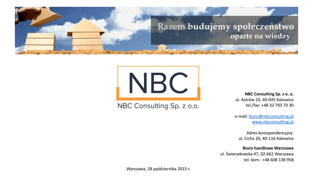 NBC Consulting Sp. z o. o. ul. Astrów 10, 40-045 Katowice tel./fax: +48 32 793 70 30 e-mail: [email protected] www.nbcconsulting.pl Adres korespondencyjny: ul. Cicha 20, 40-116 Katowice Biuro handlowe Warszawa ul. Świeradowska 47, 02-662 Warszawa tel. kom.: +48 608 138 958 Warszawa, 28 października 2015 r. O nas Firma NBC Consulting Sp. z o. o. (dawniej Nizielski & Borys Consulting) powstała w 2004 r. Oferujemy profesjonalne usługi konsultingowe związane z pozyskaniem dotacji i zarządzaniem projektami współfinansowanymi z UE oraz szeroko rozumianym doradztwem strategicznym i biznesowym. Nasze atuty wieloletnie doświadczenie kompetentny zespół ekspertów realizacja projektów niestandardowych, o wielomilionowych budżetach wysoki współczynnik sukcesu Kogo obsługujemy Jednostki samorządu terytorialnego Szpitale i podmioty wykonujące działalność leczniczą Organizacje pozarządowe Jednostki naukowobadawcze, Uczelnie, Szkoły Wyższe Jednostki administracji rządowej MŚP Organizacje turystyczne Państwowe i samorządowe instytucje kultury Nasza oferta Dokumenty strategiczne Dotacje unijne Zarządzanie Projektem Wsparcie w pozyskaniu środków z UE na realizację projektu Opracowanie dokumentów strategicznych / programowych lub koncepcji realizacji projektu Przygotowanie dokumentacji niezbędnej do ubiegania się o dotację o wniosku o dofinansowanie, o Studium Wykonalności projektu, o analizy ekonomiczno – finansowej, o dokumentacji technicznej, o innych wymaganych załączników do wniosku o dofinansowanie Doradztwo, opieka merytoryczna i pełne wparcie aż do momentu podpisania umowy o dofinansowanie projektu Zarządzanie projektem dofinansowanym z UE Kompleksowe doradztwo podczas realizacji dotowanego projektu Rozliczenie finansowe projektu i sprawozdawczość Świadczenie usług eksperckich z zakresu przygotowania i przeprowadzenia postępowania o udzielenie zamówienia publicznego Pomoc podczas kontroli projektów współfinansowanych ze środków Unii Europejskiej Przygotowanie dokumentacji na potrzeby Notyfikacji pomocy publicznej projektów w Komisji Europejskiej Nasze doświadczenie, wybrane realizacje • Obsługa wyboru Operatora Infrastruktury w formule partnerstwa publiczno-prywatnego w projekcie pn. „Śląska Regionalna Sieć Szkieletowa” poprzez świadczenie usług doradczych (w zakresie prawno-organizacyjnym, finansowo-ekonomicznym i technicznym). • Opracowanie kompletnej dokumentacji projektowej wraz z załącznikami do projektu pn.: „Śląska Regionalna Sieć Szkieletowa” realizowanego w ramach Regionalnego Programu Operacyjnego Województwa Śląskiego na lata 2007-2013. Budżet projektu to ok. 70 000 000,00 zł. • „Studium Rozwoju Sieci Szerokopasmowych w województwie śląskim”. Opracowanie dokumentu oraz działania doradcze i konsultacyjne. • Opracowanie dokumentacji aplikacyjnej do projektu pn. „Dolnośląska Sieć Szkieletowa” w ramach Regionalnego Programu Operacyjnego Województwa Dolnośląskiego na lata 20072013, a także dokumentacji projektowej zawierającej program funkcjonalno-użytkowy, raport oddziaływania na środowisko oraz 3 warianty koncepcji. Budżet projektu to ok. 160 000 000,00 zł. Nasze doświadczenie, wybrane realizacje • Opracowanie szczegółowych studiów wykonalności i programów funkcjonalno-użytkowych dla każdego obszaru (19 zadań inwestycyjnych) objętego projektem pn. „Małopolska Sieć Szerokopasmowa" realizowanego w ramach Małopolskiego Regionalnego Programu Operacyjnego na lata 2007-2013. Budżet projektu to ok. 150 000 000,00 zł. • Opracowanie dla projektu pn. „Pomorska Sieć Szerokopasmowa” studium wykonalności, wniosku o dofinansowanie z EFRR w ramach Regionalnego Programu Operacyjnego Województwa Pomorskiego na lata 2007–2013 i dokumentacji przetargowej do przetargu na wykonanie dokumentacji technicznej. Budżet projektu to ok. 120 000 000,00 zł. • Opracowanie dokumentacji aplikacyjnej do projektu pn.: „Sieć Szerokopasmowa Polski Wschodniej” w ramach Programu Operacyjnego Rozwój Polski Wschodniej na lata 2007-2013. Budżet projektu to ok. 1 200 000 000,00 zł. Nasze doświadczenie, wybrane realizacje • Opracowanie dokumentacji aplikacyjnej i pozyskanie środków na realizację projektu pn. „Budowa nowoczesnej sieci światłowodowej na terenie Miasta Kutno" w ramach działania 8.4 Zapewnienie dostępu do Internetu na etapie "ostatniej mili" PROGRAMU OPERACYJNEGO INNOWACYJNA GOSPODARKA, oś Priorytetowa 8 Społeczeństwo Informacyjne - zwiększanie innowacyjności gospodarki. Usługa zrealizowana na rzecz MPC Paweł Oleksiewicz. Wysokość pozyskanych środków: 1 079 429,30 zł. • Opracowanie dokumentacji aplikacyjnej i pozyskanie środków na realizację projektu pn. „Budowa szerokopasmowej szkieletowej sieci światłowodowej w południowo-wschodniej części powiatu zgorzeleckiego" ramach Regionalnego Programu Operacyjnego Województwa Dolnośląskiego na lata 2007-2013, Priorytet II Rozwój społeczeństwa informacyjnego na Dolnym Śląsku („Społeczeństwo Informacyjne"), Działanie 2.1 „Infrastruktura Społeczeństwa Informacyjnego". Wysokość pozyskanych środków: 1 384 505,85 zł. Zakres współpracy przy projektach POPC Dz. 1.1 Zakres A Czynności wstępne B Studium Wykonalności (na podstawie dokumentacji technicznej klienta) C Wniosek o dofinansowanie Zakres szczegółowy czynności przygotowawcze - spotkania robocze wstępne z Beneficjentem czynności przygotowawcze - sprawdzenie profilu ePUAP Beneficjenta czynności przygotowawcze - pozyskanie dokumentacji projektu od klienta / fiszka projektu czynności przygotowawcze - sprawdzenie kwalifikowalności Beneficjenta (1) czynności przygotowawcze - sprawdzenie finansowania Projektu czynności przygotowawcze - sprawdzenie kwalifikowalności Projektu czynności przygotowawcze - sprawdzenie kwalifikowalności technicznej Projektu audyt posiadanej dokumentacji technicznej na zgodność z 