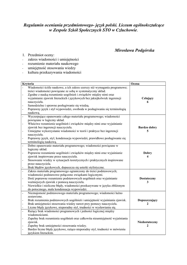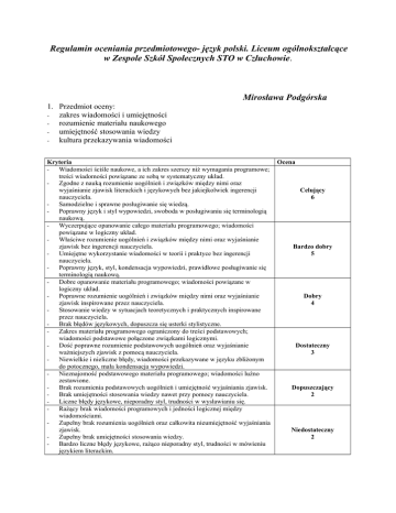 Regulamin oceniania przedmiotowego- język polski. Liceum ogólnokształcące w Zespole Szkół Społecznych STO w Człuchowie. Mirosława Podgórska 1. Przedmiot oceny: zakres wiadomości i umiejętności rozumienie materiału naukowego umiejętność stosowania wiedzy kultura przekazywania wiadomości Kryteria Wiadomości ściśle naukowe, a ich zakres szerszy niż wymagania programowe; treści wiadomości powiązane ze sobą w systematyczny układ. Zgodne z nauką rozumienie uogólnień i związków między nimi oraz wyjaśnianie zjawisk literackich i językowych bez jakiejkolwiek ingerencji nauczyciela. Samodzielne i sprawne posługiwanie się wiedzą. Poprawny język i styl wypowiedzi, swoboda w posługiwaniu się terminologią naukową. Wyczerpujące opanowanie całego materiału programowego; wiadomości powiązane w logiczny układ. Właściwe rozumienie uogólnień i związków między nimi oraz wyjaśnianie zjawisk bez ingerencji nauczyciela. Umiejętne wykorzystanie wiadomości w teorii i praktyce bez ingerencji nauczyciela. Poprawny język, styl, kondensacja wypowiedzi, prawidłowe posługiwanie się terminologią naukową. Dobre opanowanie materiału programowego; wiadomości powiązane w logiczny układ. Poprawne rozumienie uogólnień i związków między nimi oraz wyjaśnianie zjawisk inspirowane przez nauczyciela. Stosowanie wiedzy w sytuacjach teoretycznych i praktycznych inspirowane przez nauczyciela. Brak błędów językowych, dopuszcza się usterki stylistyczne. Zakres materiału programowego ograniczony do treści podstawowych; wiadomości podstawowe połączone związkami logicznymi. Dość poprawne rozumienie podstawowych uogólnień oraz wyjaśnianie ważniejszych zjawisk z pomocą nauczyciela. Niewielkie i nieliczne błędy, wiadomości przekazywane w języku zbliżonym do potocznego, mała kondensacja wypowiedzi. Nieznajomość podstawowego materiału programowego; wiadomości luźno zestawione. Brak rozumienia podstawowych uogólnień i umiejętność wyjaśniania zjawisk. Brak umiejętności stosowania wiedzy nawet przy pomocy nauczyciela. Liczne błędy językowe, nieporadny styl, trudności w wysławianiu się. Rażący brak wiadomości programowych i jedności logicznej między wiadomościami. Zupełny brak rozumienia uogólnień oraz całkowita nieumiejętność wyjaśniania zjawisk. Zupełny brak umiejętności stosowania wiedzy. Bardzo liczne błędy językowe, rażąco nieporadny styl, trudności w mówieniu językiem literackim. Ocena Celujący 6 Bardzo dobry 5 Dobry 4 Dostateczny 3 Dopuszczający 2 Niedostateczny 2 Analiza treści kształcenia w klasie pierwszej liceum ogólnokształcącego Poziom wymagań Konieczny - Podstawowy (+ konieczny) Rozszerzający (+ konieczny + podstawowy) Wiadomości i umiejętności Wymienić tytuły i autorów utworów literackich wskazanych w liście lektur; podać główne idee literatury starożytnej, średniowiecza, renesansu i baroku, oświecenia; podać definicje pojęć: mit, topos, motyw, antyk, Biblia, uniwersalizm, scholastyka, augustynizm, tomizm, franciszkanizm, humanizm, reformacja, kontrreformacja, klasycyzm, racjonalizm, empiryzm, sentymentalizm; wskazać ramy chronologiczne epok literackich; wykazać się znajomością definicji gatunków literackich; wymienić wzorce osobowe średniowiecza, renesansu, baroku, oświecenia; wskazać cechy osobowe tych wzorców; znać pojęcie komunikacji językowej i funkcji języka; zidentyfikować motywy mitologiczne i biblijne w tekście literackim; znać definicję zdań eliptycznych i rozwijających; wygłosić z pamięci tekst poetycki i fragment prozy; wskazać źródła form fonetycznych, fleksyjnych i słowotwórczych w historycznym rozwoju języka; odróżnić gatunki literackie średniowiecza, renesansu (z odwołaniami do antyku) oraz baroku, oswiecenia; umieć określić cechy poszczególnych gatunków; podjąć próbę napisania rozprawki; Uczeń dostateczny potrafi to co na ocenę dopuszczającą oraz: podać cechy utworów średniowiecznych, renesansowych i barokowych, oświeceniowych; nazwać dwa nurty w poezji baroku i scharakteryzować je; wygłosić z pamięci przemówienie; streścić fragmenty lektury podstawowej, wątki lektur; wyjaśnić definicję toposu, symbolu i alegorii, metafory, oksymoronu, inwersji, paradoksu, posługiwać się terminami teoretyczno-literackimi wskazać różne źródła kultury europejskiej; określić związki literatury renesansu z antykiem; wyjaśnić idee średniowieczne, renesansowe i barokowe, oświeceniowe; powiązać fakty literackie z wydarzeniami historycznymi; zilustrować przykładem motywy mitologiczne, biblijne i średniowieczne, renesansowe i barokowe, oświeceniowe; rozpoznać funkcje tekstu językowego; scharakteryzować źródła zjawisk fonetycznych, będących wynikiem procesów historycznych; scharakteryzować średniowieczne i renesansowe wzorce osobowe; określić wizje świata i człowieka w literaturze ww. epok, baroku i oświecenia; posługiwać się formami wypowiedzi jak: opis, rozprawka, przemówienie, streszczenie, opowiadanie, charakterystyka; Uczeń opanował wiadomości i umiejętności z poziomu wymagań koniecznych i podstawowych i ponadto: scharakteryzować antyk jako epokę kulturową; wykazać funkcjonowanie motywów antycznych i biblijnych w literaturze innych epok; scharakteryzować idee filozoficzne omawianych epok; powiązać fakty historyczne z nurtami filozoficznymi; Ocena Dopuszczający 2 Dostateczny 3 Dobry 4 porównywać rożne dziedziny sztuki; sklasyfikować i objaśnić funkcje środków stylistycznych charakterystycznych dla danej epoki; charakteryzować bohaterów literackich w kontekście epoki; dokonać ich oceny; analizować typowe dla epoki teksty ze wskazaniem dominanty interpretacyjnej; określić jednorodność motywów średniowiecza i baroku, motyw śmierci i vanitas; rozwiązywać problemy postawione w toku pracy nad lekturą; gromadzić, porządkować i wykorzy