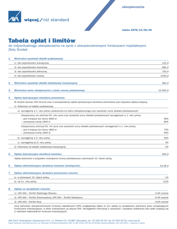 ubezpieczenia indeks ZSTR/14/05/05 Tabela opłat i limitów do indywidualnego ubezpieczenia na życie z ubezpieczeniowymi funduszami kapitałowymi Złoty Środek 1. Minimalna wysokość składki podstawowej 1) dla częstotliwości miesięcznej 120 zł 2) dla częstotliwości kwartalnej 360 zł 3) dla częstotliwości półrocznej 720 zł 4) dla częstotliwości rocznej 2. Minimalna wysokość składki dodatkowej inwestycyjnej 3. Minimalna suma ubezpieczenia z tytułu umowy podstawowej 4. Opłata dystrybucyjna określona procentowo 1440 zł 360 zł 10 000 zł W ramach serwisu AXA On-Line oraz w korespondencji opłata dystrybucyjna określona procentowo jest nazywana opłatą wstępną. 1) Pobierana od składki podstawowej a) wymagalnej w 1. roku polisy (uzależniona od wieku Ubezpieczonego oraz wysokości sumy składek podstawowych) Ubezpieczony nie ukończył 50. roku życia oraz wysokość sumy składek podstawowych wymagalnych w 1. roku polisy: – jest mniejsza lub równa 1800 zł – przewyższa kwotę 1800 zł 90% 80% Ubezpieczony ukończył 50. rok życia oraz wysokość sumy składek podstawowych wymagalnych w 1. roku polisy: – jest mniejsza lub równa 1800 zł – przewyższa kwotę 1800 zł b) wymagalnej w 2. roku polisy c) wymagalnej od 3. roku polisy 2) Pobierana od składki dodatkowej inwestycyjnej 5. Opłata dystrybucyjna określona kwotowo 70% 60% 50% 5% 5% 250 zł Opłata pobierana w przypadku rozwiązania umowy podstawowej w pierwszych 10. latach polisy. 6. Opłata administracyjna określona kwotowo (miesięcznie) 7. Opłata administracyjna określona procentowo (rocznie) a) w pierwszych 10. latach polisy b) od 11. roku polisy 8. 12,18 zł 1% 0,5% Opłata za zarządzanie (rocznie) 1) UFK AXA – Portfel Stabilnego Wzrostu 0,3% rocznie 2) UFK AXA – Portfel Zrównoważony, UFK AXA – Portfel Selektywny 0,4% rocznie 3) UFK AXA – Portfel Akcji 0,5% rocznie Ceny jednostek ubezpieczeniowych funduszy kapitałowych (UFK) uwzględniają opłaty (w tym opłatę za zarządzanie) pobierane przez zarządzających funduszami inwestycyjnymi, w które inwestowane są aktywa UFK. Szczegółowe informacje o wysokości i zasadach pobierania tych opłat znajdują się w statutach odpowiednich funduszy inwestycyjnych. AXA Życie Towarzystwo Ubezpieczeń S.A., ul. Chłodna 51, 00-867 Warszawa, tel. 22 555 00 00, fax 22 555 00 52, www.axa.pl Organ rejestrowy: Sąd Rejonowy dla m.st. Warszawy, XII Wydział Gospodarczy KRS, Nr KRS 41216, NIP 521-10-36-859, Kapitał zakładowy: 444 440 000 zł – wpłacony w całości 9. Opłata transakcyjna z tytułu zapisania jednostek uczestnictwa funduszu zagranicznego 0,15% 10. Opłata transakcyjna określona kwotowo 1) za konwersję a) dokonywaną za pośrednictwem serwisu AXA On-Line bezpłatnie b) dokonywaną na wniosek Ubezpieczającego złożony w inny sposób – 4 pierwsze konwersje w każdym roku polisy – każda kolejna konwersja bezpłatnie 20 zł 2) za zmianę alokacji a) dokonywaną za pośrednictwem serwisu AXA On-Line bezpłatnie b) dokonywaną na wniosek Ubezpieczającego złożony w inny sposób – 4 pierwsze konwersje w każdym roku polisy – każda kolejna zmiana bezpłatnie 20 zł 3) za każdą zmianę wysokości składki podstawowej lub sumy ubezpieczenia z tytułu umowy podstawowej 20 zł 4) za każdą zmianę częstotliwości opłacania składki podstawowej 20 zł 5) za każdą częściową wypłatę wartości podstawowej polisy 20 zł 6) za częściową wypłatę wartości dodatkowej polisy a) pierwszą w każdym roku polisy bezpłatnie b) każdą kolejną 20 zł 7) za każdą częściową wypłatę wartości dodatkowej polisy w okresie zawieszenia opłacania składki podstawowej 40 zł 11. Miesięczna opłata za ryzyko ubezpieczeniowe Standardową wysokość miesięcznej opłaty za ryzyko za każde 10 000 zł kwoty na ryzyku* pokazuje poniższa tabela. Wiek Ubezpieczonego w latach 13 14 15 16 17 18 19 20 21 22 23 24 25 26 27 28 29 30 31 32 33 34 35 36 37 38 39 40 41 42 Opłata za ryzyko w zł 0,13 0,18 0,25 0,34 0,45 0,55 0,62 0,66 0,67 0,67 0,69 0,71 0,73 0,74 0,74 0,76 0,78 0,82 0,87 0,94 1,02 1,12 1,23 1,35 1,49 1,65 1,81 2,00 2,21 2,43 Wiek Ubezpieczonego w latach 43 44 45 46 47 48 49 50 51 52 53 54 55 56 57 58 59 60 61 62 63 64 65 66 67 68 69 70 71 72 Opłata za ryzyko w zł 2,69 2,98 3,31 3,68 4,09 4,53 5,02 5,55 6,11 6,70 7,34 8,01 8,72 9,48 10,28 11,14 12,05 13,01 14,01 15,06 16,14 17,27 18,46 19,70 21,03 22,47 24,04 25,79 27,75 29,97 Wiek Ubezpieczonego w latach 73 74 75 76 77 78 79 80 81 82 83 84 85 86 87 88 89 90 91 92 93 94 95 96 97 98 99 od 100 Opłata za ryzyko w zł 32,48 35,33 38,56 42,18 46,24 50,75 55,72 61,16 67,07 73,47 80,37 87,77 95,71 104,22 113,33 123,07 133,51 144,60 156,55 169,21 182,58 196,67 211,46 226,95 243,13 259,97 277,43 295,50 * Kwota na ryzyku jest różnicą pomiędzy aktualną sumą ubezpieczenia z tytułu umowy podstawowej a aktualną wartością podstawową polisy. Powyższa opłata może być powiększona o dodatkowe narzuty w wyniku oceny ryzyka dokonanej m.in. na podstawie wniosku i dokumentacji medycznej złożonych przez Ubezpieczającego. Informacja o ewentualnych narzutach jest przekazywana indywidualnie Ubezpieczającemu. 2 12. Pozostałe informacje Wysokość powyższych opłat może ulec zmianie zgodnie z Ogólnymi warunkami indywidualnego ubezpieczenia na życie z ubezpieczeniowymi funduszami kapitałowymi Złoty Środek. Aktualna wysokość powyższych opłat po ich zmianie będzie publikowana na stronie internetowej Towarzystwa oraz będzie dostępna w siedzibie Towarzystwa. Prezes Zarządu Członek Zarządu Jarosław Bartkiewicz Janusz Arczewski 3940414 Niniejsza Tabela opłat i limitów została zatwierdzona uchwałą Zarządu nr 1/25/04/2014 z dnia 25 kwietnia 2014 r. i ma zastosowanie do umów zawartych od dnia 5 maja 2014 r. 3