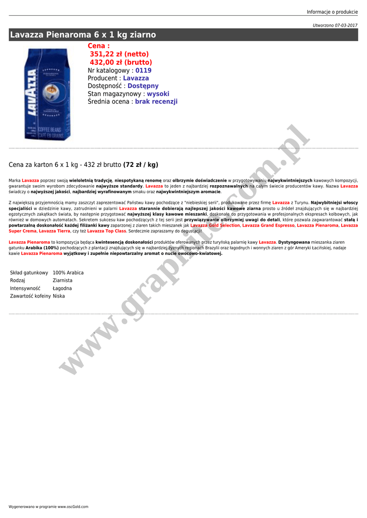 Informacje o produkcie Utworzono 07-03-2017 Lavazza Pienaroma 6 x 1 kg ziarno Cena : 351,22 zł (netto) 432,00 zł (brutto) .p l Nr katalogowy : 0119 Producent : Lavazza Dostępność : Dostępny Stan magazynowy : wysoki Średnia ocena : brak recenzji m Cena za karton 6 x 1 kg - 432 zł brutto (72 zł / kg) e. co Marka Lavazza poprzez swoją wieloletnią tradycję, niespotykaną renomę oraz olbrzymie doświadczenie w przygotowywaniu najwykwintniejszych kawowych kompozycji, gwarantuje swoim wyrobom zdecydowanie najwyższe standardy. Lavazza to jeden z najbardziej rozpoznawalnych na całym świecie producentów kawy. Nazwa Lavazza świadczy o najwyższej jakości, najbardziej wyrafinowanym smaku oraz najwykwintniejszym aromacie. it Z największą przyjemnością mamy zaszczyt zaprezentować Państwu kawy pochodzące z "niebieskiej serii", produkowane przez firmę Lavazza z Turynu. Najwybitniejsi włoscy specjaliści w dziedzinie kawy, zatrudnieni w palarni Lavazza starannie dobierają najlepszej jakości kawowe ziarna prosto u źródeł znajdujących się w najbardziej egzotycznych zakątkach świata, by następnie przygotować najwyższej klasy kawowe mieszanki, doskonałe do przygotowania w profesjonalnych ekspresach kolbowych, jak również w domowych automatach. Sekretem sukcesu kaw pochodzących z tej serii jest przywiązywanie olbrzymiej uwagi do detali, które pozwala zagwarantować stałą i powtarzalną doskonałość każdej filiżanki kawy zaparzonej z ziaren takich mieszanek jak Lavazza Gold Selection, Lavazza Grand Espresso, Lavazza Pienaroma, Lavazza Super Crema, Lavazza Tierra, czy też Lavazza Top Class. Serdecznie zapraszamy do degustacji! ph Lavazza Pienaroma to kompozycja będąca kwintesencją doskonałości produktów oferowanych przez turyńską palarnię kawy Lavazza. Dystyngowana mieszanka ziaren gatunku Arabika (100%) pochodzących z plantacji znajdujących się w najbardziej żyznych regionach Brazylii oraz łagodnych i wonnych ziaren z gór Ameryki Łacińskiej, nadaje kawie Lavazza Pienaroma wyjątkowy i zupełnie niepowtarzalny aromat o nucie owocowo-kwiatowej. Rodzaj Ziarnista Intensywność Łagodna .g ra Skład gatunkowy 100% Arabica w w w Zawartość kofeiny Niska Wygenerowano w programie www.oscGold.com