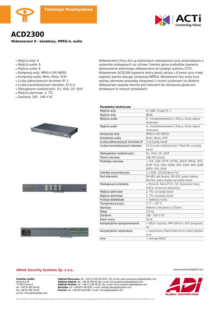 ACD2300 Wideoserwer 8 - kanałowy, MPEG-4, audio ● ● ● ● ● ● ● ● ● ● Wejścia wizji: 8 Wejścia audio: 8 Wyjścia audio: 8 Kompresja wizji: MPEG-4 SP/ MJPEG Kompresja audio: 8kHz, Mono, PCM Liczba jednoczesnych strumieni IP: 2 Liczba transmitowanych obrazów: 25 kl./s Obsługiwane rozdzielczości: D1, VGA, CIF, QCIF Wejścia alarmowe: 2, TTL Zasilanie: 100 - 240 V AC Wideoserwery firmy Acti są doskonałym rozwiązaniem przy przechodzeniu z systemów analogowych na cyfrowe. Szeroka gama produktów zapewnia dostosowanie właściwego wideoserwera do każdego systemu CCTV. Wideoserwer ACD2300 zapewnia dobrą jakość obrazu z 8 kamer przy małej zajętości pasma stosując kompresję MPEG4. Wbudowane tory audio oraz wej/wyj alarmowe pozwalają integrować z innymi systemami na obiekcie. Wideoserwer posiada również port telemetrii do sterowania głowicami obrotowymi w różnych protokołach. Parametry techniczne Wejścia wizji Wyjście wizji Wejścia audio Wyjścia audio Kompresja wizji Kompresja audio Liczba jednoczesnych strumieni IP Liczba transmitowanych obrazów Obsługiwane rozdzielczości Pasmo sieciowe Protokoły sieciowe Interfejs komunikacyjny Port telemetrii Obsługiwane protokoły Wejścia alarmowe Wyjścia alarmowe Funkcje dodatkowe Temperatura pracy Wymiary Waga Zasilanie Pobór mocy Kompatybilne oprogramowanie Kompatybilne rejestratory Inne 8 x BNC (1Vpp/75Ω) BRAK 8 , (niezbalansowane 1,4Vp-p, 1Vms złącze skręcane) 8 , (niezbalansowane 1,4Vp-p, 1Vms złącze skręcane) MPEG-4 SP/ MJPEG 8kHz, Mono, PCM 2 na każdy kanał 25 kl./s dla rozdzielczości 720x576 na każdy kanał D1, VGA, CIF, QCIF 28K-3M bitów/s + TCP, UDP, HTTP, HTTPS, DHCP, PPPoE, RTP, RTSP, IPv6, DNS, DDNS, NTP, ICMP, ARP, IGMP, SMTP, FTP, UPnP 1 x RJ45, 10/100 Base-Tx1 RS-485: pół duplex, RS-422: pełny duplex, RS-232: pełny duplex na każdy kanał + Pelco-D, Pelco-P V1 i V2, Dynacolor,Sony VISCA, American Dynamics 2, TTL na każdy kanał 2, TTL na każdy kanał + detekcja ruchu 0 °C ~ 50 °C 444mm x 44,5mm x 272mm 3,9 kg 100 - 240 V AC 50 W + IE6,0 i wyższy, APP-200-xx ( ACTi program), itd + rejestratory MatriVideo firmy Instek Digital i inne + montaż RACK Ultrak Security Systems Sp. z o.o. Siedziba spółki: Santocka 39 71-083 Szczecin tel. +48 91 485 40 60 fax +48 91 485 40 80 e-mail: [email protected] Oddział Warszawa: tel. +48 22 519-76-53/57..58, e-mail: [email protected] Oddział Gdańsk: tel. +48 58 785-62-94, e-mail: [email protected] Oddział Kraków: tel: +48 12 290-10-81..82, e-mail: [email protected] Wrocław: tel: +48 607-445-836, e-mail: [email protected] Poznań: tel: +48 607-445-640, e-mail: [email protected] Data modyfikacji: 26.11.2016. Zastrzegamy sobie prawo zmian danych technicznych bez uprzedniego powiadomienia. ADI jest marką handlową firmy Ultrak Security Systems Sp. z o.o. www.pl-eshop.adiglobal.com