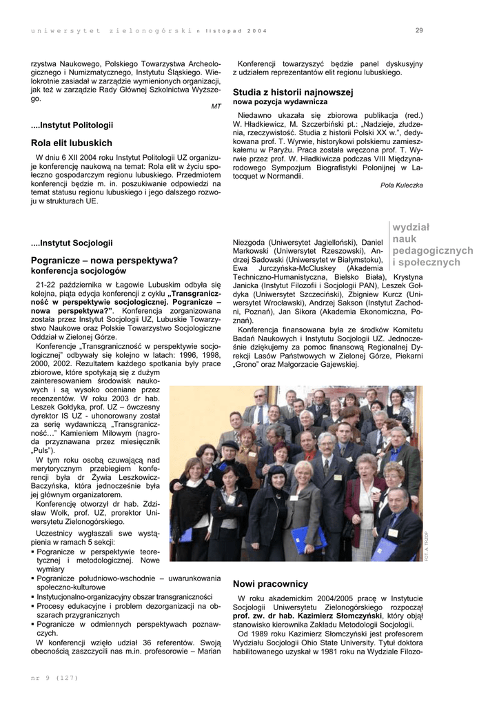 zielonogórski Q l i s t o p a d rzystwa Naukowego, Polskiego Towarzystwa Archeologicznego i Numizmatycznego, Instytutu Śląskiego. Wielokrotnie zasiadał w zarządzie wymienionych organizacji, jak też w zarządzie Rady Głównej Szkolnictwa Wyższego. MT ....Instytut Politologii Rola elit lubuskich W dniu 6 XII 2004 roku Instytut Politologii UZ organizuje konferencję naukową na temat: Rola elit w życiu społeczno gospodarczym regionu lubuskiego. Przedmiotem konferencji będzie m. in. poszukiwanie odpowiedzi na temat statusu regionu lubuskiego i jego dalszego rozwoju w strukturach UE. ....Instytut Socjologii Pogranicze – nowa perspektywa? konferencja socjologów 21-22 października w Łagowie Lubuskim odbyła się kolejna, piąta edycja konferencji z cyklu „Transgraniczność w perspektywie socjologicznej. Pogranicze – nowa perspektywa?”. Konferencja zorganizowana została przez Instytut Socjologii UZ, Lubuskie Towarzystwo Naukowe oraz Polskie Towarzystwo Socjologiczne Oddział w Zielonej Górze. Konferencje „Transgraniczność w perspektywie socjologicznej” odbywały się kolejno w latach: 1996, 1998, 2000, 2002. Rezultatem każdego spotkania były prace zbiorowe, które spotykają się z dużym zainteresowaniem środowisk naukowych i są wysoko oceniane przez recenzentów. W roku 2003 dr hab. Leszek Gołdyka, prof. UZ – ówczesny dyrektor IS UZ - uhonorowany został za serię wydawniczą „Transgraniczność…” Kamieniem Milowym (nagroda przyznawana przez miesięcznik „Puls”). W tym roku osobą czuwającą nad merytorycznym przebiegiem konferencji była dr Żywia LeszkowiczBaczyńska, która jednocześnie była jej głównym organizatorem. Konferencję otworzył dr hab. Zdzisław Wołk, prof. UZ, prorektor Uniwersytetu Zielonogórskiego. Uczestnicy wygłaszali swe wystąpienia w ramach 5 sekcji: Pogranicze w perspektywie teoretycznej i metodologicznej. Nowe wymiary Pogranicze południowo-wschodnie – uwarunkowania społeczno-kulturowe Instytucjonalno-organizacyjny obszar transgraniczności Procesy edukacyjne i problem dezorganizacji na obszarach przygranicznych Pogranicze w odmiennych perspektywach poznawczych. W konferencji wzięło udział 36 referentów. Swoją obecnością zaszczycili nas m.in. profesorowie – Marian nr 9 (127) 2 0 0 4 29 Konferencji towarzyszyć będzie panel dyskusyjny z udziałem reprezentantów elit regionu lubuskiego. Studia z historii najnowszej nowa pozycja wydawnicza Niedawno ukazała się zbiorowa publikacja (red.) W. Hładkiewicz, M. Szczerbiński pt.: „Nadzieje, złudzenia, rzeczywistość. Studia z historii Polski XX w.”, dedykowana prof. T. Wyrwie, historykowi polskiemu zamieszkałemu w Paryżu. Praca została wręczona prof. T. Wyrwie przez prof. W. Hładkiwicza podczas VIII Międzynarodowego Sympozjum Biografistyki Polonijnej w Latocquet w Normandii. Pola Kuleczka wydział nauk pedagogicznych i społecznych Niezgoda (Uniwersytet Jagielloński), Daniel Markowski (Uniwersytet Rzeszowski), Andrzej Sadowski (Uniwersytet w Białymstoku), Ewa Jurczyńska-McCluskey (Akademia Techniczno-Humanistyczna, Bielsko Biała), Krystyna Janicka (Instytut Filozofii i Socjologii PAN), Leszek Gołdyka (Uniwersytet Szczeciński), Zbigniew Kurcz (Uniwersytet Wrocławski), Andrzej Sakson (Instytut Zachodni, Poznań), Jan Sikora (Akademia Ekonomiczna, Poznań). Konferencja finansowana była ze środków Komitetu Badań Naukowych i Instytutu Socjologii UZ. Jednocześnie dziękujemy za pomoc finansową Regionalnej Dyrekcji Lasów Państwowych w Zielonej Górze, Piekarni „Grono” oraz Małgorzacie Gajewskiej. FOT. A. TRZOP uniwersytet Nowi pracownicy W roku akademickim 2004/2005 pracę w Instytucie Socjologii Uniwersytetu Zielonogórskiego rozpoczął prof. zw. dr hab. Kazimierz Słomczyński, który objął stanowisko kierownika Zakładu Metodologii Socjologii. Od 1989 roku Kazimierz Słomczyński jest profesorem Wydziału Socjologii Ohio State University. Tytuł doktora habilitowanego uzyskał w 1981 roku na Wydziale Filozo- 30 l i s t o p a d fii i Socjologii Uniwersytetu Warszawskiego. W 1995 roku przyznano mu tytuł profesora zwyczajnego. Zainteresowania naukowe Kazimierza Słomczyńskiego dotyczą przede wszystkim struktury społecznej, nierówności społecznych oraz ruchliwości społecznej. Kazimierz Słomczyński prowadzi badania dotyczące relacji pomiędzy strukturą społeczną a osobowością. Od 1992 roku jest kierownikiem Zespołu Porównawczych Analiz Nierówności Społecznych Instytutu Filozofii i Socjologii Polskiej Akademii Nauk. Kazimierz Słomczyński jest między innymi autorem książek Social Patterns of Being Political - The Initial Phase of the Post-Communist Transition in Poland (2000), Social Structure: Changes and Linkages - The Advanced Phase of the Post-Communist Transition in Poland (2002), oraz współautorem Mental Adjustment to the Post-Communist System in Poland (1999) (współautorstwo: Krystyna Janicka, Bogdan W. Mach, Kazimierz Słomczyński, Wojciech Zaborowski). W roku akademickim 2004/2005 stanowisko kierownika Zakładu Socjologii Zbiorowości Terytorialnych w Instytucie Socjologii Uniwersytetu Zielonogórskiego przyjął dr hab. Zbigniew Rykiel. Zbigniew Rykiel rozpoczął karierę naukową w Instytu- 2 0 0 4 Q uniwersytet zielonogórski cie Geografii Polskiej Akademii Nauk, z którym był związany przez wiele lat. W 1995 roku objął posadę kierownika Katedry Ekonomiki Zasobów, Ochrony Środowiska i Gospodarki Przestrzennej w Prywatnej Wyższej Szkole Businessu i Administracji w Warszawie. W 1996 został prodziekanem – wicedyrektorem Biura Koordynacji Toku Studiów tejże uczelni. W 1999 przyjął stanowisko kierownika Zakładu Geografii Społeczno-Ekonomicznej i Gospodarki Przestrzennej (Katedra Geografii) w Wyższej Szkole Pedagogicznej w Bydgoszczy. Do głównych zainteresowań badawczych Zbigniewa Rykla należą: badania aglomeracji miejskich, krajowych i regionalnych systemów osadniczyc