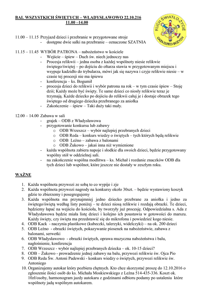 BAL WSZYSTKICH ŚWIĘTYCH – WŁADYSŁAWOWO 22.10.216 11.00 –14.00 11.00 – 11.15 Przyjazd dzieci i przebranie w przygotowane stroje - dostępne dwie salki na przebranie – oznaczone SZATNIA 11.15 – 11.45 WYBÓR PATRONA – nabożeństwo w kościele - Wejście – śpiew – Duch św. niech jednoczy nas - Procesja relikwii – jedna osoba z każdej wspólnoty niesie relikwie świętego/świętej – po dojściu do ołtarza stawia w przygotowanym miejscu i wsypuje kadzidło do trybularza, mówi jak się nazywa i czyje relikwie niesie – w czasie tej procesji nie ma śpiewu - konferencja – ks. Bogumił - procesja dzieci do relikwii i wybór patrona na rok – w tym czasie śpiew – Stoję dziś; Każdy może być święty. Te same dzieci co niosły relikwie teraz je trzymają. Każde dziecko po dojściu do relikwii całuj je i dostaje obrazek tego świętego od drugiego dziecka przebranego za aniołka - Zakończenie – śpiew – Taki duży taki mały. 12.00 – 14.00 Zabawa w sali - grajek – ODB z Władysławowa - przygotowanie konkursu lub zabawy o ODB Wrzeszcz – wybór najlepiej przebranych dzieci o ODB Reda – konkurs wiedzy o świętych – tych których będą relikwie o ODB Leźno – zabawa z balonami o ODB Żukowo – jakaś inna niż wymienione - każda wspólnota zabiera napoje i słodkie dla swoich dzieci, będzie przygotowany wspólny stół w oddzielnej sali. - na zakończenie wspólna modlitwa – ks. Michał i rozdanie znaczków ODB dla tych dzieci lub wspólnot, które jeszcze nie dostały w zeszłym roku. WAŻNE 1. Każda wspólnota przywozi ze sobą to co wypije i zje 2. Każda wspólnota przywozi nagrody na konkursy około 30szt. – będzie wystawiony koszyk gdzie to zbierzemy i posegregujemy 3. Każda wspólnota ma przynajmniej jedno dziecko przebrane za aniołka i jedno za świętego/świętą według listy poniżej – te dzieci niosą relikwie i rozdają obrazki. Te dzieci, będziemy łapać na wejściu do kościoła, by tworzyły już procesję. Odpowiedzialna s. Ada z Władysławowa będzie miała listę dzieci i kolejno ich poustawia w gotowości do marszu. Każdy święty, czy święta ma przedstawić się do mikrofonu i powiedzieć kogo niesie. 4. ODB Kack - naczynia plastikowe (kubeczki, talerzyki, widelczyki) – na ok. 200 dzieci 5. ODB Leźno - obrazki świętych, pokazywanie piosenek na nabożeństwie, zabawa z balonami, serwetki 6. ODB Władysławowo - obrazki świętych, oprawa muzyczna nabożeństwa i balu, nagłośnienie, konferencja 7. ODB Wrzeszcz - wybór najlepiej przebranych dziecka – ok. 10-15 dzieci? 8. ODB – Żukowo - prowadzenie jednej zabawy na balu, przywozi relikwie św. Ojca Pio 9. ODB Reda Św. Antoni Padewski - konkurs wiedzy o świętych, przywozi relikwie św. Antoniego 10. Organizujemy autokar który pozbiera chętnych. Kto chce skorzystać proszę do 12.10.2016 o zgłoszenie ilości osób do ks. Michała Moskiewskiego z Leźna 514-435-336. Koszt ok. 10zł/osoby, harmonogram jazdy autokaru z godzinami odbioru podamy po ustaleniu które wspólnoty jadą wspólnym autokarem. Procesja reliwkie świętych według kolejności Św. Faustyna + aniołek Bł. Karolina Kózkówka + aniołek Św. Teresa z Kalkuty + aniołek Św. Wojciech + aniołek Św. Michał Archanioł + aniołek 6. Św. Jerzy Popiełuszko + aniołek 7. Św. Dzieci z Fatimy + aniołek 8. Św. Jan Paweł II + aniołek 9. Św. Antoni + aniołek 10. Św. Ojciec Pio + aniołek 1. 2. 3. 4. 5. ODB Orunia; ODB Leźno; ODB Zielony trójkąt ODB Żukowo; ODB Orunia ODB Kack; ODB Gdynia parafia Karola Boromeusza ODB Władysławowo; ODB Pruszcz Gdański ODB Reda; ODB Ujeścisko parafia św. Teresy Benedykty ODB Wrzeszcz; ODB Ujeścisko parafia św. Ojca Pio ODB Ujeścisko; ODB Matarnia ODB Kokoszki ODB Reda parafia św. Antoni Padewski