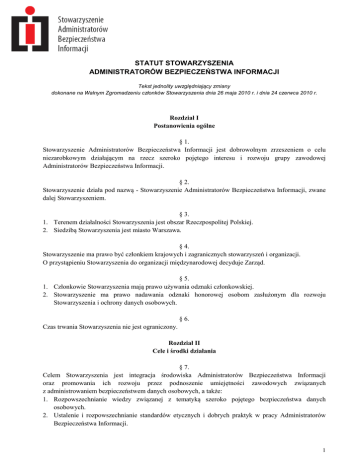 STATUT STOWARZYSZENIA ADMINISTRATORÓW BEZPIECZEŃSTWA INFORMACJI Tekst jednolity uwzględniający zmiany dokonane na Walnym Zgromadzeniu członków Stowarzyszenia dnia 26 maja 2010 r. i dnia 24 czerwca 2010 r. Rozdział I Postanowienia ogólne § 1. Stowarzyszenie Administratorów Bezpieczeństwa Informacji jest dobrowolnym zrzeszeniem o celu niezarobkowym działającym na rzecz szeroko pojętego interesu i rozwoju grupy zawodowej Administratorów Bezpieczeństwa Informacji. § 2. Stowarzyszenie działa pod nazwą - Stowarzyszenie Administratorów Bezpieczeństwa Informacji, zwane dalej Stowarzyszeniem. § 3. 1. Terenem działalności Stowarzyszenia jest obszar Rzeczpospolitej Polskiej. 2. Siedzibą Stowarzyszenia jest miasto Warszawa. § 4. Stowarzyszenie ma prawo być członkiem krajowych i zagranicznych stowarzyszeń i organizacji. O przystąpieniu Stowarzyszenia do organizacji międzynarodowej decyduje Zarząd. § 5. 1. Członkowie Stowarzyszenia mają prawo używania odznaki członkowskiej. 2. Stowarzyszenie ma prawo nadawania odznaki honorowej osobom zasłużonym dla rozwoju Stowarzyszenia i ochrony danych osobowych. § 6. Czas trwania Stowarzyszenia nie jest ograniczony. Rozdział II Cele i środki działania § 7. Celem Stowarzyszenia jest integracja środowiska Administratorów Bezpieczeństwa Informacji oraz promowania ich rozwoju przez podnoszenie umiejętności zawodowych związanych z administrowaniem bezpieczeństwem danych osobowych, a także: 1. Rozpowszechnianie wiedzy związanej z tematyką szeroko pojętego bezpieczeństwa danych osobowych. 2. Ustalenie i rozpowszechnianie standardów etycznych i dobrych praktyk w pracy Administratorów Bezpieczeństwa Informacji. 1 3. Rozpowszechnianie idei potwierdzania kompetencji zawodowych w zakresie ochrony danych osobowych. 4. Działalność na rzecz przestrzegania zasad ochrony danych osobowych. § 8. Stowarzyszenie realizuje swoje cele poprzez: 1. Organizację zebrań członków stowarzyszenia w celu umożliwienia poszerzenia wiedzy i wymiany poglądów w zakresie ochrony danych osobowych. 2. Organizację konferencji, sympozjów, warsztatów i seminariów poświęconych problematyce bezpieczeństwa systemów informacyjnych. 3. Publikacje materiałów dotyczących problematyki ochrony danych osobowych. 4. Promocję w prasie fachowej i poprzez udział w konferencjach i seminariach zagadnień dotyczących problematyki ochrony danych osobowych. 5. Opiniowanie wydarzeń i rozwiązań z zakresu bezpieczeństwa danych osobowych oraz propagowanie potrzeby ochrony danych osobowych. 6. Opiniowanie ustaw i innych aktów prawnych z zakresu działania Stowarzyszenia. 7. Opracowanie, wdrażanie i egzekwowanie Kodeksu Etyki Zawodowej Administratorów Bezpieczeństwa Informacji. 8. Opracowanie i wdrażanie sposobów potwierdzania kompetencji zawodowych w zakresie ochrony danych osobowych. 9. Tworzenie i ochrona prestiżu grupy zawodowej administratorów bezpieczeństwa informacji. 10. Reprezentowanie interesów członków Stowarzyszenia na szczeblach centralnych. 11. Występowanie przed organami władzy publicznej. 12. Współpracę z organizacjami administracji publicznej oraz innymi stowarzyszeniami na rynku polskim i zagranicznym. 13. Podejmowanie inicjatyw i zajmowanie stanowisk w sprawach dotyczących ochrony danych osobowych. § 9. Realizację swoich celów statutowych Stowarzyszenie opiera na pracy społecznej swoich członków. Do prowadzenia swojej działalności może zatrudniać pracowników. § 10. 1. Dla realizacji swoich celów statutowych Stowarzyszenie może prowadzić działalność gospodarczą. 2. Dla realizacji celów statutowych Stowarzyszenie może wydawać Biuletyn informacyjny. § 11. 1. Stowarzyszenie jest promotorem Kodeksu Etyki Zawodowej Administratorów Bezpieczeństwa Informacji. 2. Stowarzyszenie ustala standardy etyki zawodowej w Kodeksie Etyki Zawodowej Administratorów Bezpieczeństwa Informacji. § 12. 1. Stowarzyszenie jest promotorem potwierdzania i certyfikowania kompetencji zawodowych w zakresie ochrony danych osobowych. 2. Stowarzyszenie promuje standardy i dobre praktyki edukacji, egzaminowania, potwierdzania lub certyfikowania w zakresie ochrony danych osobowych. 2 Rozdział III Członkowie Stowarzyszenia § 13. Członkowie Stowarzyszenia dzielą się na: 1. Członków Rzeczywistych. 2. Członków Wspierających. 3. Członków Honorowych. 1. 2. 3. 4. § 14. Członkiem rzeczywistym Stowarzyszenia może być obywatel Rzeczpospolitej Polskiej lub cudzoziemiec, także nie posiadający stałego miejsca zamieszkania na terytorium Rzeczpospolitej Polskiej, mający nieposzlakowaną opinię, pełną zdolność do czynności prawnych, nie pozbawiony praw publicznych. Członkostwo Stowarzyszenia jest uwarunkowane udziałem w realizacji celów Stowarzyszenia zawartych w Rozdziale II i przestrzeganiem Statutu oraz Kodeksu Etyki Zawodowej. Członkami Stowarzyszenia mogą być Administratorzy Bezpieczeństwa Informacji oraz osoby zajmujące się ochroną danych osobowych. Administrator Bezpieczeństwa Informacji może być rekomendowany przez osobę prawną, osobę nie posiadającą osobowości prawnej lub innego rodzaju organizację lub instytucję, w której jest zatrudniony. Członkiem rzeczywistym Stowarzyszenia może być również inna osoba fizyczna, która chce czynnie działać na rzecz Stowarzyszenia. § 15. 1. Członek rzeczywisty Stowarzyszenia ma prawo do: 1) udziału w Walnym Zgromadzeniu, 2) udziału w spotkaniach Stowarzyszenia, 3) czynnego i biernego prawa wyborczego, 4) korzystania ze świadczeń i urządzeń Stowarzyszenia, 5) noszenia odznaki członkowskiej, 6) składania wniosków, o których mowa w § 16 ust. 3 oraz § 23 ust. 21 niniejszego statutu. 2. Członek rzeczywisty Stowarzyszenia jest zobowiązany do: 1) przestrzegania postanowień statutu, regulaminów oraz uchwał organów Stowarzyszenia, 2) udziału w realizacji celów statutowych Stowarzyszenia, 3) przestrzegania zasad etycznych w