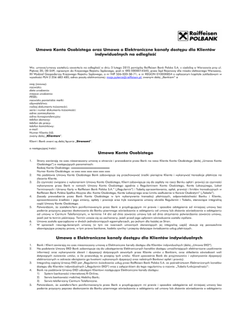 Umowa Konta Osobistego oraz Umowa o Elektroniczne kanały dostępu dla Klientów indywidualnych na odległość Ww. umowa/umowy została/y zawarta/e na odległość w dniu 3 lutego 2015 pomiędzy Raiffeisen Bank Polska S.A. z siedzibą w Warszawie przy ul. Pięknej 20, 00-549, wpisanym do Krajowego Rejestru Sądowego, pod nr KRS 0000014540, przez Sąd Rejonowy dla miasta stołecznego Warszawy, XII Wydział Gospodarczy Krajowego Rejestru Sądowego, o nr NIP 526-020-58-71, o nr REGON 010000854 o opłaconym kapitale zakładowym w wysokości PLN 2 256 683 400, adres poczty elektronicznej: [email protected], zwanym dalej „Bankiem” a imię (imiona): nazwisko: data urodzenia: miejsce urodzenia: PESEL: nazwisko panieńskie matki: obywatelstwo: rodzaj dokumentu tożsamości: seria i numer dokumentu tożsamości: adres zamieszkania: adres korespondencyjny: telefon domowy: telefon do pracy: telefon komórkowy: e-mail: Numer Klienta (Id): zwany dalej „Klientem”. Klient i Bank zwani są dalej łącznie „Stronami”. o następującej treści: Umowa Konta Osobistego 1. 2. 3. 4. 5. 6. 7. Strony zawierają na czas nieoznaczony umowę o otwarcie i prowadzenie przez Bank na rzecz Klienta Konta Osobistego (dalej „Umowa Konta Osobistego”) o następujących parametrach: Rodzaj Konta Osobistego: xxxxxxxxxxxxxxxxxxxxxxxxxxxxxx Numer Konta Osobistego: xx xxxx xxxx xxxx xxxx xxxx xxxx Na podstawie Umowy Konta Osobistego Bank zobowiązuje się przechowywać środki pieniężne Klienta i wykonywać transakcje płatnicze na zlecenie Klienta. Za czynności związane z wykonaniem Umowy Konta Osobistego, Klient zobowiązuje się do zapłaty na rzecz Banku opłat i prowizji za czynności wykonywane przez Bank w ramach Umowy Konta Osobistego zgodnie z Regulaminem Konta Osobistego, Konta Lokacyjnego, Lokat Terminowych i Umowy Karty w Raiffeisen Bank Polska S.A.” („Regulamin”) i Tabelą oprocentowania, opłat, prowizji i limitów transakcyjnych w Raiffeisen Bank Polska Spółka Akcyjna dla: Konta Osobistego, Konta Lokacyjnego oraz Limitu zadłużenia w Koncie Osobistym” („Tabela”). Zasady prowadzenia przez Bank Konta Osobistego w tym wykonywania transakcji płatniczych, odpowiedzialności Banku i Klienta, oprocentowania środków i jego zmiany, opłaty i prowizje oraz tryb rozwiązania umowy określa Regulamin i Tabela, stanowiące integralną część Umowy Konta Osobistego. Potwierdzam, że zostałem/łam poinformowany/a przez Bank o przysługującym mi prawie i sposobie odstąpienia od niniejszej umowy bez podania przyczyny poprzez dostarczenie do Banku pisemnego oświadczenia o odstąpieniu od umowy lub złożenie oświadczenia o odstąpieniu od umowy w Centrum Telefonicznym, w terminie 14 dni od dnia zawarcia umowy lub od dnia otrzymania potwierdzenia zawarcia umowy, jeżeli jest to termin późniejszy. Termin uważa się za zachowany, jeżeli przed jego upływem oświadczenie zostało wysłane. Umowa została sporządzona w dwóch jednobrzmiących egzemplarzach, po jednym dla każdej ze Stron. W sprawach nieuregulowanych umową (w tym we wzorcach umownych stanowiących jej integralną część) stosuje się powszechnie obowiązujące przepisy prawa, w tym prawo bankowe, kodeks cywilny i przepisy dotyczące świadczenia usług płatniczych. Umowa o Elektroniczne kanały dostępu dla Klientów indywidualnych 1. 2. 3. 4. 5. Bank i Klient zawierają na czas nieoznaczony umowę o Elektroniczne kanały dostępu dla Klientów indywidualnych (dalej „Umowa EKD”). Na podstawie Umowy EKD Bank zobowiązuje się do udostępnienia Elektronicznych kanałów dostępu umożliwiających elektroniczne uzyskiwanie informacji oraz wykonywanie zleceń i dyspozycji dotyczących zawartych przez Klienta umów z Bankiem, oraz składania oświadczeń woli dotyczących zwierania umów, o ile przewidują to przepisy tych umów. Klient upoważnia Bank do przyjmowania i wykonywania dyspozycji elektronicznych w zakresie obciążania go kwotami wykonanych dyspozycji oraz należnych Bankowi opłat i prowizji. Integralną częścią Umowy EKD jest „Regulamin świadczenia usług przez Raiffeisen Bank Polska S.A. za pośrednictwem Elektronicznych kanałów dostępu dla Klientów indywidualnych („Regulamin EKD”) wraz z załącznikiem do tego regulaminu o nazwie: „Tabela funkcjonalności”: Bank na podstawie Umowy EKD udostępni Klientowi następujące Elektroniczne kanały dostępu: 1) System bankowości internetowej R-Online; 2) Serwis bankowości mobilnej Mobilny Bank; 3) Serwis telefoniczny Centrum Telefoniczne. Potwierdzam, że zostałem/łam poinformowany/a przez Bank o przysługującym mi prawie i sposobie odstąpienia od niniejszej umowy bez podania przyczyny poprzez dostarczenie do Banku pisemnego oświadczenia o odstąpieniu od umowy lub złożenie oświadczenia o odstąpieniu 6. od umowy w Centrum Telefonicznym, w terminie 14 dni od dnia zawarcia umowy lub od dnia otrzymania potwierdzenia zawarcia umowy, jeżeli jest to termin późniejszy. Termin uważa się za zachowany, jeżeli przed jego upływem oświadczenie zostało wysłane. Pakiet Startowy oraz Hasło jednorazowe (o których mowa w Regulaminie EKD) Bank wysyła na numer telefonu komórkowego Klienta podany powyżej. Oświadczenia Klienta/Klientów (złożone podczas zawarcia umowy/umów na odległość) 1. Potwierdzam, że otrzymałem/łam informację, iż stosownie do art. 24 ust. 1 ustawy z dnia 29 sierpnia 1997r. o ochronie danych osobowych (Dz. U. Nr 133, poz. 883 z późn. zm.): 1) administratorem danych jest Raiffeisen Bank Polska S.A., ul. Piękna 20, 00–549 Warszawa; 2) dane są zbierane w związku z dokonywaniem czynności bankowych przez Bank w ramach niniejszej/ych umowy/umów i mogą być, zgodnie z art. 23 ust. 1 pkt. 5 ww. ustawy, wykorzystane do celów związanych z działalnością Banku; 3) zebrane dane mogą być udostępniane podmiotom zewnętrznym na zasadach określonych w ustawie Prawo Bankowe, a zwłaszcza: − innym banko