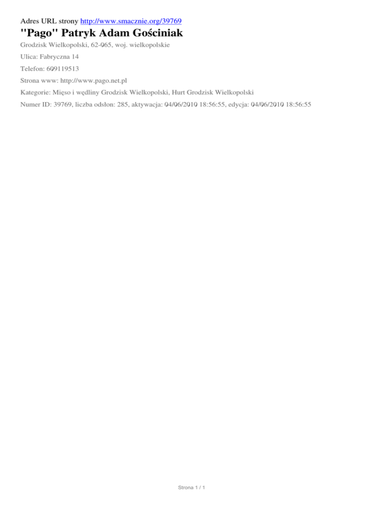 Adres URL strony http://www.smacznie.org/39769 "Pago" Patryk Adam Gościniak Grodzisk Wielkopolski, 62-065, woj. wielkopolskie Ulica: Fabryczna 14 Telefon: 609119513 Strona www: http://www.pago.net.pl Kategorie: Mięso i wędliny Grodzisk Wielkopolski, Hurt Grodzisk Wielkopolski Numer ID: 39769, liczba odsłon: 285, aktywacja: 04/06/2010 18:56:55, edycja: 04/06/2010 18:56:55 Strona 1 / 1