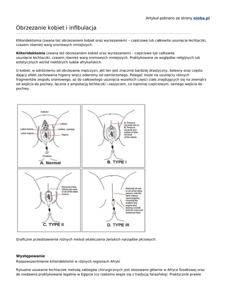 Artykuł pobrano ze strony eioba.pl Obrzezanie kobiet i infibulacja Klitoridektomia (zwana też obrzezaniem kobiet oraz wyrzezaniem) – częściowe lub całkowite usunięcie łechtaczki, czasem również warg sromowych mniejszych. Klitoridektomia (zwana też obrzezaniem kobiet oraz wyrzezaniem) – częściowe lub całkowite usunięcie łechtaczki, czasem również warg sromowych mniejszych. Praktykowane ze względów religijnych lub estetycznych wśród niektórych ludów afrykańskich. U kobiet, w odróżnieniu od obrzezania mężczyzn, akt ten jest znacznie bardziej drastyczny, bolesny oraz często dający efekt zachowania higieny wręcz odwrotny od zamierzonego. Polegać może na usunięciu różnych fragmentów zespołu sromowego, aż do całkowitego usunięcia wszelkich części ciała znajdujących się na zewnątrz od wejścia do pochwy, łącznie z amputacją łechtaczki i zaszyciem, co najmniej częściowym, samego wejścia do pochwy. Graficzne przedstawienie różnych metod okaleczania żeńskich narządów płciowych. Występowanie Rozpowszechnienie klitoridektomii w różnych regionach Afryki Rytualne usuwanie łechtaczek metodą zabiegów chirurgicznych jest stosowane głównie w Afryce Środkowej oraz do niedawna praktykowane legalnie w Egipcie (co rzekomo wiąże się z tradycją faraońską). Praktycznie prawie niestosowane w innych krajach arabskich oraz islamskich i nieznane m.in.: w Tunezji, Algierii, Maroku, Jordanii, Libanie,Turcji itd. Obrzezanie kobiet praktykowali również egipscy chrześcijanie – Koptowie. Nie jest ono jednak związane z religią jako taką w odróżnieniu od obrzezania mężczyzn – jedynie z tradycją danego kraju lub regionu. Występuje głównie w Etiopii (również praktykowane przez etiopskich Żydów), Kenii (gdzie dominującą religią jest chrześcijaństwo),Erytrei, Sierra Leone, Sudanie, Somalii, Gambii, Czadzie, Mali, Nigerii, Kamerunie, Indonezji itd. W kulturach ludów mniej rozwiniętych obrzezanie kobiet jest znacznie bardziej okrutne. Może polegać nawet na stosowaniu wrzątku oraz wyskrobywaniu fragmentów ciała zamiast ich odcinania. Dane liczbowe Na świecie żyje 130 mln obrzezanych kobiet, dziennie obrzezanych zostaje 6 tysięcy, czyli 2 mln kobiet rocznie. 90% obrzezanych dziewcząt w Egipcie, Somalii, Mali 70-90% obrzezanych dziewcząt w Sierra Leone, Burkina Faso, Sudanie, Etiopii , Erytrei 50-70% obrzezanych dziewcząt w Rep. Środkowoafrykańskiej, Ghanie, Wybrzeżu Kości Słoniowej 30-50% obrzezanych dziewcząt w Gwinei, Togo, Beninie, Nigerii, Czadzie, Kenii 10-30% obrzezanych dziewcząt w Nigerii, Kamerunie, Mauretanii, Senegalu, Tanzanii poniżej 10% obrzezanych dziewcząt w Kongo Krytyka W przeciwieństwie do obrzezania mężczyzn, obrzezanie kobiet jest uznawane przez wiele środowisk i organizacji za pogwałcenie praw człowieka – jest bardziej drastyczne, a w niektórych kulturach jest nawet wręcz specjalnie aktem mającym sprawić ból, co ma dawać dodatkowy efekt "oczyszczający". Jednak nawet bardziej cywilizowane akty obrzezania kobiet, jak odcięcie ostrym narzędziem łechtaczki przez specjalistę, budzi protesty wielu osób na całym świecie jako akt nieuzasadnionego niczym okaleczenia człowieka z istotnej części jego ciała, wpływającej na jego funkcje seksualne. Stanowi to kulturowo akt uprzedmiotowienia kobiety w stosunku do mężczyzny, którego celem ma być obniżenie jej libido. Najbardziej znaną przeciwniczką obrzezania kobiet jest Holenderka somalijskiego pochodzenia Ayaan Hirsi Ali i somalijska modelka i pisarka Waris Dirie. Infibulacja Infibulacja – jeden z podtypów medycznie nieuzasadnionej modyfikacji genitaliów żeńskich. Polega na usunięciu łechtaczki, warg sromowych mniejszych i nacięciu oraz zaszyciu warg sromowych większych z pozostawieniem małego otworu pozwalającego na oddawanie moczu i miesiączkowanie. Praktykowana w wielu krajach Afryki, Bliskiego Wschodu i południowo-wschodniej Azji. Zazwyczaj praktykowana bez zasad zachowania aseptyki, bez znieczulenia i na osobie przed osiągnięciem okresu dojrzewania. Celem jest zapewnienie wierności kobiety. Rozerwanie blizny po operacji następuje podczas pierwszego stosunku seksualnego (w Sudanie niepowodzenie rozerwania źle świadczy o potencji mężczyzny) lub jeśli nie jest to możliwe, przed pierwszym stosunkiem dokonuje się rozcięcia tkanki przy pomocy małego noża. Czasem dochodzi do zapłodnienia mimo zachowania ciągłości blizny i wówczas jest ona przecinana chirurgicznie by umożliwić poród lub dokonuje się nacięcia krocza, które zwykle nie byłoby potrzebne. Notowano przypadki o takim przerośnięciu blizny keloidem, że dochodziło do złamania ostrza skalpela. Posąg greckiego poety Anakreonta z widoczną infibulacją. Męska infibulacja Historycznie infibulacja oznaczała również zszycie napletka u mężczyzny (tzw. męska infibulacja). Dokonywano tego na niewolnikach w starożytnym Rzymie, by zapewnić, że nie będą się oni angażowali w stosunki seksualne, jak również u ochotników w niektórych kulturach. Był to zabieg mający uniemożliwić stosunek seksualny, ale nie masturbację. Potencjalne zagrożenia Infibulacja może czasem prowadzić do problemów, takich jak poważne zakażenie rany, krwotok, trudności z miesiączkowaniem, infekcje układu moczowego. Podnosi się również kwestię traumatyzacji psychicznej przez taką operację oraz wywoływania depresji u dziewcząt w okresie adolescencji, które przeszły wcześniej taką operację. Ścisła infibulacja może stanowić zagrożenie dla matki i płodu, jeśli ciąża nie jest prowadzona przez doświadczonego operatora, może także prowadzić do nieuzasadnionegocięcia cesarskiego. P.S. Polecam wszystkim film "Kwiat pustyni" który mówi o tym problemie. Źródła: http://pl.wikipedia.org/wiki/Obrzezanie_kobiet http://pl.wikipedia.org/wiki/Infibulacja Tekst udostępniany na licencji Creative Commons: uznanie au