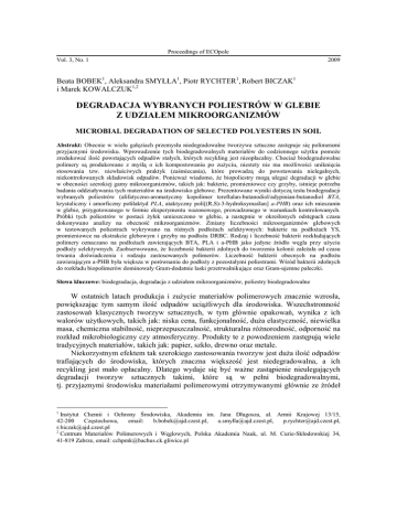 Proceedings of ECOpole Vol. 3, No. 1 2009 Beata BOBEK1, Aleksandra SMYŁŁA1, Piotr RYCHTER1, Robert BICZAK1 i Marek KOWALCZUK1,2 DEGRADACJA WYBRANYCH POLIESTRÓW W GLEBIE Z UDZIAŁEM MIKROORGANIZMÓW MICROBIAL DEGRADATION OF SELECTED POLYESTERS IN SOIL Abstrakt: Obecnie w wielu gałęziach przemysłu niedegradowalne tworzywa sztuczne zastępuje się polimerami przyjaznymi środowisku. Wprowadzenie tych biodegradowalnych materiałów do codziennego uŜytku pomoŜe zredukować ilość powstających odpadów stałych, których recykling jest nieopłacalny. ChociaŜ biodegradowalne polimery są produkowane z myślą o ich kompostowaniu po zuŜyciu, niestety nie ma moŜliwości uniknięcia stosowania tzw. niewłaściwych praktyk (zaśmiecania), które prowadzą do powstawania nielegalnych, niekontrolowanych składowisk odpadów. PoniewaŜ wiadomo, Ŝe biopoliestry mogą ulegać degradacji w glebie w obecności szerokiej gamy mikroorganizmów, takich jak: bakterie, promieniowce czy grzyby, istnieje potrzeba badania oddziaływania tych materiałów na środowisko glebowe. Prezentowane wyniki dotyczą testu biodegradacji wybranych poliestrów (alifatyczno-aromatyczny kopolimer tereftalan-butanodiol/adypinian-butanodiol BTA, krystaliczny i amorficzny polilaktyd PLA, ataktyczny poli[(R,S)-3-hydroksymaślan] a-PHB) oraz ich mieszanin w glebie, przygotowanego w formie eksperymentu wazonowego, prowadzonego w warunkach kontrolowanych. Próbki tych poliestrów w postaci Ŝyłek umieszczono w glebie, a następnie w określonych odstępach czasu dokonywano analizy na obecność mikroorganizmów. Zmiany liczebności mikroorganizmów glebowych w testowanych poliestrach wykrywano na róŜnych podłoŜach selektywnych: bakterie na podłoŜach YS, promieniowce na ekstrakcie glebowym i grzyby na podłoŜu DRBC. Rodzaj i liczebność bakterii rozkładających polimery oznaczano na podłoŜach zawierających BTA, PLA i a-PHB jako jedyne źródło węgla przy uŜyciu podłoŜy selektywnych. Zaobserwowano, Ŝe liczebność bakterii zdolnych do tworzenia kolonii zaleŜała od czasu trwania doświadczenia i rodzaju zastosowanych polimerów. Liczebność bakterii obecnych na podłoŜu zawierającym a-PHB była większa w porównaniu do podłoŜy z pozostałymi poliestrami. Wśród bakterii zdolnych do rozkładu biopolimerów dominowały Gram-dodatnie laski przetrwalnikujące oraz Gram-ujemne pałeczki. Słowa kluczowe: biodegradacja, degradacja z udziałem mikroorganizmów, poliestry biodegradowalne W ostatnich latach produkcja i zuŜycie materiałów polimerowych znacznie wzrosła, powiększając tym samym ilość odpadów uciąŜliwych dla środowiska. Wszechstronność zastosowań klasycznych tworzyw sztucznych, w tym głównie opakowań, wynika z ich walorów uŜytkowych, takich jak: niska cena, funkcjonalność, duŜa elastyczność, niewielka masa, chemiczna stabilność, nieprzepuszczalność, strukturalna róŜnorodność, odporność na rozkład mikrobiologiczny czy atmosferyczny. Produkty te z powodzeniem zastępują wiele tradycyjnych materiałów, takich jak: papier, szkło, drewno oraz metale. Niekorzystnym efektem tak szerokiego zastosowania tworzyw jest duŜa ilość odpadów trafiających do środowiska, których znaczna większość jest niedegradowalna, a ich recykling jest mało opłacalny. Dlatego wydaje się być waŜne zastąpienie nieulegających degradacji tworzyw sztucznych takimi, które są w pełni biodegradowalnymi, tj. przyjaznymi środowisku materiałami polimerowymi otrzymywanymi głównie ze źródeł 1 Instytut Chemii i Ochrony Środowiska, Akademia im. Jana Długosza, al. Armii Krajowej 13/15, 42-200 Częstochowa, email: [email protected], [email protected], [email protected], [email protected] 2 Centrum Materiałów Polimerowych i Węglowych, Polska Akademia Nauk, ul. M. Curie-Skłodowskiej 34, 41-819 Zabrze, email: [email protected] 52 Beata Bobek, Aleksandra Smyłła, Piotr Rychter, Robert Biczak i Marek Kowalczuk odnawialnych zdolnych do samorzutnej degradacji hydrolitycznej bądź enzymatycznej po wymaganym czasie eksploatacji. Obecnie polimerami biodegradowalnymi cieszącymi się duŜym zainteresowaniem są m.in. polimery uzyskiwane bezpośrednio z surowców odnawialnych (polisacharydy naturalne, takie jak skrobia, celuloza i ich pochodne), naturalne poliestry produkowane przez mikroorganizmy (poli-3-hydroksymaślan PHB, jego kopoliester z kwasem 3-hydroksywalerianowym PHBV), polimery produkowane przez klasyczną syntezę chemiczną z monomerów pochodzenia naturalnego (polilaktyd, PLA) oraz polimery wytwarzane z surowców petrochemicznych jak poli(ε-kaprolakton) PCL [1-3]. Szybkość procesu degradacji biodegradowalnych materiałów polimerowych w środowisku przyrodniczym zaleŜy zarówno od budowy i właściwości samego materiału, jak i od warunków otoczenia, w którym się znajduje. NajwaŜniejszym biologicznym czynnikiem występującym w środowisku naturalnym (kompost, gleba, osad czynny), wpływającym na tempo mineralizacji biopolimeru, jest aktywność obecnych tam mikroorganizmów, a zwłaszcza bakterii, promieniowców i grzybów [4-5]. Materiały i metody Badania nad udziałem mikroorganizmów glebowych w rozkładzie biopolimerów prowadzono na próbkach polimerów w postaci wytłoczonych Ŝyłek przygotowanych w Centrum Materiałów Polimerowych i Węglowych PAN w Zabrzu. Wykorzystane w doświadczeniu wazonowym materiały poliestrowe to: alifatyczno-aromatyczny kopolimer tereftalan-butanodiol/adypinian-butanodiol (BTA), krystaliczny (PLLA) i amorficzny (PDLLA) polilaktyd, ataktyczny poli[(R,S)-3-hydroksymaślan] (a-PHB). Dodatkowo, oprócz Ŝyłki BTA, do testu biodegradacji przygotowano próbkę tego samego polimeru w postaci folii. Gleba uŜyta do badań naleŜała do grupy piasku luźnego, o pH zbliŜonym do obojętnego. Eksperyment prowadzono w temperaturze 22±2°C z zachowaniem stałej wilgotności próbek gleby. Badania mikrobiologiczne przeprowadzono w