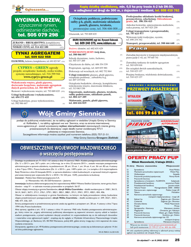 Kupię działkę siedliskową, min. 0,5 ha przy trasie A-2 lub DK-50, w odległości od drogi do 300 m, z dojazdem i mediami, tel. 608 410 762 Ogłoszenia... WYCINKA DRZEW, Ocieplenia poddaszy, podwieszane sufity g-k, gładź, malowanie układanie paneli, glazura, terakota, promocyjne ceny, tel. 506 606 008 (271) czyszczenie rynien, odśnieżanie dachów, tel. 505 079 298 Glazurnik, tel. 793 009 835 JURAND – BRUKARSTWO, kompleksowe układanie kostki, szybka realizacja zamówienia, NISKIE CENY, tel. 514 422 100 (197) TYNKI AGREGATEM tel. 509 622 958 (293) (274) (124) ELEKTRYK, fachowo, kompleksowo, tel. 691 023 567 (116) CYPRYS – GREEN ogrody projekt, urządzanie: kaskady, oczka wodne, systemy nawadniające, tel. 516 399 944 www.cyprys-green.pl (166) Wykończenia wnętrz, gładź gipsowa, docieranie bezpyłowe, malowanie agregatem dużych powierzchni, tel. 503 008 987 (283) Remont i wykończenie wnętrz, tel. 793 009 835 (292) Usługi hydrauliczne i wykończeniowe, tel. 694 173 435 (297) Usługi budowlane, prace wykończeniowe, tel. 502 986 667 (4) BIURO RACHUNKOWE mgr inż. Ryszard Sobczuk tel. 609 240 375, www.rsbiuro.eu (249) Budowa domów, tel. 602 631 629 (3) WYREMONTUJEMY twój dom, tel. 500 066 097 (5) Schody drewniane, tanio, fachowo, tel. 503 157 260 (6) Chryslerem do ślubu, tel. 606 354 539 (8) Posprzątam, ugotuję, tel. 669 835 901 (10) Dekoracje sal weselnych, tel. 602 752 864 (13) Usługi remontowe glazura, gładź gipsowa, ocieplenia poddaszy , zabudowy k-g, tel. 607 219 816 (18) Ocieplenia budynków, elewacje, kompleksowe wykończenia wnętrz, murowanie klinkieru, tel. 513 063 530 (19) Gipsowanie, malowanie, glazura, terakota, sufity podwieszane, układanie paneli, tel. 884 227 289 (22) Malowanie, panele, gładź gipsowa, tel. 604 616 819 (23) Wójt Gminy Siennica Profesjonalne układanie kostki brukowej, przemysłowej, szlachetnej. Odwodnienie gratis, tel. 506 356 415 (24) Adwokat kościelny, unieważnienia małżeństw, radca prawny, tel. 667 825 230 (25) Usługi transportowe i przeprowadzki, tel. 797 633 977 (26) Wykonam tynki tradycyjne, ręcznie, tel. 698 254 342 (27) Transport, przeprowadzki, tel. 508 666 640 (29) Praca Zatrudnię kierowców w transporcie międzynarodowym, prawo jazdy C+E, tel. 797 605 741 (6) Zatrudnię tynkarzy do tynków agregatem tel. 503 839 018 (12) Do ociepleń dwóch samodzielnych, tel. 510 423 137 (14) Przyjmę brukarza, wieloletnie doświadczenie, tel. 510 423 137 (15) KRA JOWE I MIĘDZYNARODOWE PRZEWOZY PASAŻERSKIE WYNAJEM AUTOKARÓW [email protected] www.rondo.edu.pl tel. 606 99 66 04 podaje do publicznej wiadomości, że na tablicy ogłoszeń w siedzibie Urzędu Gminy w Siennicy ul. Kołbielska 1, na tablicy ogłoszeń we wsi Siennica, oraz na stronie internetowej www.ugsiennica.pl - został wywieszony wykaz nieruchomości stanowiących mienie gminy, przeznaczonych do dzierżawy: część działki numer ewidencyjny 471/1 położonej w miejscowości Siennica. Szczegółowe informacje można uzyskać pod numerem telefonu (025) 757-21-51. Wójt Gminy Siennica Grzegorz Zieliński OBWIESZCZENIE WOJEWODY MAZOWIECKIEGO o wszczęciu postępowania Działając na podstawie art. 9 i 10 § 1 i 61 ustawy z dnia 14 czerwca 1960 r. Kodeks postępowania administracyjnego OFERTY PRACY PUP Mińsk Mazowiecki, 5 lutego 2015 r. (Dz. U. z 2013 r. poz. 267 z późn. zm.) informuję, że w dniu 22 stycznia 2015 r., zostało wszczęte postępowanie administracyjne w sprawie udzielenia, na podstawie art. 28, art. 33 ust. 1, art. 34 ust. 4, art. 36 i art. 82 ust. 4 ustawy Nr oferty z dnia 7 lipca 1994 r. Prawo budowlane (Dz. U. z 2013 r., poz. 1409 z późn. zm. ) w związku z § 6 rozporządzenia 51 52 53 54 55 56 57 58 59 60 61 49 48 47 46 45 44 43 42 39 38 37 Rady Ministrów z dnia 25 listopada 2010 r. w sprawie obiektów i robót budowlanych, w sprawach których organem pierwszej instancji jest wojewoda (Dz U. z 2010 r. Nr 235 poz. 1539), pozwolenia na budowę: inwestor: Polskie Sieci Elektroenergetyczne S.A. ul. Warszawska 165, 05-520 Konstancin – Jeziorna inwestycja: budowa elektroenergetycznej linii napowietrznej 400kV Miłosna-Siedlce Ujrzanów, teren gminy Stanisławów – etap IV – w zakresie montażu przewodów w przęsłach: 56-57. Obszar objęty inwestycją w gminie Stanisławów, obręb Wólka Czarnińska – działki ewidencyjne nr: 358/1, 361/3, 361/4, 364/1, 367/1, 371/1, 376/1, 379/1, 382/1, 385/1, 388/1, 391/1, 394/1, 397/1, 400/1, 404, 406; Obszar w oddziaływaniu inwestycji w gminie Stanisławów, na którym nie będą prowadzone roboty budowlane objęte przedmiotowym postępowaniem: obręb Wólka Czarnińska – działki ewidencyjne nr: 349, 352/1, 355/1, 408, 477, 336, 337. Strony postępowania w przedmiotowej sprawie ustala się zgodnie z przepisem art. 28 ust. 4 ustawy z dnia 7 lipca 1994 roku Prawo budowlane. Akta sprawy, zgodnie z art. 10 § 1 ustawy z dnia 14 czerwca 1960 roku Kodeks postępowania administracyjnego, który mówi że „organy administracji publicznej obowiązane są zapewnić stronom czynny udział w każdym stadium postępowania, a przed wydaniem decyzji umożliwić im wypowiedzenie się co do zebranych dowodów i materiałów oraz zgłoszonych żądań”, znajdują się do wglądu w Wydziale Infrastruktury Mazowieckiego Urzędu Wojewódzkiego, pl. Bankowy 3/5, 00-950 Warszawa, pokój 603, gdzie strony mogą się z nimi zapoznać do czasu wydania orzeczenia. Doręczenie, zgodnie z art. 49 Kodeksu postępowania administracyjnego, uważa się za dokonane po upływie 14 dni od dnia publicznego ogłoszenia. WI-III.7840.4.16.2014.ES Nazwa stanowiska Miejscowość Sprzedawca Huta Mińska Mechanik samochodów ciężarowych Mińsk Maz. Wulkanizator Stojadła Pracownik produkcji spożywczej Nowy Konik Pracownik biurowy Sprzedawca w kwiaciarni - FLORYSTA Sulejówek Przedstawiciel handlowy terytorium Polski Przedstawiciel handlowy powiat miński Tokarz/ Frezer Wynagrodzenie: 2000 – 3000zł Kierowca sam. ciężaroweg