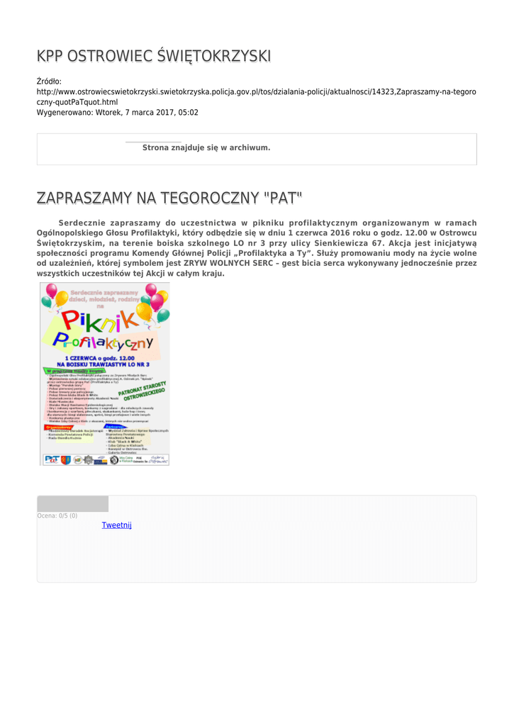 KPP OSTROWIEC ŚWIĘTOKRZYSKI Źródło: http://www.ostrowiecswietokrzyski.swietokrzyska.policja.gov.pl/tos/dzialania-policji/aktualnosci/14323,Zapraszamy-na-tegoro czny-quotPaTquot.html Wygenerowano: Wtorek, 7 marca 2017, 05:02 Strona znajduje się w archiwum. ZAPRASZAMY NA TEGOROCZNY "PAT" Serdecznie zapraszamy do uczestnictwa w pikniku profilaktycznym organizowanym w ramach Ogólnopolskiego Głosu Profilaktyki, który odbędzie się w dniu 1 czerwca 2016 roku o godz. 12.00 w Ostrowcu Świętokrzyskim, na terenie boiska szkolnego LO nr 3 przy ulicy Sienkiewicza 67. Akcja jest inicjatywą społeczności programu Komendy Głównej Policji „Profilaktyka a Ty”. Służy promowaniu mody na życie wolne od uzależnień, której symbolem jest ZRYW WOLNYCH SERC – gest bicia serca wykonywany jednocześnie przez wszystkich uczestników tej Akcji w całym kraju. Ocena: 0/5 (0) Tweetnij