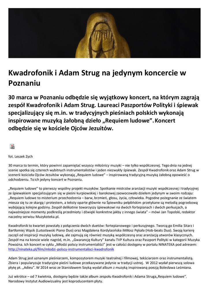 Kwadrofonik i Adam Strug na jedynym koncercie w Poznaniu 30 marca w Poznaniu odbędzie się wyjątkowy koncert, na którym zagrają zespół Kwadrofonik i Adam Strug. Laureaci Paszportów Polityki i śpiewak specjalizujący się m.in. w tradycyjnych pieśniach polskich wykonają inspirowane muzyką żałobną dzieło „Requiem ludowe”. Koncert odbędzie się w kościele Ojców Jezuitów. fot. Leszek Zych 30 marca to termin, który powinni zapamiętać wszyscy miłośnicy muzyki – nie tylko współczesnej. Tego dnia na jednej scenie spotka się czterech wybitnych instrumentalistów i jeden niezwykły śpiewak. Zespół Kwadrofonik oraz Adam Strug w scenerii kościoła Ojców Jezuitów wykonają „Requiem ludowe” – inspirowaną tradycyjną muzyką żałobną opowieść o odchodzeniu. To ich jedyny koncert w Poznaniu. „Requiem ludowe” to pierwszy wspólny projekt muzyków. Spotkanie mistrzów aranżacji muzyki współczesnej i tradycyjnej ze śpiewakiem specjalizującym się w pieśni kurpiowskiej i barokowej zaowocowało dziełem jedynym w swoim rodzaju: „Requiem ludowe to misterium przechodzenia – barw, brzmień, głosu, życia, człowieka. Pogodne pożegnanie ze światem miesza się tu ze skargą i protestem, a teksty oparte głównie na Śpiewniku pelplińskim przetykane są melodią pogrzebową wybijającą kolejne godziny. Zespół delikatnie towarzyszy śpiewakowi na dwóch fortepianach i dwóch perkusjach, a najważniejsze momenty podkreślą przedmioty i dźwięki konkretne jakby z innego świata” – mówi Jan Topolski, redaktor naczelny serwisu Muzykoteka.pl. Kwadrofonik to kwartet powstały z połączenia dwóch duetów: fortepianowego i perkusyjnego. Tworzą go Emilia Sitarz i Bartłomiej Wąsik (Lutosławski Piano Duo) oraz Magdalena Kordylasińska iMiłosz Pękała (Hob-beats Duo). Swoją karierę zaczęli od inspiracji muzyką ludową, ale zajmują się również muzyką współczesną oraz aranżacją utworów klasycznych. Zespół ma na koncie wiele nagród, m.in. „Gwarancję Kultury” kanału TVP Kultura oraz Paszport Polityki w kategorii Muzyka Poważna. Ich koncert w cyklu „Młodzi polscy instrumentaliści” jest w całości dostępny w portalu NINATEKA pod adresem: http://ninateka.pl/film/mlodzi -polscy-instrumentalisci-kwadrofonik Adam Strug jest uznanym pieśniarzem, kompozytorem muzyki teatralnej i filmowej, tekściarzem oraz instrumentalistą. Zbiera i popularyzuje tradycyjne pieśni ludowe przekazywane jedynie w tradycji ustnej. W 2012 wydał pierwszą solowa płytę pt. „Adieu”. W 2014 wraz ze Stanisławem Soyką wydał album z muzyką inspirowaną poezją Bolesława Leśmiana. Już wkrótce – od 7 kwietnia, dostępny będzie także album zespołu Kwadrofonik i Adama Struga„Requiem ludowe“. Narodowy Instytut Audiowizualny jest koproducentem płyty. Koncert odbędzie się 30 marca o godz. 20:00 w Kościele Ojców Jezuitów w Poznaniu na ul. Szewskiej 18. Wstęp wolny. Więcej informacji na na nina.gov.pl. W dniu koncertu, o godz. 12.00 w Poznańskiej Estradzie odbędzie się spotkanie z twórcami otwarte dla dziennikarzy i publiczności. Organizatorzy: Narodowy Instytut Audiowizualny, Polskie Radio, Estrada Poznańska. Partner: Kościół Ojców Jezuitów w Poznaniu. Data publikacji: 24 / 03 / 2015
