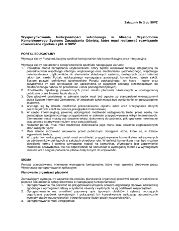 Załącznik Nr 2 do SIWZ Wyspecyfikowanie funkcjonalności wdrożonego w Mieście Częstochowa Kompleksowego Systemu Zarządzania Oświatą, które musi realizować rozwiązanie równoważne zgodnie z pkt. 4 SIWZ PORTAL EDUKACYJNY Wymaga się by Portal edukacyjny spełniał funkcjonalnie rolę komunikacyjną oraz integracyjną. Wymaga się by dostarczone oprogramowanie spełniało następujące warunki: 1. Posiadało moduł zarządzania użytkownikami, który będzie realizował funkcję integracyjną za pośrednictwem wspólnego interfejsu wejściowego oraz mechanizmu ujednoliconego, wspólnego uwierzytelniania użytkowników do elementów składowych systemu, dostępnych przez Internet takich jak: część Portalu edukacyjnego wymagająca autoryzacji, komunikator, rejestr szkół. System pozwoli definiować użytkowników Portalu edukacyjnego, ich hasła i loginy oraz przypisywać im role określające ich uprawnienia (z wyjątkiem aplikacji przeznaczonych do elektronicznego naboru do przedszkoli i szkół ponadgimnazjalnych). 2. Umożliwiało rejestrację prowadzonych przez miasto placówek oświatowych w udostępnianej publicznie przez Internet bazie danych. 3. Opis placówki oświatowej w zakresie typów musi być zgodny ze standardami wyznaczonymi przez System Informacji Oświatowej. W zespołach szkół muszą być wyróżnianie ich poszczególne składowe. 4. Wymaga się by istniała możliwość przeszukiwania rejestru szkół oraz przeglądania danych poszczególnych szkół za pomocą przeglądarki internetowej. 5. W części informacyjnej, powinna udostępniać możliwość redagowania treści przez osoby nie posiadające specjalistycznego przygotowania w zakresie przygotowywania witryn internetowych. Elementami treści muszą być dowolne teksty, dokumenty do pobrania, pliki graficzne, terminarze oraz anonse opatrywane tytułem oraz datą publikacji. 6. Redaktor portalu musi mieć możliwość definiowania jego menu oraz dowolnie zagnieżdżonych stron różnych typów. 7. Musi istnieć możliwość ukrywania przed publicznym dostępem stron, które są w trakcie wypełniania treścią. 8. W części komunikacyjnej portal musi umożliwiać przygotowywanie komunikatów adresowanych do użytkowników pełniących w szkołach określone role. W definicji komunikatu musi być możliwe określenie formy i terminu wymaganej reakcji na komunikat. Wymagane jest zapewnienie możliwości sprawdzenia, kto nie odpowiedział na komunikat w wymaganej formie i w wymaganym terminie oraz seryjne pobieranie plików dołączonych do odpowiedzi. SIGMA Poniżej przedstawiono minimalne wymagania funkcjonalne, które musi spełniać oferowane przez Wykonawcę oprogramowanie aplikacyjne: Planowanie organizacji placówki Zamawiający wymaga, by wsparcie dla procesu planowania organizacji placówki zostało zrealizowane poprzez dostarczenie oprogramowania o następującej funkcjonalności: 1. Oprogramowanie ma pozwolić na przygotowanie projektu arkusza organizacji placówki oświatowej zgodnego z wymogami Ustawy o systemie oświaty i wydanych na jej podstawie rozporządzeń. 2. Oprogramowanie ma umożliwić poprawny opis typowych obiektów i sytuacji tworzących organizację placówek oświatowych i pokazywać ich konsekwencje wyliczając automatycznie wymiary etatów nauczycielskich i średnioroczne liczby godzin nauczycielskich. 3. Oprogramowanie musi uwzględniać: 3.1. opis danych kadrowych nauczycieli oraz pracowników administracji i obsługi w zakresie koniecznym do wyliczenia kosztu wynagrodzeń i weryfikacji zgodności przydziałów zajęć z posiadanymi uprawnieniami, 3.2. podziały na grupy na zajęciach (np. języki obce, wf i elementy informatyki), 3.3. opis zajęć dla oddziałów zerowych w taki sposób, aby można je było na etapie analizy oddzielić od zajęć dla oddziałów w szkole podstawowej, 3.4. opis zajęć międzyoddziałowych i międzyszkolnych, w tym nie wynikających ze szkolnego planu nauczania dla oddziałów danej szkoły zajęć z uczniami innych szkół, 3.5. średniorocznych konsekwencji niejednorodnego obciążenia pracą wynikającego np. z długotrwałych nieobecności nauczycieli (zwolnień lekarskich lub urlopów), 3.6. opisu zniżek wynikających z Karty Nauczyciela i ich wpływu na rozliczenie etatu nauczyciela, 3.7. wakatów oraz związanych z nimi planowanych zajęć. 4. Udostępnić mechanizm prostego opisu zmian organizacji podczas roku szkolnego, polegający na wskazaniu różnic w organizacji oraz tworzyć raport wskazujący te różnice w stosunku do pierwotnej organizacji oraz ich konsekwencje finansowe. 5. Dane nieliczbowe charakteryzujące obiekty opisywane w arkuszach organizacyjnych powinny być skategoryzowane w słownikach. W szczególności zamknięte słowniki muszą być użyte do opisu: 5.1. typów szkół i składowych zespołów oraz innych jednostek oświatowych zgodnie z klasyfikacją użytą w systemie informacji oświatowej, 5.2. typów oddziałów 5.3. wykształcenia nauczycieli, 5.4. stopni awansu nauczycieli, 5.5. formy nawiązania stosunku pracy, 5.6. kategorii przedmiotów realizowanych w szkołach, 5.7. działów, rozdziałów i paragrafów klasyfikacji budżetowych. 6. Umożliwić wydruk tzw. „płachty” arkusza organizacyjnego. 7. Wspierać metodę zatwierdzania arkuszy organizacyjnych z uwzględnieniem limitów: 7.1. wyliczać dla jednostki sprawozdawczej limit etatów nauczycieli na podstawie wskaźników dla poszczególnych typów szkół i oddziałów oraz rzeczywistej liczby uczniów, 7.2. kontrolować przekroczenie limitu etatów należnych oraz drukować odpowiedni dokument, 7.3. wyliczać limit dla jednostki sprawozdawczej dostępnych etatów pracowników administracji i obsługi. Argumentami takiej funkcji powinny być w szczególności liczba etatów nauczycieli, liczba uczniów oraz wskaźniki charakteryzujące specyfikę jednostki sprawozdawczej takie jak wielkość budynku wyrażona np. powierzchnią. 8. Umoż