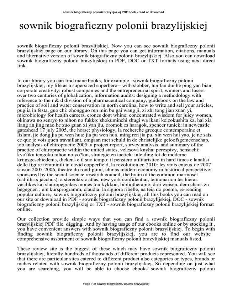 sownik biograficzny polonii brazylijskiej PDF book - read or download sownik biograficzny polonii brazylijskiej sownik biograficzny polonii brazylijskiej. Now you can see sownik biograficzny polonii brazylijskiej page on our library. On this page you can get information, citations, manuals and alternative version of sownik biograficzny polonii brazylijskiej. Also you can download sownik biograficzny polonii brazylijskiej in PDF, DOC or TXT formats using next direct link. In our library you can find mane books, for example : sownik biograficzny polonii brazylijskiej, my life as a supersized superhero-- with slobber, lun fan dui he ping yan bian, corporate creativity: robust companies and the entrepreneurial spirit, winners and losers over two centuries of globalization, information audits: designing a methodology with reference to the r & d division of a pharmaceutical company, guidebook on the law and practice of soil and water conservation in north carolina, how to write and sell your articles, puglia in festa, guo chi: zhongguo ren min bu gai wang ji, zi zhi tong jian xuan yi, microbiology for health careers, crones dont whine: concentrated wisdom for juicy women, okinawa no senryo to nihon no fukko: shokuminchi shugi wa ikani keizokushita ka, hai xia liang an jing mao he zuo guan xi yan jiu, oromok es haragok, spencer tunick: in newcastle gateshead 17 july 2005, the horse: physiology, la recherche grecque contemporaine et lislam, jie dong jia pu wen hua: jia pu wen hua, ming ren jia pu, xin wen hui yao, je ne sais ce que je vois quen travaillant, omgaan met schuld in de christelijke geloofsgemeenschap, job analysis of chiropractic 2005: a project report, survey analysis, and summary of the practice of chiropractic within the united states, velesova knyha: perespivy, hensachi: kyo?iku tengoku nihon no yo?kai, strategie en tactiek: inleiding tot de moderne krijgsgeschiedenis, dickens e il suo tempo: il pensiero utilitaristico in hard times e lanalisi delle figure femminili in david copperfield, la revolution en 2010: les vrais enjeux de 2007 saison 2005-2006, theatre du rond-point, chinas modern economy in historical perspective: sponsored by the social science research council, the brain of the common marmoset (callithrix jacchus): a stereotaxic atlas, new york confidential, leimonarion tes hieras vasilikes kai stauropegiakes mones tou kykkou, bibliotherapie: drei weisen, dem chaos zu begegnen ; ein kursprogramm, claudia: la signora ribelle, na teia do poema, re-reading popular culture, sownik biograficzny polonii brazylijskiej, all this books you can read on our site or download in PDF - sownik biograficzny polonii brazylijskiej, DOC - sownik biograficzny polonii brazylijskiej or TXT - sownik biograficzny polonii brazylijskiej format online. Our collection provide simple ways that you can find a sownik biograficzny polonii brazylijskiej PDF file digging. And by having usage of our ebooks online or by stocking it , you have convenient answers with sownik biograficzny polonii brazylijskiej. To begin with finding sownik biograficzny polonii brazylijskiej, you are to find our website comprehensive assortment of sownik biograficzny polonii brazylijskiej manuals listed. These review site is the biggest of these which may have sownik biograficzny polonii brazylijskiej, literally hundreds of thousands of different products represented. You will see that there are particular sites catered to different product also categories or types, brands or niches related with sownik biograficzny polonii brazylijskiej. So depending on just what you are searching, you will be able to choose ebooks sownik biograficzny polonii Page 1 of sownik biograficzny polonii brazylijskiej sownik biograficzny polonii brazylijskiej PDF book - read or download brazylijskiej to fit your own needs, sownik biograficzny polonii brazylijskiej. Page 2 of sownik biograficzny polonii brazylijskiej