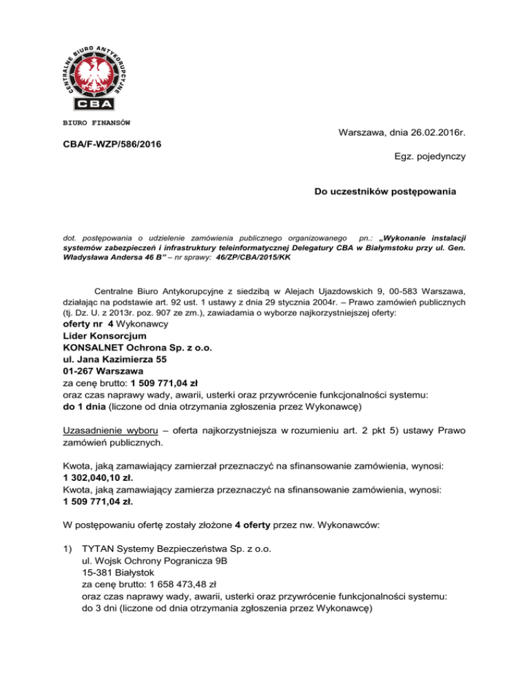 BIURO FINANSÓW Warszawa, dnia 26.02.2016r. CBA/F-WZP/586/2016 Egz. pojedynczy Do uczestników postępowania dot. postępowania o udzielenie zamówienia publicznego organizowanego pn.: „Wykonanie instalacji systemów zabezpieczeń i infrastruktury teleinformatycznej Delegatury CBA w Białymstoku przy ul. Gen. Władysława Andersa 46 B” – nr sprawy: 46/ZP/CBA/2015/KK Centralne Biuro Antykorupcyjne z siedzibą w Alejach Ujazdowskich 9, 00-583 Warszawa, działając na podstawie art. 92 ust. 1 ustawy z dnia 29 stycznia 2004r. – Prawo zamówień publicznych (tj. Dz. U. z 2013r. poz. 907 ze zm.), zawiadamia o wyborze najkorzystniejszej oferty: oferty nr 4 Wykonawcy Lider Konsorcjum KONSALNET Ochrona Sp. z o.o. ul. Jana Kazimierza 55 01-267 Warszawa za cenę brutto: 1 509 771,04 zł oraz czas naprawy wady, awarii, usterki oraz przywrócenie funkcjonalności systemu: do 1 dnia (liczone od dnia otrzymania zgłoszenia przez Wykonawcę) Uzasadnienie wyboru – oferta najkorzystniejsza w rozumieniu art. 2 pkt 5) ustawy Prawo zamówień publicznych. Kwota, jaką zamawiający zamierzał przeznaczyć na sfinansowanie zamówienia, wynosi: 1 302,040,10 zł. Kwota, jaką zamawiający zamierza przeznaczyć na sfinansowanie zamówienia, wynosi: 1 509 771,04 zł. W postępowaniu ofertę zostały złożone 4 oferty przez nw. Wykonawców: 1) TYTAN Systemy Bezpieczeństwa Sp. z o.o. ul. Wojsk Ochrony Pogranicza 9B 15-381 Białystok za cenę brutto: 1 658 473,48 zł oraz czas naprawy wady, awarii, usterki oraz przywrócenie funkcjonalności systemu: do 3 dni (liczone od dnia otrzymania zgłoszenia przez Wykonawcę) 2) QUMAK S.A. Al. Jerozolimskie 134 02-305 Warszawa za cenę brutto: 1 890 746,66 zł oraz czas naprawy wady, awarii, usterki oraz przywrócenie funkcjonalności systemu: do 1 dnia (liczone od dnia otrzymania zgłoszenia przez Wykonawcę) 3) API SMART Sp. z o.o. ul. Obrońców Westerplatte 2G 41-260 Sławków za cenę brutto: 1 522 414,59 zł oraz czas naprawy wady, awarii, usterki oraz przywrócenie funkcjonalności systemu: do 1 dnia (liczone od dnia otrzymania zgłoszenia przez Wykonawcę) 4) Konsorcjum Lider Konsorcjum KONSALNET Ochrona Sp. z o.o. ul. Jana Kazimierza 55 01-267 Warszawa Partner Konsorcjum KONSALNET Security Sp. z o.o. ul. Jana Kazimierza 55 01-267 Warszawa za cenę brutto: 1 509 771,04 zł oraz czas naprawy wady, awarii, usterki oraz przywrócenie funkcjonalności systemu: do 1 dnia (liczone od dnia otrzymania zgłoszenia przez Wykonawcę) Streszczenie oceny ofert i porównania ofert z punktacją przyznaną Wykonawcy w kryterium: cena: 90% czas naprawy wady, awarii, usterki oraz przywrócenie funkcjonalności systemu: 10% Numer oferty Liczba punktów w kryterium „cena oferty brutto” Liczba punktów w kryterium „czas naprawy wady, awarii, usterki oraz przywrócenie funkcjonalności systemu” 1 2 3 4 81,93 71,87 89,25 90,00 3,33 10,00 10,00 10,00 Liczba punktów razem 85,26 81,87 99,25 100,00 1. Umowa w sprawie zamówienia publicznego, zgodnie z art. 94 ust. 2 pkt. 3) lit. b) ustawy Pzp, może zostać zawarta przed upływem 5 dni od dnia przesłania zawiadomienia o wyborze najkorzystniejszej oferty. Dyrektor Biura Finansów Centralnego Biura Antykorupcyjnego w.z. Naczelnik Wydziału Wanda Romanowska