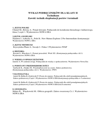 WYKAZ PODRĘCZNIKÓW DLA KLASY II Technikum Zawód: technik eksploatacji portów i terminali 1. JEZYK POLSKI Chmiel M., Równy A.: Ponad słowami. Podręcznik do kształcenia literackiego i kulturowego, klasa 2 część 1. Wydawnictwo NOWA ERA 2.JĘZYK ANGIELSKI Naunton J., Łubecka A., Polit B.: New Matura Explorer 2 Pre-Intermediate (kontynuacja) Wydawnictwo NOWA. ERA 3. JĘZYK NIEMIECKI Kryczyńska-Pham A., Szczęk J.: Fokus 3.Wydawnictwo WSiP 4. HISTORIA Roszak S., Kłaczkow J.: Poznać przeszłość. Wiek XX .(Kontynuacja podręcznika z kl.1) Wydawnictwo NOWA ERA 5. WIEDZA O SPOŁECZEŃSTWIE Janicki A.:W centrum uwagi. Podręcznik do wiedzy o społeczeństwie. Wydawnictwo Nowa Era 6. PODSTAWY PRZEDSIĘBIORCZOŚCI Garbacik K., Żmijko M.: Przedsiębiorczość na czasie. Zakres podstawowy. (Kontynuacja podręcznika z kl.1) Wydawnictwo PWN 7.MATEMATYKA Antek M.,Belka K.,Grafowski P.:Prosto do matury. Podręcznik dla szkół ponadgimnazjalnych. Zakres podstawowy.Część 1.Wydawnictwo NOWA ERA(kontynuacja podręcznika w I semestrze) Antek M.,Belka K.,Grabowski P.:Prosto do matury. Podręcznik dla szkół ponadgimnazjalnych. Zakres podstawowy.Część 2.Wydawnictwo NOWA ERA(ok.II semestru) 8. GEOGRAFIA Malarz R., Więckowski M.: Oblicza geografii. Zakres roszerzony.Cz.1. Wydawnictwo NOWA ERA