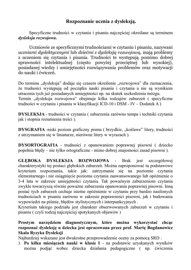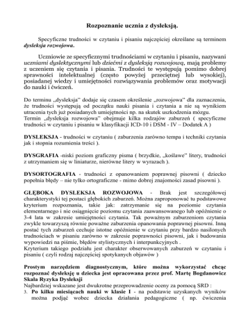 Rozpoznanie ucznia z dysleksją. Specyficzne trudności w czytaniu i pisaniu najczęściej określane są terminem dysleksja rozwojowa. Uczniowie ze specyficznymi trudnościami w czytaniu i pisaniu, nazywani uczniami dyslektycznymi lub dziećmi z dysleksją rozwojową, mają problemy z uczeniem się czytania i pisania. Trudności te występują pomimo dobrej sprawności intelektualnej (często powyżej przeciętnej lub wysokiej), posiadanej wiedzy i umiejętności rozwiązywania problemów oraz motywacji do nauki i ćwiczeń. Do terminu „dysleksja” dodaje się czasem określenie „rozwojowa” dla zaznaczenia, że trudności występują od początku nauki pisania i czytania a nie są wynikiem utracenia tych już posiadanych umiejętności np. na skutek uszkodzenia mózgu. Termin „dysleksja rozwojowa” obejmuje kilka rodzajów zaburzeń ( specyficzne trudności w czytaniu i pisaniu w klasyfikacji ICD-10 i DSM - IV – Dodatek A ) DYSLEKSJA - trudności w czytaniu ( zaburzenia zarówno tempa i techniki czytania jak i stopnia rozumienia treści ). DYSGRAFIA -niski poziom graficzny pisma ( brzydkie, „koślawe” litery, trudności z utrzymaniem się w liniaturze, nierówne litery w wyrazach ). DYSORTOGRAFIA - trudności z opanowaniem poprawnej pisowni ( dziecko popełnia błędy – nie tylko ortograficzne - mimo dobrej znajomości zasad pisowni ). GŁĘBOKA DYSLEKSJA ROZWOJOWA - Brak jest szczegółowej charakterystyki tej postaci głębokich zaburzeń. Można zaproponować tu podstawowe kryterium rozpoznania, takie jak: zatrzymanie się na poziomie czytania elementarnego i nie osiągnięcie poziomu czytania zaawansowanego lub opóźnienie o 3-4 lata w zakresie umiejętności czytania. Tak poważnym zaburzeniom czytania zwykle towarzyszą równie poważne zaburzenia opanowania poprawnej pisowni. Inną postać tych zaburzeń cechuje istotne opóźnienie w czytaniu przy bardzo nasilonych trudnościach w pisaniu zarówno w zakresie poprawności pisowni, jak i budowania wypowiedzi na piśmie, błędów stylistycznych i interpunkcyjnych . Kryterium takiego podziału jest charakter obserwowanych zaburzeń w czytaniu i pisaniu ( czyli rodzaj najczęściej spotykanych objawów ) Prostym narzędziem diagnostycznym, które można wykorzystać chcąc rozpoznać dysleksję u dziecka jest opracowana przez prof. Martę Bogdanowicz Skala Ryzyka Dysleksji Najbardziej wskazane jest dwukrotne przeprowadzenie oceny za pomocą SRD : 3. Po kilku miesiącach nauki w klasie I - na podstawie uzyskanych wyników można podjąć wobec dziecka działania pedagogiczne ( np. ćwiczenia logopedyczne, zajęcia korekcyjno-kompensacyjne ) 4. Z końcem roku szkolnego – pozwala to zweryfikować wstępną diagnozę, jak również sprawdzić czy podjęte działania przyniosły oczekiwane rezultaty. Jeżeli sytuacja nie uległa poprawie, należy skierować dziecko do poradni psychologiczno-pedagogicznej na pogłębione badania diagnostyczne. Należy podkreślić, że warunkiem rozpoznania ryzyka dysleksji jest wykluczenie niepełnosprawności intelektualnej, zaniedbań środowiskowych, a także zaburzeń w funkcjonowaniu narządów zmysłu ( np. niedosłuch czy poważną wada wzroku ). Kwestionariusz SRD zawiera 21 stwierdzeń dotyczących różnych symptomów ryzyka dysleksji. Cyfry wskazują stopień ich nasilenia : 1 – dane zachowanie ( symptom ) nie występuje nigdy 2 – dane zachowanie ( symptom ) występuje czasami 3 – dane zachowanie ( symptom ) występuje często 4 – dane zachowanie ( symptom ) występuje zawsze Po zakreśleniu przy każdym ze stwierdzeń jednej z ocen ( od 1 do 4 ), należy zsumować punktację i porównać ją z tabelą norm. 1 Dziecko ma trudności z zapamiętywaniem wszystkich liter. 1 2 3 4 2 Dziecko ma trudności w posługiwaniu się nożyczkami. 1 2 3 4 3 Dziecko ma wadę wymowy. 1 2 3 4 4 Dziecko jest mało sprawne ruchowo : słabo biega, skacze, źle jeździ na rowerze, hulajnodze. 5 Dziecko pisze litery i cyfry zwierciadlanie lub odwzorowuje wyrazy przez zapisywanie ich od strony prawej do lewej. 6 Dziecko przekręca słowa ( np. mówi kraktor ), zmienia przedrostki w wyrazach ( np. zauczyć się ), myli wyrazy o podobnym brzmieniu. 7 Dziecko nie umie odróżnić głosek o podobnym brzmieniu ( np. g - k, z - s ), dlatego nie dostrzega różnic w parach wyrazów, takich jak: góra – kura, koza – kosa. 8 Dziecko ma problemy z budowaniem poprawnych wypowiedzi (zmienia szyk wyrazów w zdaniu albo używa nieprawidłowych form gramatycznych). 9 Dziecko niechętnie bawi się układankami, klockami Lego, puzzlami lub nie umie układać ich według wzoru ( tworzy tylko własne kompozycje ). 10 Dziecko niechętnie uczestniczy w zabawach ruchowych. 1 2 3 4 1 2 3 4 1 2 3 4 1 2 3 4 1 2 3 4 1 2 3 4 1 2 3 4 11 Dziecko ma problemy z odróżnieniem i zapamiętaniem liter o kształtach 1 2 3 4 identycznych, lecz inaczej położonych w przestrzeni ( np. b – p – g – d ). 12 Dziecko niechętnie rysuje, pomimo że jest do tego zachęcane 1 2 3 4 13 Dziecko ma trudności z pamięciowym odtworzeniem materiału 1 2 3 4 uszeregowanego w sekwencje ( np. nazwy pory dnia i posiłków, dni tygodnia, pory roku, szeregi 4-cyfrowe ). 14 Dziecko ma trudności z koncentracją uwagi, łatwo się rozprasza. 1 2 3 4 15 Dziecko źle funkcjonuje na zajęciach fizycznych ( np. podczas gry w piłkę, 1 2 3 4 wykonywania układów gimnastycznych, ćwiczeń równoważnych, takich jak chodzenie po linii, stanie na jednej nodze ). 16 Dziecko ma trudności z odróżnieniem i zapamiętaniem liter o podobnych 1 2 3 4 kształtach ( np. m – n, l – t – ł ). 17 Dziecko ma trudności z wyróżnieniem głosek w słowach ( np. nos = n – o – 1 2 3 4 s ). 18 Dziecko ma problemy z odtwarzaniem szlaczków i figur geometrycznych 1 2 3 4 ( przerysowaniem rombu ze wzoru ). 19 Dziecko ma trudności z łączeniem głosek w słowo ( np. o – k – o = oko ). 1 2 3 4 20 Dziecko ma problemy z zawiązaniem sznurowadeł, 