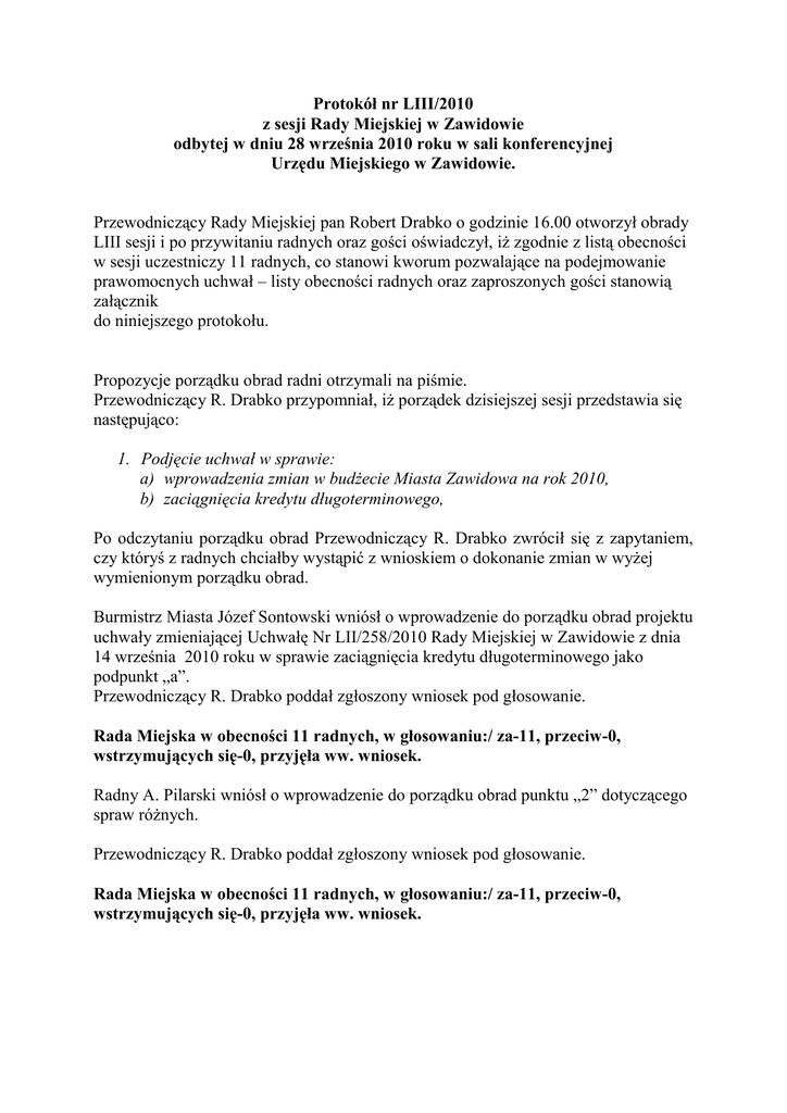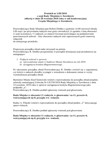 Protokół nr LIII/2010 z sesji Rady Miejskiej w Zawidowie odbytej w dniu 28 września 2010 roku w sali konferencyjnej Urzędu Miejskiego w Zawidowie. Przewodniczący Rady Miejskiej pan Robert Drabko o godzinie 16.00 otworzył obrady LIII sesji i po przywitaniu radnych oraz gości oświadczył, iż zgodnie z listą obecności w sesji uczestniczy 11 radnych, co stanowi kworum pozwalające na podejmowanie prawomocnych uchwał – listy obecności radnych oraz zaproszonych gości stanowią załącznik do niniejszego protokołu. Propozycje porządku obrad radni otrzymali na piśmie. Przewodniczący R. Drabko przypomniał, iż porządek dzisiejszej sesji przedstawia się następująco: 1. Podjęcie uchwał w sprawie: a) wprowadzenia zmian w budżecie Miasta Zawidowa na rok 2010, b) zaciągnięcia kredytu długoterminowego, Po odczytaniu porządku obrad Przewodniczący R. Drabko zwrócił się z zapytaniem, czy któryś z radnych chciałby wystąpić z wnioskiem o dokonanie zmian w wyżej wymienionym porządku obrad. Burmistrz Miasta Józef Sontowski wniósł o wprowadzenie do porządku obrad projektu uchwały zmieniającej Uchwałę Nr LII/258/2010 Rady Miejskiej w Zawidowie z dnia 14 września 2010 roku w sprawie zaciągnięcia kredytu długoterminowego jako podpunkt „a”. Przewodniczący R. Drabko poddał zgłoszony wniosek pod głosowanie. Rada Miejska w obecności 11 radnych, w głosowaniu:/ za-11, przeciw-0, wstrzymujących się-0, przyjęła ww. wniosek. Radny A. Pilarski wniósł o wprowadzenie do porządku obrad punktu „2” dotyczącego spraw różnych. Przewodniczący R. Drabko poddał zgłoszony wniosek pod głosowanie. Rada Miejska w obecności 11 radnych, w głosowaniu:/ za-11, przeciw-0, wstrzymujących się-0, przyjęła ww. wniosek. Po zmianie porządek obrad przedstawiał się następująco: 1. Podjęcie uchwał w sprawie: a) zmiany Uchwały Nr LII/258/2010 rady Miejskiej w Zawidowie z dnia 14 września 2010 roku w sprawie zaciągnięcia kredytu długoterminowego. b) wprowadzenia zmian w budżecie Miasta Zawidowa na rok 2010, c) zaciągnięcia kredytu długoterminowego, 2. Sprawy różne. Przewodniczący R. Drabko zaproponował, aby najpierw omówić projekty uchwał. a) zmiany Uchwały Nr LII/258/2010 rady Miejskiej w Zawidowie z dnia 14 września 2010 roku w sprawie zaciągnięcia kredytu długoterminowego Skarbnik Miasta Kazimiera Bilmon przekazała, iż na sesji poprzedniej podjęto uchwałę w sprawie zaciągnięcia kredytu długoterminowego na trzy zadania w wysokości 648.636 zł i do tego został sporządzony załącznik „Informacja o sytuacji finansowej gminy na okres spłaty 2010-2018”. Ogłaszając przetarg na kredyt na ten cel, bank zażądał od miasta opinii o możliwości spłaty kredytu. Wystąpiono do Regionalnej Izby Obrachunkowej, która poleciła, aby ostrożniej podejść do prognozy okresu spłaty kredytu i aby dokonać zmian po stronie dochodowej na lata 2010-2018 zmniejszając dochody do 2.000.000 zł. Skarbnik Miasta dodała, że być może te dochody pojawią się, jeśli będą prowadzone inwestycje i dochody majątkowe. Skarbnik Miasta oznajmiła, że w roku 2010 planowane są wydatki bieżące w wysokości 9.500.000 zł, gdzie na rok 2011 zaplanowano tylko 8.890.000 zł. Poproszono o wyjaśnienie z czego to wynika. W uzasadnieniu do Uchwały zostało zapisane, że wynika to z wykonania dodatkowych zadań związanych z powodzią. Skarbnik Miasta K. Bilmon oznajmiła, iż w momencie, kiedy zostanie podjęta Uchwała, gmina otrzyma opinię o możliwości spłaty kredytu. Radny Andrzej Pilarski zadał pytanie, o ile obniżono dochody w poszczególnych latach. Skarbnik Miasta K. Bilmon wyjaśniła, że nie obniżono dochodów lecz skorygowano prognozę do kwoty 11.000.000 zł z 13.000.000 zł, czyli średnio o 2.000.000 zł. Stwierdzono, że jeśli będzie wieloletnia prognoza finansowa gminy, to wtenczas będzie wiadomo jakie będą prognozy budżetu na przyszłe lata. Skarbnik Miasta dodała, że dochody skorygowano dla ostrożności. b) wprowadzenia zmian w budżecie Miasta Zawidowa na rok 2010 Skarbnik Miasta Kazimiera Bilmon przekazała, że pojawiły się nowe dochody w budżecie miasta i jest to przede wszystkim promesa Ministra Spraw Wewnętrznych i Administracji, z której wynika, że budżet otrzyma dotacje w wysokości 980.000 zł z przeznaczeniem na likwidację skutków powodzi. Skarbnik Miasta dodała, że środki te zostały wprowadzone do budżetu miasta po stronie dochodów i wydatków. Dodatkowo wpłynęła kwota 3.507 zł. z przeznaczeniem 1000 zł dla Szkoły Podstawowej na zakup środków czystości od firmy „ELZA” i 2.507 zł na odszkodowanie z „PZU” dla Przedszkola z tytułu zalania pomieszczeń. Środki uzyskane jako środki zewnętrzne w wysokości 9.800.000 zł dotacji zaproponowano podzielić i przeznaczyć 402.000 zł na naprawę ulic: Graniczna, Żeromskiego, Grunwaldzka, Niepodległości, Młynarska oraz most na ulicy Ostróżno. Z promesy wynika, że środki, które gmina otrzymała nie mogą zostać przeznaczone na opracowanie dokumentacji, jak również nadzór inspektora nadzoru i inwestorski. Dlatego propozycja jest taka, aby kwotę 87.500 zł zaciągnąć z kredytu na rynku krajowym z przeznaczeniem na opracowanie dokumentacji projektowo-kosztorysowej. Radny A. Pilarski zadał pytanie, na jakim etapie jest opracowywanie dokumentacji na to zadanie. Skarbnik Miasta oznajmiła, że dokumentacji nie ma, ponieważ zadanie nie zostało jeszcze wprowadzone do budżetu. Burmistrz Miasta Józef Sontowski dodał, że są prowadzone rozmowy w tym temacie. Radna Gabriela Micińska zauważyła, iż w dziale 600 zwiększa się wydatki na kwotę 402.000 zł, z przeznaczeniem na odbudowę ulic: Grunwaldzka, Graniczna, Żeromskiego, Niepodległości, Młynarska, Lubańska, Jana Pawła i Wierzbowa. Radna zadała pytanie, czy ta kwota wystarczy na taką liczbę ulic i czego dotyczy przebudowa. Burmistrz miasta wyjaśni
