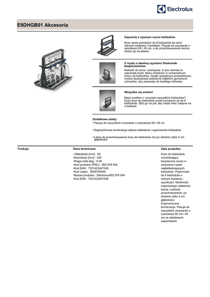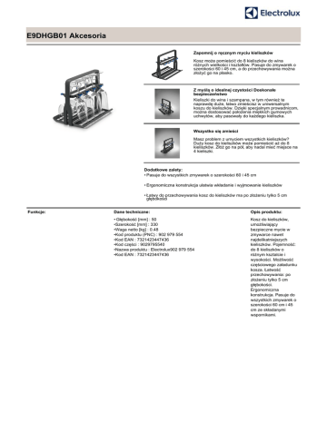 E9DHGB01 Akcesoria Zapomnij o ręcznym myciu kieliszków Kosz może pomieścić do 8 kieliszków do wina różnych wielkości i kształtów. Pasuje do zmywarek o szerokości 60 i 45 cm, a do przechowywania można złożyć go na płasko. Z myślą o idealnej czystości Doskonałe bezpieczeństwo Kieliszki do wina i szampana, w tym również te naprawdę duże, łatwo zmieścisz w uniwersalnym koszu do kieliszków. Dzięki specjalnym prowadnicom, można dostosować położenia miękkich gumowych uchwytów, aby pasowały do każdego kieliszka. Wszystko się zmieści Masz problem z umyciem wszystkich kieliszków? Duży kosz do kieliszków może pomieścić aż do 8 kieliszków. Złóż go na pół, aby nadal mieć miejsce na 4 kieliszki. Dodatkowe zalety: • Pasuje do wszystkich zmywarek o szerokości 60 i 45 cm • Ergonomiczna konstrukcja ułatwia wkładanie i wyjmowanie kieliszków • Łatwy do przechowywania kosz do kieliszków ma po złożeniu tylko 5 cm głębokości Funkcje: Dane techniczne: Opis produktu: • Głębokość [mm] : 50 •Szerokość [mm] : 330 •Waga netto [kg] : 0.48 •Kod produktu (PNC) : 902 979 554 •Kod EAN : 7321423447436 •Kod części : 9029795540 •Nazwa produktu : Electrolux902 979 554 •Kod EAN : 7321423447436 Kosz do kieliszków, umożliwiający bezpieczne mycie w zmywarce nawet najdelikatniejszych kieliszków. Pojemność: do 8 kieliszków o różnym ksztalcie i wysokości. Możliwość częściowego załadunku kosza. Łatwość przechowywania: po złożeniu tylko 5 cm głębokości. Ergonomiczna konstrukcja. Pasuje do wszystkich zmywarek o szerokości 60 cm i 45 cm ze składanymi wspornikami.