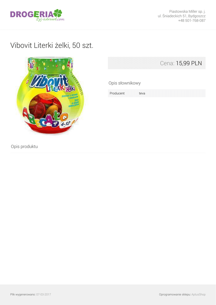 Piastowska Miller sp. j. ul. Śniadeckich 51, Bydgoszcz +48 501-768-087 Vibovit Literki żelki, 50 szt. Cena: 15,99 PLN Opis słownikowy Producent teva Opis produktu Plik wygenerowano: 07-03-2017 Oprogramowanie sklepu: AptusShop Piastowska Miller sp. j. ul. Śniadeckich 51, Bydgoszcz +48 501-768-087 Działanie: Vibovit Literki żelki powstał w trosce o zdrowie i prawidłowy rozwój dzieci na różnych etapach życia. Suplement diety jest źródłem wielu witamin i składników mineralnych, które odpowiadają za prawidłowe funkcjonowanie układu odpornościowego oraz nerwowego, wspomagają prawidłowy wzrost i rozwój kości oraz pomagają w prawidłowym funkcjonowaniu tarczycy. Składniki: Syrop Glukozowy, Cukier, Woda, Żelatyna Wieprzowa, Witamina C, Kwas Cytrynowy, Koncentrat Soku Pomarańczowego 0,2 %, Niacyna, Aromaty, Witamina E, Cynk,Wosk Carnauba, Kwas Pantotenowy, Koncentrat Soku z Czarnej Marchwi, Ekstrakt z Papryki, Kompleksy miedziowe Chlorofili i Chlorofilin, witamina A, Foliany, Selen, Biotyna, Witamina D, Witamina B12, Preparat może zawierać białka jaja. Składniki 1 żelka: Witamina C - 40 mg, Niacyna - 8,00 mg, Witamina E - 6,00 mg, Cynk - 5,00 mg, Kwas Pantotenowy - 3,00 mg, Witamina A - 400 mca, Kwas foliowy - 100 mca, Selen - 27,5 mca, Biotyna - 25 mca, witamina D - 2,5 mca, Witamina B12 - 1,25 mca. **Wskazania:** - dzieci powyżej 4 roku życia, - niedobory witamin i minerałów u dzieci, - obniżona odporność u dzieci, - nieprawidłowe funkcjonowanie układu nerwowego, - nieprawidłowe funkcjonowanie tarczycy, - osłabione kości zęby u dzieci. Zalecana dzienna porcja: Dzieci powyżej 4 roku 1 żelek dziennie. Plik wygenerowano: 07-03-2017 Oprogramowanie sklepu: AptusShop Piastowska Miller sp. j. ul. Śniadeckich 51, Bydgoszcz +48 501-768-087 Plik wygenerowano: 07-03-2017 Powered by TCPDF (www.tcpdf.org) Oprogramowanie sklepu: AptusShop
