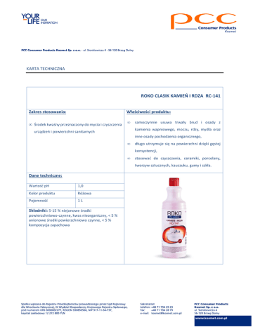 KARTA TECHNICZNA ROKO CLASIK KAMIEŃ I RDZA RC-141 Zakres stosowania: Właściwości produktu: • Środek kwaśny przeznaczony do mycia i czyszczenia • samoczynnie usuwa trwały brud i osady z kamienia wapniowego, moczu, rdzy, mydła oraz urządzeń i powierzchni sanitarnych inne osady pochodzenia organicznego, • długo utrzymuje się na powierzchni dzięki gęstej konsystencji, • stosować do czyszczenia, ceramiki, porcelany, tworzyw sztucznych, kauczuku, gumy i szkła. Dane techniczne: Wartość pH 1,0 Kolor produktu Różowa Pojemność 1L Składniki: 5-15 % niejonowe środki powierzchniowo-czynne, kwas nieorganiczny, < 5 % anionowe środki powierzchniowo czynne, < 5 % kompozycja zapachowa Sposób użycia: Ostrzeżenia i postępowanie Rozprowadzić preparat równomiernie za pomocą gąbki, szmatki lub bezpośrednio na czyszczonej powierzchni. Dla uzyskania lepszego rezultatu pozostawić na około 10 minut, po czym spłukać wodą. W przypadku silnych zabrudzeń czynność powtórzyć. Nie stosować do powierzchni wrażliwych na kwasy np. marmur, emalia, piaskowce, chrom Zagrożenia: Preparat drażniący, działa drażniąco na oczy, drogi oddechowe i skórę. Nie mieszać z innymi środkami czyszczącymi, a w szczególności na bazie chloru. Ostrzeżenia: Przechowywać pod zamknięciem i chronić przed dziećmi. Przechowywać pojemnik szczelnie zamknięty. Unikać zanieczyszczenia oczu i skóry. Zanieczyszczone oczy przemyć natychmiast dużą ilością wody i zasięgnąć porady lekarza. Nosić odpowiednie rękawice ochronne. W razie połknięcia, niezwłocznie zasięgnij porady lekarza – pokaż opakowanie lub etykietę. Xi – Produkt drażniący Informacje zawarte w niniejszej karcie technicznej podane są w dobrej wierze, w oparciu o aktualną wiedzę, doświadczenie wyniki badań. Zgodność parametrów dostarczonego wyrobu z niniejszą karta techniczną oraz przydatność wyrobu do zamierzonego zastosowania powinny być sprawdzone przed jego użyciem. Zastrzega się prawo wprowadzenie zmian do niniejszej karty technicznej będących skutkiem postępu.