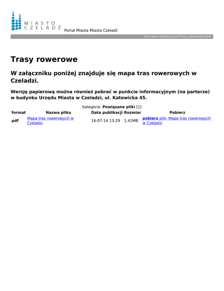 Portal Miasta Miasta Czeladź http://www.czeladz.pl/sport/Trasy_rowerowe/printpdf Trasy rowerowe W załączniku poniżej znajduje się mapa tras rowerowych w Czeladzi. Wersję papierową można również pobrać w punkcie informacyjnym (na parterze) w budynku Urzędu Miasta w Czeladzi, ul. Katowicka 45. format pdf Nazwa pliku Mapa tras rowerowych w Czeladzi kategoria: Powiązane pliki [1] Data publikacji Rozmiar 16-07-14 13:29 1.41MB Pobierz pobierz plik: Mapa tras rowerowych w Czeladzi
