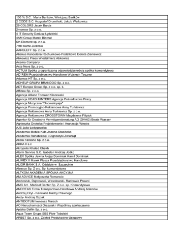 100 % S.C. Maria Bartków, Winicjusz Bartków 2 CODE S.C. Krzysztof Drumiński, Jakub Walkowicz 29 COLORS Jacek Burda 2morrow Sp. z o.o. 4 IT Security Dariusz Łydziński 4AM Group Marek Biernat 5th Element sp. z o.o. 7HR Kamil Zieliński AARSLEFF Sp. z o.o. Abakus Kancelaria Rachunkowo-Podatkowa Dorota Zieniewicz Abkowicz Press Włodzimierz Abkowicz Acema Company Acta Nova Sp. z o.o. ACTUM Spółka z ograniczoną odpowiedzialnością spółka komandytowa AD*REM Przedsiebiorstwo Handlowe Wojciech Teszner Adamus HT Sp. z o.o. ADHELP GRUPA BRANDOO Sp. z o.o. ADT Europe Group Sp. z o.o. sp. k. Affidea Sp. z o.o. Agencja Allianz Tomasz Kliszewski Agencja HEADHUNTERS Agencja Pośrednictwa Pracy Agencja Muzyczna "Onomatopeja" Agencja Promocyjno-Reklamowa Anny Turkiewicz Agencja Reklamowa Anny Turkiewicz Sp. z o.o. Agencja Reklamowa CROSSTOWN Magdalena Filipiuk Agentur für Deutsche Vermögensberatung AG (DVAG) Beata Wasser Agnieszka Drońska Projektowanie i Aranzacja Wnętrz AJS Julia Łodygowska Akademia Mobile Kids Joanna Stasińska Akademia Rehabilitacji i Dignostyki Zwierząt Akala Faraone Sp. z o.o. AKKA II s.c Akropolis Khaled Chekh Alarm Service S.C. Izabela i Andrzej Jośko ALEX Spółka Jawna Alojzy Dominiak Kamil Dominiak ALIMEX II Marek Flasza Przedsiębiorstwo Handlowe ALIOR BANK S.A. Oddziały w Szczecinie Alsecco Sp. Z o.o. Sp. komandytowa ALTKOM AKADEMIA SPÓŁKA AKCYJNA AM ADVICE Małgorzata Romancio Ambrożuk, Dąbrowski, Wesołowski- Radcowie Prawni AMC Art.. Medical Center Sp. Z o.o. sp. Komandytowa ANDREAS Firma Transportowo-Handlowa Andrzej Adamów Andrzej Oryl - Kanclaria Radcy Prawnego Andy- Andrzej Szpak ANTIDOTUM Ireneusz Marzch AO Nieruchomości Orszulak i Wspólnicy spółka jawna Apteka Delfin Sp. z o.o. Aqua Team Grupa SBS Piotr Tobolski ARBET Sp. z o.o. Zakład Produkcyjno-Usługowy Arena Szczecin Operator sp. z o.o. ARMON Arkadiusz Sadowski ARMS - s.c. mgr inż. A. Malcherek mgr inż. R. Szulżyk Art Baron Marek Baron Artpalstica Zakład Leczniczy sp. z o.o. sp. komandytowa AS Consulting Sp. Z o.o. ASD Sp. z o.o. ASK Sp. z o.o. Systemy Informatyczne Asmer Przedsiębiorstwo Prywatne ATA Szczecin Sp. z o.o. ATAKIO Sp. z o.o. ATLANTIC PRODUCTS Sp. z o.o. Aura Hanna Kulka Auto Ars Sp. J. PHU Roman Lubiński i Sławomir Kozakowski Auto Diesel Service Auto Handel Centrum Krotoski-Cichy Sp.j. Auto-Komis Carmax Artur Stempień AUTOMATYKA SERWIS E. Majdański Sp. Jawna BABEL ECKE Badania Marketingowe Sebastian Chomiak Baljo Hurt-Detal Banach Marcin BALTIC ART Sylwia Matczak BALTIC STEVEDORING COMPANY Sylwestrzak Sp. Jawna Baltic-Invest Consulting Michał Dudka Bank Gospodarki Żywnościowej S.A. Bank Ochrony Środowiska S.A. BANK POLSKA KASA OPIEKI S.A. Dyrekcja Regionu Szczecińskiego Bank Spółdzielczy Rzemiosła Bank Spółdzielczy w Goleniowie Bardins Sp. z o.o. Batex Barbara Podlaszuk - Gorska Bauart PHU S.C. BC Club Sp. z o.o. BDS s.c. Bella Moda Best Logistics Sp. Z o.o. BEST S.A. Szczecińskie Przedsiębiorstwo Budowlane Beyond.pl Sp. z o.o. BINOWO PARK Sp. z o.o. BIPRESS Agencja Promocyjno-Wydawnicza Biuro Księgowe Ewa Polonis Biuro Podatkowe mgr inż. Lidia Cecylia Sikorska Biuro Podróży Allegra sp. J. M. Palejczyk, P. Krzyszko Biuro Podróży BRITAS Sp. z o.o. Biuro Podróży INTERGLOBUS-TOUR s.c. Biuro Podróży Jaguar Travel K.E.Eliasz Biuro Projektów Konstruktor Plus Biuro Rachunkowe TAXMAN Biuro Rachunkowo – Podatkowe IZMAX Biznes Support Jurewicz Piotr Blue TN Spółka Jawna BM Polonia BMA Mariola Tukalska, Bogdan Tukalski Bobryk PHT BOGMAR Meble Spółka Cywilna Damian Pajdowski Andrzej Klugiewicz Bohnhorst Interhandel Sp. z o.o. BOHUN S.A. BP Service Center Grzegorz Sewerski BRATNIAK Studencka Spółdzielnia Pracy Bridgestone Stargard Sp. z o.o. BSL TECHNIKA SCENICZNA BTM T. Roszyk Przedsiębiorstwo Wielobranżowe Budolux Mariusz Stefanowicz Budowa Wystaw Targowych B. Mróz, K. Mróz S.C. - Zmiana BULK CARGO PORT SZCZECIN Sp. z o.o. BUTTERFLY Agnieszka Borowa Bwg Ebit Sp. Z o.o. BWM Jerzy Fiuk C.H.U. Manhattan Sp. Z o.o. C.M.C. Cosmetics Hurtownia Kosmetyki Profesjonalnej Celina Milejko CALBUD Sp. z o.o. Przesiębiorstwo Budowlane CALESCO Spółka Akcyjna Caveral Sp. J. CBR Cross Border Recruitment Sp. z o.o. Celowy Związek Gmin R-XXI Centrum Doradztwa i Kształcenia ARMADA S.C. Centrum Finansowe Janosik Anna Maria Sierakowska Centrum Innowacji Akademii Morskiej w Szczecinie Sp. Z o.o. Centrum Języków Obcych EFFEKT Magdalena Kotowicz Aleksandra Gromadzka spółka cywilna Centrum Kwiatowe Dariusz Kwaśny Centrum Organizacji Szkoleń i Konferencji SEMPER Centrum Rehabilitacji Terapia sp. Z o.o. CENTRUM ROZWOJU KARIERY "INTERDYDAKTYK" Ireneusz Przybyłowicz Centrum Rozwoju Społeczno - Gospodarczego Sp. z o.o. Centrum Szkolenia Igielski Logistyka - Transport Mieczysława Igielska Centrum Szkoleniowe Monika Gielar Centrum Wspierania Przedsiębiorczości SIGMA Tomasz Bilecki Centrum Zdrowia i Wypoczynku Ikar Sp. Z o.o. Centrum Zdrowia Urody i Rekreacji GEOVITA w Mrzeżynie Centuria sp. z o.o. Chłodnia Szczecińska Sp. z o.o. Chłodnoctwo-Klimatyzacja Robert Biernat CINEMA IMAGE Krzysztof Zając CIROKO Sp. z o.o. Przedsiębiorstwo Budowlane CLAR SYSTEM S.A. ClearSense S.A. Sp.k. Combidata Poland Sp. Z o.o. COMGRAPH Sp. z o.o. COMPENSA S.A. Towarzystwo Ubezpieczeń Oddział w Szczecinie Concordia Polska Towarzystwo Ubezpieczeń Wzajemnych o/Szczecin