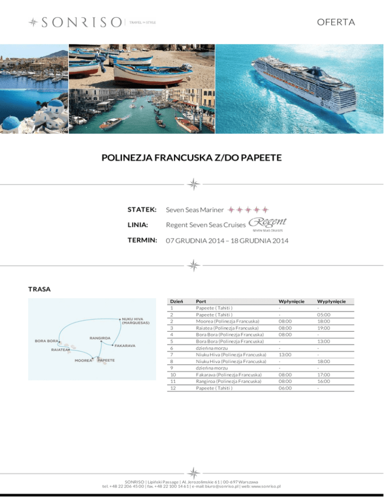 OFERTA POLINEZJA FRANCUSKA Z/DO PAPEETE STATEK: Seven Seas Mariner LINIA: Regent Seven Seas Cruises TERMIN: 07 GRUDNIA 2014 – 18 GRUDNIA 2014 TRASA Dzień 1 2 2 3 4 5 6 7 8 9 10 11 12 Port Papeete ( Tahiti ) Papeete ( Tahiti ) Moorea (Polinezja Francuska) Raiatea (Polinezja Francuska) Bora Bora (Polinezja Francuska) Bora Bora (Polinezja Francuska) dzień na morzu Niuku Hiva (Polinezja Francuska) Niuku Hiva (Polinezja Francuska) dzień na morzu Fakarava (Polinezja Francuska) Rangiroa (Polinezja Francuska) Papeete ( Tahiti ) Wpłynięcie 08:00 08:00 08:00 13:00 08:00 08:00 06:00 SONRISO | Lipiński Passage | Al. Jero zo limskie 61 | 00-697 Warszawa tel. +48 22 206 45 00 | fax. +48 22 100 14 61 | e-mail: biuro @so nriso .pl | web: www.so nriso .pl Wypłynięcie 05:00 18:00 19:00 13:00 18:00 17:00 16:00 - OFERTA CENA Typ kabiny Cena z osobę Deluxe Suite od 4 229 EUR Concierge Suite od 4 989 EUR Penthouse Suite od 7 259 EUR Seven Seas Suite od 9 529 EUR CENA ZAWIERA DOTATKOWE OPŁATY zakwaterowanie w 2 - os apartamencie wybranej kategorii pełne wyżywienie: 3 posiłki, przekąski między posiłakmi, bufet o północy korzystanie z restauracji tematycznych open bar: wybrane wina i szampany, alkohole premium, różnorodne kawy i herbaty, woda butelkowana, napoje bezalkoholowe oraz soki dostępne w barach i restauracjach korzystanie z mini baru w apartamencie serwis bagażowy podczas wejścia i zejścia ze statku obsługa kamerdynerska (dostępna w apartamentach od kategorii C) 24 godzinny serwis kabinowy korzystanie z urządzeń sportowo - rekreacyjnych dostępnych na pokładzie (baseny, jacuzzi, boiska sportowe, itp.) udział we wszystkich imprezach organizowanych na pokładzie (przedstawienia, pokazy, aukcje, animacje i inne) opłatę serwisową (napiwki) dla obsługi statku obowiązkowe opłaty portowe wybrane wycieczki fakultatywne dojazd/przelot do portu rozpoczęcia i zakończenia rejsu transfery (lotnisko - port - lotnisko) ewentualne noclegi przed lub po rejsie wycieczki fakultatywne korzystanie z usług typu: SPA, salon piękności, pralnia itp. wydatki osobiste tj. zakupy w butikach, internet, kasyno itp. obowiązkowe ubezpieczenie turystyczne koszt wymaganych wiz ewentualna opłata paliwowa (linia w momencie wzrotu cen ropy zastrzega sobie prawo do dodania oplaty paliwowej do każdej rezerwacji) Na życzenie świadczymy dodatkowo usługi: rezerwacje hotelowe na całym świecie rezerwacje biletów lotniczych, trasferów oraz parkingu w porcie rezerwacje wycieczek fakultatywnych i innych atrakcji SONRISO | Lipiński Passage | Al. Jero zo limskie 61 | 00-697 Warszawa tel. +48 22 206 45 00 | fax. +48 22 100 14 61 | e-mail: biuro @so nriso .pl | web: www.so nriso .pl