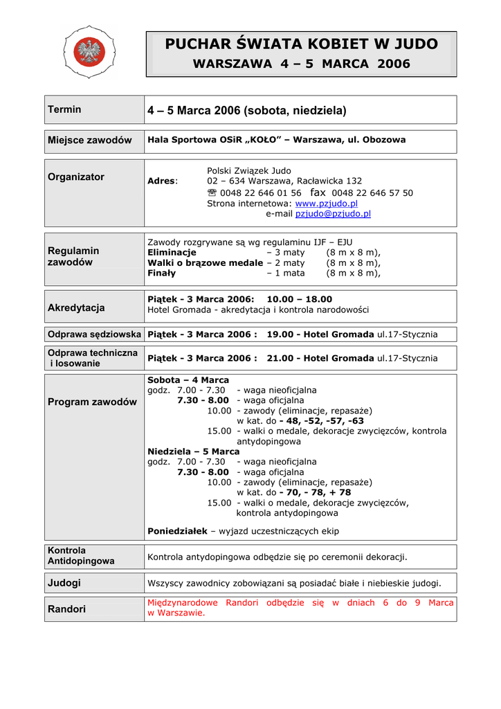 PUCHAR ŚWIATA KOBIET W JUDO WARSZAWA 4 – 5 MARCA 2006 Termin 4 – 5 Marca 2006 (sobota, niedziela) Miejsce zawodów Hala Sportowa OSiR „KOŁO” – Warszawa, ul. Obozowa Organizator Adres: Regulamin zawodów Zawody rozgrywane są wg regulaminu IJF – EJU Eliminacje – 3 maty (8 m x 8 m), Walki o brązowe medale – 2 maty (8 m x 8 m), Finały – 1 mata (8 m x 8 m), Akredytacja Piątek - 3 Marca 2006: 10.00 – 18.00 Hotel Gromada - akredytacja i kontrola narodowości Polski Związek Judo 02 – 634 Warszawa, Racławicka 132 ℡ 0048 22 646 01 56 fax 0048 22 646 57 50 Strona internetowa: www.pzjudo.pl e-mail [email protected] Odprawa sędziowska Piątek - 3 Marca 2006 : 19.00 - Hotel Gromada ul.17-Stycznia Odprawa techniczna i losowanie 21.00 - Hotel Gromada ul.17-Stycznia Program zawodów Piątek - 3 Marca 2006 : Sobota – 4 Marca godz. 7.00 - 7.30 - waga nieoficjalna 7.30 - 8.00 - waga oficjalna 10.00 - zawody (eliminacje, repasaże) w kat. do - 48, -52, -57, -63 15.00 - walki o medale, dekoracje zwycięzców, kontrola antydopingowa Niedziela – 5 Marca godz. 7.00 - 7.30 - waga nieoficjalna 7.30 - 8.00 - waga oficjalna 10.00 - zawody (eliminacje, repasaże) w kat. do - 70, - 78, + 78 15.00 - walki o medale, dekoracje zwycięzców, kontrola antydopingowa Poniedziałek – wyjazd uczestniczących ekip Kontrola Antidopingowa Kontrola antydopingowa odbędzie się po ceremonii dekoracji. Judogi Wszyscy zawodnicy zobowiązani są posiadać białe i niebieskie judogi. Randori Międzynarodowe Randori odbędzie się w dniach 6 do 9 Marca w Warszawie.