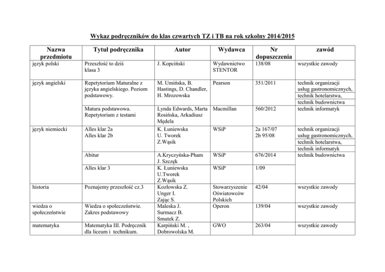 Wykaz podręczników do klas czwartych TZ i TB na rok szkolny 2014/2015 Nazwa przedmiotu Tytuł podręcznika Autor Wydawca Nr dopuszczenia zawód język polski Przeszłość to dziś klasa 3 J. Kopciński Wydawnictwo STENTOR 138/08 wszystkie zawody język angielski Repetytorium Maturalne z języka angielskiego. Poziom podstawowy. M. Umińska, B. Hastings, D. Chandler, H. Mrozowska Pearson 351/2011 Matura podstawowa. Repetytorium z testami Lynda Edwards, Marta Macmillan Rosińska, Arkadiusz Mędela K. Łuniewska WSiP U. Tworek Z.Wąsik 560/2012 technik organizacji usług gastronomicznych, technik hotelarstwa, technik budownictwa technik informatyk A.Kryczyńska-Pham J. Szczęk K. Łuniewska U.Tworek Z.Wąsik Kozłowska Z. Unger I. Zając S. Maleska J. Surmacz B. Smutek Z. Karpiński M. , Dobrowolska M. WSiP 676/2014 WSiP 1/09 Stowarzyszenie Oświatowców Polskich Operon 42/04 wszystkie zawody 139/04 wszystkie zawody GWO 263/04 wszystkie zawody język niemiecki Alles klar 2a Alles klar 2b Abitur Alles klar 3 historia Poznajemy przeszłość cz.3 wiedza o społeczeństwie Wiedza o społeczeństwie. Zakres podstawowy matematyka Matematyka III. Podręcznik dla liceum i technikum. 2a 167/07 2b 95/08 technik organizacji usług gastronomicznych, technik hotelarstwa, technik informatyk technik budownictwa fizyka i astronomia chemia podstawy przedsiębiorczości wychowanie fizyczne etyka Zakres podstawowy z rozszerzeniem. Fizyka dla szkół ponadgimnazjalnych Chemia. Kształcenie w zakresie podstawowym Braun M. Lech J. Podstawy przedsiębiorczości Etyka wychowanie do życia w rodzinie organizacja pracy w hotelarstwie ekonomia i prawo w hotelarstwie Organizacja pracy w hotelarstwie Ekonomia i prawo w hotelarstwie obsługa konsumenta Obsługa konsumenta w hotelarstwie, część II Obsługa informatyczna w hotelarstwie obsługa informatyczna w hotelarstwie ZamKor M. Poźniczek Z. Kluz WSiP DKOS-401583/02 16/05 Zbigniew Makieła Tomasz Rachwał Nowa Era 212/02 technik budownictwa technik organizacji usług gastronomicznych, technik hotelarstwa wszystkie zawody wszystkie zawody Jestem świadkiem Chrystusa w Rodzinie Wędrując ku dorosłości (Wychowanie do życia w rodzinie dla szkół ponadgimnazjalnych) religia Maria Fiałkowska P. Kołodziński, J. Kapiszewski Z. Marek OPERON 408/2011 wszystkie zawody WAM AZ-43-01/1/1 wszystkie zawody Teresa Król, Maria Ryś Wydawnictwo szkolne PWN 270/01 wszystkie zawody Sylwia Oparka, Teresa Nowicka Barbara Gołębiewska Anna Grontkowska Bogdan Klepacki Joanna Duda Sebastian Krzywda MARIA 7/2008 technik hotelarstwa abFORMAT 28/2007 REA 13/2008 Daniel Dmytrowski, Marcin Lichota, Anna Witkowska, Paweł Zięba REA 2012 marketing usług hotelarskich język angielski zawodowy rachunkowość i finanse w gastronomii marketing w gastronomii zasady żywienia technologia gastronomiczna obsługa konsumenta język angielski zawodowy technologia budownictwa podstawy projektowania Marketing w hotelarstwie Adam Stefański REA Hotels & Catering Express Publishing Język angielski zawodowy w turystyce i hotelarstwie Virginia Evans, Jenny Dooley, Veronica Garza Magdalena Samulczyk-Wolska Rachunkowość i finanse w gastronomii Hanna GórskaWarsewicz abFORMAT 2008 Marketing Edward Maliszewski abFORMAT 18/2007 E.Superczyńska M.ŻylińskaKaczmarek Technologia gastronomiczna z D.Górecka, obsługą konsumenta, część III M.Limanówka E.Superczyńska M.ŻylińskaKaczmarek Obsługa gości R. Szajna (konsumentów), część II D. Ławniczak A. Ziaja Highly recommended 2 Trish Stott, Alison Pohl Budownictwo z technologią 3. Mirski J. REA 12/2001 Format A-B 38/2006 REA 31/2008 Oxford University Press WSiP 07/95 Wstęp do projektowania architektonicznego. WSiP 15/03 Zasady żywienia Tauszyński K. 24/2007 WSiP technik organizacji usług gastronomicznych technik budownictwa konstrukcje budowlane kosztorysowanie organizacja robót budowlanych eksploatacja obiektów budowlanych język niemiecki zawodowy specjalizacja systemy operacyjne i Projektowanie obiektów użyteczności publicznej. Parczewski W. Tauszyński K. WSiP 02/00 Projektowanie architektoniczne i budownictwo regionalne. Bogusz W. WSiP 7/96 Konstrukcje stalowe. Konstrukcje budowlane 4. Konstrukcje z betonu. Konstrukcje budowlane 5. Kosztorysowanie i normowanie w budownictwie Organizacja budowy Włodarczyk W. WSiP 03/00 Pyrak S. WSiP 38/00 Kowalczyk Z., Zabielski J. WSiP 05/05 Maj T. WSiP 19/07 Eksploatacja obiektów budowlanych Maj T. WSiP 35/2011 Język niemiecki zawodowy w budownictwie Statyka budowli. Konstrukcje budowlane 1. Marzena Kucz, Maria Ratajczak Janik G. WSIP Wytrzymałość materiałów. Konstrukcje budowlane 2 Janik G. WSiP Posadowienie budowli, konstrukcje murowe i drewniane. Konstrukcje budowlane 3. Systemy operacyjne i sieci Pyrak S., Włodarczyk W. WSiP 01/00 Pytel Krzysztof, WSiP 2010 WSiP 06/2004 technik informatyk sieci komputerowe oprogramowanie biurowe programowanie strukturalne i obiektowe urządzenia techniki komputerowej multimedia i grafika komputerowa język angielski zawodowy zajęcia specjalizacyjne komputerowe cz.2 Osetek Sylwia Oprogramowanie biurowe Jaworski Radosław WSiP 55/2010 MEN Programowanie strukturalne i obiektowe Domka Przmysław, Łokińska Małgorzata WSiP 2010 Wojtuszkiewicz Krzysztof Mikom 38/2010 Tomasz Rudny Helion 24/2010 Virginia Evans, Jenny Dooley, Stanley Wright Tomasz Gądek Express Publishing Helion 2010 Roland Zimek Helion 2010 Urządzenia techniki komputerowej cz. I i cz. II Multimedia i grafika komputerowa Information Technology Photoshop. Od pomysłu do projektu Corel Draw X3