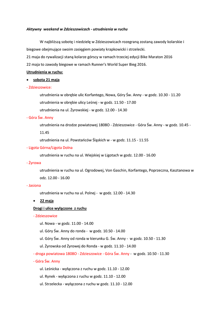 Aktywny weekend w Zdzieszowicach - utrudnienia w ruchu W najbliższą sobotę i niedzielę w Zdzieszowicach rozegraną zostaną zawody kolarskie i biegowe obejmujące swoim zasięgiem powiaty krapkowicki i strzelecki. 21 maja do rywalizacji staną kolarze górscy w ramach trzeciej edycji Bike Maraton 2016 22 maja to zawody biegowe w ramach Runner's World Super Bieg 2016. Utrudnienia w ruchu: • sobota 21 maja - Zdzieszowice: utrudnienia w obrębie ulic Korfantego, Nowa, Góry Św. Anny - w godz. 10.30 - 11.20 utrudnienia w obrębie ulicy Leśnej - w godz. 11.50 - 17.00 utrudnienia na ul. Żyrowskiej - w godz. 12.00 - 14.30 - Góra Św. Anny utrudnienia na drodze powiatowej 1808O - Zdzieszowice - Góra Św. Anny - w godz. 10.45 11.45 utrudnienia na ul. Powstańców Śląskich w - w godz. 11.15 - 11.55 - Ligota Górna/Ligota Dolna utrudnienia w ruchu na ul. Wiejskiej w Ligotach w godz. 12.00 - 16.00 - Żyrowa utrudnienia w ruchu na ul. Ogrodowej, Von Gaschin, Korfantego, Poprzeczna, Kasztanowa w odz. 12.00 - 16.00 - Jasiona utrudnienia w ruchu na ul. Polnej - w godz. 12.00 - 14.30 • 22 maja Drogi i ulice wyłączone z ruchu - Zdzieszowice ul. Nowa - w godz. 11.00 - 14.00 ul. Góry Św. Anny do ronda - w godz. 10.50 - 14.00 ul. Góry Św. Anny od ronda w kierunku G. Św. Anny - w godz. 10.50 - 11.30 ul. Żyrowska od Żyrowej do Ronda - w godz. 11.10 - 14.00 - droga powiatowa 1808O - Zdzieszowice - Góra Św. Anny - w godz. 10.50 - 11.30 - Góra Św. Anny ul. Leśnicka - wyłączona z ruchu w godz. 11.10 - 12.00 ul. Rynek - wyłączona z ruchu w godz. 11.10 - 12.00 ul. Strzelecka - wyłączona z ruchu w godz. 11.10 - 12.00 - Wysoka ul. Strzelecka - wyłączona z ruchu w godz. 11.10 - 12.00 - Ligota Górna ul. Wysocka - wyłączona z ruchu w godz. 11.15 - 12.30 - Ligota Dolna ul. Romantyczna - wyłączona z ruchu w godz. 11.15 - 12.30 ul. Wiejska - wyłączona z ruchu w godz. 11.15 - 12.30 - Oleszka ul. Wiejska - wyłączona z ruchu w godz. 11.30 - 13.00 ul. Kościuszki - wyłączona z ruchu w godz. 11.30 - 13.00 - Żyrowa ul. Wojska Polskiego - wyłączona z ruchu w godz. 11.15 - 13.30 ul. Leśna, Kasztanowa, Poprzeczna, Korfantego, Ogrodowa - wyłączone z ruchu w godz. 11.00 - 11.30 Więcej informacji na stronach organizatora www.bikemaraton.com i www.superbieg.pl