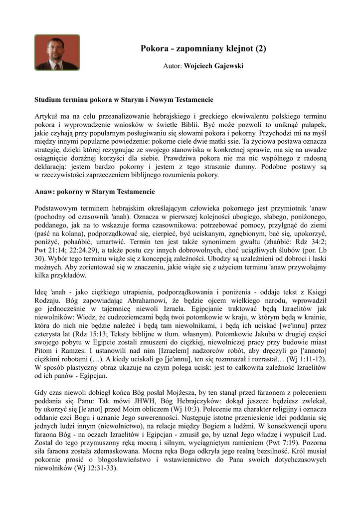 Pokora - zapomniany klejnot (2) Autor: Wojciech Gajewski Studium terminu pokora w Starym i Nowym Testamencie Artykuł ma na celu przeanalizowanie hebrajskiego i greckiego ekwiwalentu polskiego terminu pokora i wyprowadzenie wniosków w świetle Biblii. Być może pozwoli to uniknąć pułapek, jakie czyhają przy popularnym posługiwaniu się słowami pokora i pokorny. Przychodzi mi na myśl między innymi popularne powiedzenie: pokorne ciele dwie matki ssie. Ta życiowa postawa oznacza strategię, dzięki której rezygnując ze swojego stanowiska w konkretnej sprawie, ma się na uwadze osiągnięcie doraźnej korzyści dla siebie. Prawdziwa pokora nie ma nic wspólnego z radosną deklaracją: jestem bardzo pokorny i jestem z tego strasznie dumny. Podobne postawy są w rzeczywistości zaprzeczeniem biblijnego rozumienia pokory. Anaw: pokorny w Starym Testamencie Podstawowym terminem hebrajskim określającym człowieka pokornego jest przymiotnik 'anaw (pochodny od czasownik 'anah). Oznacza w pierwszej kolejności ubogiego, słabego, poniżonego, poddanego, jak na to wskazuje forma czasownikowa: potrzebować pomocy, przylgnąć do ziemi (paść na kolana), podporządkować się, cierpieć, być uciskanym, zgnębionym, bać się, upokorzyć, poniżyć, pohańbić, umartwić. Termin ten jest także synonimem gwałtu (zhańbić: Rdz 34:2; Pwt 21:14; 22:24.29), a także postu czy innych dobrowolnych, choć uciążliwych ślubów (por. Lb 30). Wybór tego terminu wiąże się z koncepcją zależności. Ubodzy są uzależnieni od dobroci i łaski możnych. Aby zorientować się w znaczeniu, jakie wiąże się z użyciem terminu 'anaw przywołajmy kilka przykładów. Ideę 'anah - jako ciężkiego utrapienia, podporządkowania i poniżenia - oddaje tekst z Księgi Rodzaju. Bóg zapowiadając Abrahamowi, że będzie ojcem wielkiego narodu, wprowadził go jednocześnie w tajemnicę niewoli Izraela. Egipcjanie traktować będą Izraelitów jak niewolników: Wiedz, że cudzoziemcami będą twoi potomkowie w kraju, w którym będą w krainie, która do nich nie będzie należeć i będą tam niewolnikami, i będą ich uciskać [we'innu] przez czterysta lat (Rdz 15:13; Teksty biblijne w tłum. własnym). Potomkowie Jakuba w drugiej części swojego pobytu w Egipcie zostali zmuszeni do ciężkiej, niewolniczej pracy przy budowie miast Pitom i Ramzes: I ustanowili nad nim [Izraelem] nadzorców robót, aby dręczyli go ['annoto] ciężkimi robotami (…). A kiedy uciskali go [je'annu], ten się rozmnażał i rozrastał… (Wj 1:11-12). W sposób plastyczny obraz ukazuje na czym polega ucisk: jest to całkowita zależność Izraelitów od ich panów - Egipcjan. Gdy czas niewoli dobiegł końca Bóg posłał Mojżesza, by ten stanął przed faraonem z poleceniem poddania się Panu: Tak mówi JHWH, Bóg Hebrajczyków: dokąd jeszcze będziesz zwlekał, by ukorzyć się [le'anot] przed Moim obliczem (Wj 10:3). Polecenie ma charakter religijny i oznacza oddanie czci Bogu i uznanie Jego suwerenności. Następuje istotne przeniesienie idei poddania się jednych ludzi innym (niewolnictwo), na relacje między Bogiem a ludźmi. W konsekwencji uporu faraona Bóg - na oczach Izraelitów i Egipcjan - zmusił go, by uznał Jego władzę i wypuścił Lud. Został do tego przymuszony ręką mocną i silnym, wyciągniętym ramieniem (Pwt 7:19). Pozorna siła faraona została zdemaskowana. Mocna ręka Boga odkryła jego realną bezsilność. Król musiał pokornie prosić o błogosławieństwo i wstawiennictwo do Pana swoich dotychczasowych niewolników (Wj 12:31-33). W swojej istocie pokora jawi się jako postawa korzącego się przed potężniejszym od siebie. Pokora skupia uwagę nie na osobie uniżonej, ale wskazuje na tego, który jest potężniejszy, i który ma w swoich rękach życie ukorzonego. Doskonale ilustruje to wizerunek poddanego padającego na twarz przed swoim władcą. Scenę taką możemy zauważyć w reliefie z IX w. przed Chr. Na steli król izraelski, Jehu, pada na twarz przed królem asyryjskim Salmanasarem III (por. Czarny obelisk Salmanasara III). Tora przedstawia Mojżesza jako tego, który całą swoją postawą wskazywał na Pana jako Boga i dlatego został nazwany człowiekiem, który był uniżony/pokorny ['anaw 'anijaw], najbardziej ze wszystkich ludzi, jacy chodzili po ziemi (Lb 13:3). Pokora Mojżesza urasta do rangi najważniejszej z cnót, jaką może charakteryzować się człowiek w swojej relacji do Boga. Nie oznacza utraty godności, staje się wręcz afirmacją świadomego człowieczeństwa. W odróżnieniu od faraona Mojżesz nie został upokorzony, ale sam się uniżył i przyjął postawę sługi całkowicie zależnego od Boga. Właśnie to pokorne, dobrowolne uniżenie przed Panem czyni Mojżesza najbardziej wyjątkowym ze wszystkich ludzi. Wyróżnienie pokory stanowi zapowiedź tego, czego Bóg będzie oczekiwał od swojego Ludu. Wyrazi to dobitnie prorok Micheasz (druga połowa VIII w. przed Chr.): Powiedziano ci człowieku, co jest dobre i czego JHWH oczekuje od ciebie: że będziesz czynić tylko Prawo, umiłujesz miłość oraz będziesz pokornie chodził z twoim Bogiem (Mi 6:8). W drodze do Ziemi Obiecanej Izraelici zostali wystawieni na szereg pokus, które odkrywały ich rzeczywiste intencje i motywacje, czyli mówiąc językiem biblijnym – serce: by cię ukorzyć ['annoteka], aby cię doświadczyć, aby poznać co jest w twoim sercu, czy będziesz przestrzegał jego nakazu, czy nie. I upokarzał cię [waje'anneka] i doświadczył głodem, ale też karmił cię manną (…), by dać ci poznać, że nie samym chlebem żyje człowiek, ale wszystkim co wychodzi z ust JHWH (Pwt 8:2-3). Przywołany tekst rzuca światło na rozumienie terminu anaw. Izraelici zostali wezwani, by uświadomić sobie, że są całkowicie zależni od Boga. Tak jak istota ludzka potrzebuje chleba, by żyć, tak potrzebuje również słowa Pana, by móc osiągnąć status pełni człowieczeństwa