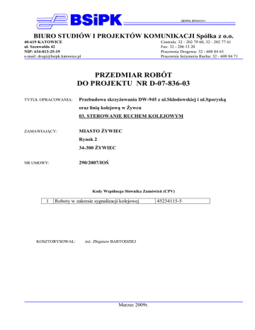 BIURO STUDIÓW I PROJEKTÓW KOMUNIKACJI Spółka z o.o. 40-619 KATOWICE ul. Szenwalda 42 NIP: 634-013-25-19 e-mail: [email protected] Centrala: 32 - 202 79 60, 32 - 202 77 61 Fax: 32 - 206 13 20 Pracownia Drogowa: 32 - 608 84 63 Pracownia Inżynieria Ruchu: 32 - 608 84 71 PRZEDMIAR ROBÓT DO PROJEKTU NR D-07-836-03 TYTUŁ OPRACOWANIA: Przebudowa skrzyżowania DW-945 z ul.Skłodowskiej i ul.Sporyską oraz linią kolejową w Żywcu 03. STEROWANIE RUCHEM KOLEJOWYM ZAMAWIAJĄCY: MIASTO ŻYWIEC Rynek 2 34-300 ŻYWIEC 290/2007/IOŚ NR UMOWY: Kody Wspólnego Słownika Zamówień (CPV) 1 Roboty w zakresie sygnalizacji kolejowej KOSZTORYSOWAŁ: inż. Zbigniew BARTODZIEJ Marzec 2009r. 45234115-5 Zabudowa urz dze srk oraz TVU na przejazdach kolejowych na terenie Zak adu Linii Kolejowych w Katowicach RACHUNEK ILO CIOWY Przebudowa skrzy owania DW-945 z ul. Sk odowskiej i ul. Sporysk oraz lini kolejow w ywcu Zabudowa urz dze srk oraz TVU na przejazdach kolejowych na terenie Zak adu Linii Kolejowych w Katowicach RACHUNEK IlO CIOWY NR 6 URZ DZENIA AUTOMATYKI KOLEJOWEJ BUDOWA URZ DZE SRK Przebudowa skrzy owania DW-945 z ul. Sk odowskiej ul. Sporysk oraz lini kolejow w ywcu RI 6 i Zabudowa urz dze srk oraz TVU na przejazdach kolejowych na terenie Zak adu Linii Kolejowych w Katowicach Przebudowa skrzy owania DW-945 z ul. Sk odowskiej i ul. Sporysk oraz lini kolejow w ywcu - Budowa urz dze srk Lp. 06.01.01 Nr pozycji Cz SST Nazwa elementu rozliczeniowego RACHUNEK ILO CIOWY RACHUNEK NR 6 URZ DZENIA AUTOMATYKI KOLEJOWEJ Jedn. miary Ilo Cena jedn. (z ) Rozdzia 1. Budowa sieci i kanalizacji kablowej Rów kablowy o g boko ci 1,0 m i szeroko ci 0,4 m m 550 Uk adanie - kabel sygnalizacyjny zbrojony 06.01.02 YKSY 10 x 1 m 225 06.01.03 YKSY 10 x 2,5 m 235 m 490 Uk adanie - kabel steruj cy 06.01.04 XTKMX pw 10x4x0,8 Uk adanie - kabel zasilaj cy 06.01.06 YKY 5 x 4 m 490 06.01.07 YKSY 7 x 2,5 m 225 Budowa kanalizacji kablowej 06.01.08 Kanalizacja RHDPEfi 110/6,3 - 3 otworowa m 30 06.01.09 Przepust rur RHDPEfi 110/6,3 m 36 06.01.10 Pomiar kabli odc 14 Razem rozdzia 1: Budowa sieci i kanalizacji kablowej Przenie do zbiorczego rachunku ilo ciowego nr 6 RI 6 str. 6/1 Warto (z ) Zabudowa urz dze srk oraz TVU na przejazdach kolejowych na terenie Zak adu Linii Kolejowych w Katowicach Przebudowa skrzy owania DW-945 z ul. Sk odowskiej i ul. Sporysk oraz lini kolejow w ywcu - Budowa urz dze srk Lp. Nr pozycji Cz SST Nazwa elementu rozliczeniowego RACHUNEK ILO CIOWY RACHUNEK NR 6 URZ DZENIA AUTOMATYKI KOLEJOWEJ Jedn. miary Ilo Rozdzia 2. Budowa aparatury sygnalizacji przejazdowej na przeje dzie kategorii A 06.02.01 Szafa aparaturowa typu SZOR 1024 z fundamentem kpl 1 06.02.02 Sygnalizator drogowy PHG ( arówka ) z fundamentem z dzonem Sygnalizator drogowy PHG ( arówka ) z fundamentem bez dwonu szt 1 kpl 3 06.02.03 Cena jedn. (z ) 06.02.04 Nap d rogatkowy ryglowany EEG-1 z fundament kpl 4 06.02.05 Dr gi rog.z latarkami ZAAk-07 kpl 2 06.02.06 Dr gi rog.z latarkami ZAAk-08 kpl 1 06.02.07 Dr gi rog.z latarkami ZAAk-08 kpl 1 06.02.08 Manipulator sterowania rogatkami 1102 szt 1 06.02.09 Oznakowanie przejazdu kpl 1 06.02.10 Uruchomienie przejazdu kpl 1 Razem rozdzia 2: Budowa aparatury sygnalizacji przejazdowej na przeje dzie kat.A Przenie do zbiorczego rachunku ilo ciowego nr 6 RI 6 str. 6/2 Warto (z ) Zabudowa urz dze srk oraz TVU na przejazdach kolejowych na terenie Zak adu Linii Kolejowych w Katowicach Przebudowa skrzy owania DW-945 z ul. Sk odowskiej i ul. Sporysk oraz lini kolejow w ywcu - Budowa urz dze srk Lp. Nr pozycji Cz Nazwa elementu rozliczeniowego RACHUNEK ILO CIOWY RACHUNEK NR 6 URZ DZENIA AUTOMATYKI KOLEJOWEJ Jedn. miary Ilo 06.03.01 Rozdzia 3. Dokumentacja powykonawcza , geodezja Dokumentacja powykonawcza , kpl 1 06.03.02 Geodezja kpl 1 Cena jedn. (z ) Razem rozdzia 3: Dokumentacja powykonawcza , geodezja Przenie do zbiorczego rachunku ilo ciowego nr 6 RI 6 str. 6/3 Warto (z ) Zabudowa urz dze srk oraz TVU na przejazdach kolejowych na terenie Zak adu Linii Kolejowych w Katowicach Przebudowa skrzy owania DW-945 z ul. Sk odowskiej i ul. Sporysk oraz lini kolejow w ywcu - Budowa urz dze srk RACHUNEK ILO CIOWY RACHUNEK NR 6 URZ DZENIA AUTOMATYKI KOLEJOWEJ Tytu Rozdzia Srtona ZBIORCZY RACHUNEK ILO CIOWYNR 6 URZ DZENIA AUTOMATYKI KOLEJOWEJ 1 Budowa sieci i kanalizacji kablowej 6/1 2 Budowa aparatury sygnalizacji przejazdowej na przeje dzie kategorii A 6/2 3 Dokumentacja powykonawcza , geodezja 6/3 RAZEM RACHUNEK NR 6 URZ DZENIA AUTOMATYKI KOLEJOWEJ PRZENIE DO OGÓLNEGO PODSUMOWANIA RACHUNKÓW ILO CIOWYCH O.P RI 6 str. 6/3 Warto (z ) Zabudowa urz dze srk oraz TVU na przejazdach kolejowych na terenie zak adu Linii Kolejowych w Katowicach RACHUNEK IlO CIOWY NR 8 URZ DZENIA AUTOMATYKI KOLEJOWEJ BUDOWA URZ DZE CZNO CI Przebudowa skrzy owania DW-945 z ul. Sk odowskiej Sporysk oraz lini kolejow w ywcu RI 8 i ul. Zabudowa urz dze srk oraz TVU na przejazdach kolejowych na terenie zak adu Linii Kolejowych w Katowicach Przebudowa skrzy owania DW-945 z ul. Sk odowskiej i ul. Sporysk oraz lini kolejow w ywcu - Budowa urz dze czno ci Lp. Nr pozycji Cz SST Nazwa elementu rozliczeniowego RACHUNEK ILO CIOWY RACHUNEK NR 8 URZ DZENIA CZNO CI KOLEJOWEJ Jedn. miary Ilo Cena jedn. (z ) Rozdzia 1. Uk adanie i przebudowa kabli 08.01.01 FTPf 4x2x0,5 m 1684 08.01.02 YKY 3x2,5 m 24 08.01.03 YKY 3x4 m 660 08.01.04 Ruroci g kablowy rur m 684 08.01.05 XTKMX pw 5x4x0,8 m 10 08.01.06 S upek SR VP 800 -AT/TSKV z osprz tem kpl 1 08.01.07 Mufa kablowa - Os ona XAGA szt 1 HDPE fi 40 - 2 otw. Razem rozdzia 1: Uk adanie i przebudowa kabli Przenie do zbiorczego rachunku ilo ciowego nr 8 RI 8 str. 8/1 Warto (z ) Zabudowa urz dze srk oraz TVU na przejazdach kolejowych na terenie zak adu Linii Kolejowych w Katowicach Przebudowa skrzy owania DW-945 z ul. Sk odowskiej i ul. Sporysk oraz lini kolejow w ywcu - Budowa urz dze czno ci Lp. Nr pozycji Cz SST Nazwa elementu rozliczeniowego RACHUNEK ILO CIOWY RACHUNEK NR 8 URZ DZENIA CZNO CI KOLEJOWEJ Jedn. miary Ilo Cena je