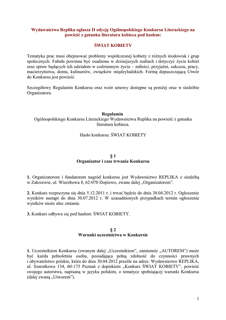 Wydawnictwo Replika ogłasza II edycję Ogólnopolskiego Konkursu Literackiego na powieść z gatunku literatura kobieca pod hasłem: ŚWIAT KOBIETY Tematyka prac musi obejmować problemy współczesnej kobiety z różnych środowisk i grup społecznych. Fabuła powinna być osadzona w dzisiejszych realiach i dotyczyć życia kobiet oraz spraw będących ich udziałem w codziennym życiu – miłości, przyjaźni, sukcesu, pracy, macierzyństwa, domu, kulinariów, związków międzyludzkich. Formą dopuszczającą Utwór do Konkursu jest powieść. Szczegółowy Regulamin Konkursu oraz wzór umowy dostępne są poniżej oraz w siedzibie Organizatora. Regulamin Ogólnopolskiego Konkursu Literackiego Wydawnictwa Replika na powieść z gatunku literatura kobieca. Hasło konkursu: ŚWIAT KOBIETY §1 Organizator i czas trwania Konkursu 1. Organizatorem i fundatorem nagród konkursu jest Wydawnictwo REPLIKA z siedzibą w Zakrzewie, ul. Wierzbowa 8, 62-070 Dopiewo, zwane dalej „Organizatorem”. 2. Konkurs rozpoczyna się dnia 5.12.2011 r. i trwać będzie do dnia 30.04.2012 r. Ogłoszenie wyników nastąpi do dnia 30.07.2012 r. W uzasadnionych przypadkach termin ogłoszenia wyników może ulec zmianie. 3. Konkurs odbywa się pod hasłem: ŚWIAT KOBIETY. §2 Warunki uczestnictwa w Konkursie 1. Uczestnikiem Konkursu (zwanym dalej „Uczestnikiem”, zamiennie „AUTOREM”) może być każda pełnoletnia osoba, posiadająca pełną zdolność do czynności prawnych i obywatelstwo polskie, która do dnia 30.04.2012 prześle na adres: Wydawnictwo REPLIKA, ul. Szarotkowa 134, 60-175 Poznań z dopiskiem „Konkurs ŚWIAT KOBIETY”, powieść swojego autorstwa, napisaną w języku polskim, o tematyce spełniającej warunki Konkursu (dalej zwaną „Utworem”). 1 2. Warunkiem uczestnictwa w Konkursie jest przesłanie wraz z Utworem podpisanej umowy udziału w Konkursie, będącej załącznikiem do niniejszego Regulaminu. Zgłoszenia niezawierające podpisanej umowy będą pozostawiane bez rozpatrzenia. 3. Utworem konkursowym nie może być tekst, który częściowo lub w całości był publikowany w którymkolwiek z mediów lub został zgłoszony do innego konkursu. 4. Odstąpienie od udziału w Konkursie po nadesłaniu do WYDAWCY Utworu oraz odstąpienie przez AUTORA od podpisania z WYDAWCĄ umowy wydawniczej w wypadku przyznania nagrody głównej bądź wyróżnienia w Konkursie jest zabronione. 5. Naruszenie przez Uczestnika Konkursu któregokolwiek z wymienionych powyżej warunków spowoduje utratę prawa do otrzymania nagrody. §3 Tematyka prac 1. Tematyka prac musi obejmować problemy współczesnej kobiety z różnych środowisk i grup społecznych. Fabuła powinna być osadzona w dzisiejszych realiach i dotyczyć życia kobiet, spraw będących ich udziałem w codziennym życiu – miłości, przyjaźni, sukcesu, pracy, macierzyństwa, kulinariów, związków międzyludzkich. 2. Formą dopuszczającą Utwór do Konkursu jest powieść. §4 Zasady Konkursu 1. Aby wziąć udział w Konkursie, należy przesłać do dnia 30.04.2012 r. Utwór swojego autorstwa (decyduje data stempla pocztowego) w postaci wydruku (interlinia 1,5; czcionka: 12 pkt; margines prawy 4 cm) oraz dołączyć Utwór na nośniku elektronicznym, w stanie identycznym z wydrukiem, na adres: Wydawnictwo Replika, ul. Szarotkowa 134, 60-175 Poznań. 2. Minimalna objętość Utworu to 8 arkuszy wydawniczych, czyli 320 tys. znaków liczonych razem ze spacjami. 3. Konkurs jest anonimowy. Utwór nie może być podpisany imieniem i nazwiskiem na żadnej ze stron i powinien zawierać jedynie godło AUTORA. W osobnej, zamkniętej kopercie należy dołączyć do Utworu kartkę z danymi AUTORA i godłem (tym samym, co na maszynopisie) oraz umowę o uczestnictwo w Konkursie. Dane AUTORA powinny zawierać: imię, nazwisko, adres zamieszkania, rok urodzenia, nr telefonu kontaktowego oraz adres email. 2 4. Nagrodą główną w Konkursie jest nagroda pieniężna w wysokości 5.000,00 zł (słownie: pięć tysięcy złotych 00/100) oraz publikacja Utworu przez Wydawnictwo Replika, w języku polskim, w formie książkowej. 5. Organizator, oprócz nagrody głównej, przyznaje dwa wyróżnienia. Wyróżniony Utwór zostanie opublikowany w języku polskim, w formie książkowej, a AUTORZY wyróżnionych Utworów otrzymają nagrody pieniężne w wysokości 1.500,00 zł (słownie: jeden tysiąc pięćset złotych 00/100) każda. 6. Główna nagroda i wyróżnienia w formie nagród pieniężnych stanowią jednocześnie zaliczkę na poczet honorarium należnego AUTOROWI z tytułu sprzedaży książki. Wartość nagród określona w § 4 pkt 6 i 7 Regulaminu jest wartością brutto. Organizator odprowadzi od wartości tych nagród należny podatek dochodowy zgodnie z przepisami obowiązującymi w tym zakresie. 7. Organizator, oprócz nagród pieniężnych, przyzna nagrodzonym oraz wyróżnionym także nagrody rzeczowe. 8. Nagrody w Konkursie przyznaje jury. Skład jury określa Organizator. Informacja o składzie jury pojawi się na stronie internetowej Organizatora po ogłoszeniu wyników Konkursu. 9. Jury ma prawo do nieprzyznania nagrody głównej lub innego rozdziału nagród i wyróżnień. 10. Ogłoszenie wyników Konkursu nastąpi do dnia 30.07.2012 r. poprzez zamieszczenie na stronie internetowej Organizatora (www.replika.eu) informacji o rozstrzygnięciu Konkursu, zawierającej tytuł nagrodzonego Utworu oraz godło AUTORA. 11. Organizator nie zwraca nadesłanych prac ani nie odpowiada za zagubienie maszynopisu. 12. Organizator nie recenzuje pisemnie ani ustnie prac, które nie zostały nagrodzone ani wyróżnione w Konkursie. 13. Utwory, które nie zostały nagrodzone, również mają szansę na publikacje. W takim przypadku Organizator może skontaktować się z AUTOREM Utworu najpóźniej w ciągu jednego roku od dnia ogłoszenia wyniku Konkursu. 14. Zgłoszenia niespełniające wymogów konkursowych wskazanych w § 4 Regulaminu mogą by