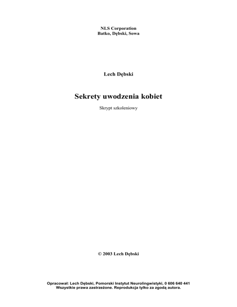 NLS Corporation Batko, Dębski, Sowa Lech Dębski Sekrety uwodzenia kobiet Skrypt szkoleniowy © 2003 Lech Dębski Opracował: Lech Dębski, Pomorski Instytut Neurolingwistyki, 0 606 640 441 Wszystkie prawa zastrzeżone. Reprodukcja tylko za zgodą autora. NASTAWIENIE W tradycyjnym podejściu mężczyzna starał się o kobietą, a ona go przyjmowała lub odrzucała. A co by było, gdybyś właśnie ty stał się dla kobiety wyjątkową i niepowtarzalną okazją do przeżycia tego, o czym zawsze marzyła? Gdybyś wzbudzał w niej uczucia i stany jakich nikt inny nie potrafi w niej wywołać? Gdybyś stanowił dla niej wyzwanie, któremu musi sprostać byś się nią zainteresował? Z tego względu nie proś, nie błagaj o jej łaski. Zamiast tego: 1) Stanów dla niej wyzwanie 2) Ustanawiaj okazje 3) Wywołuj w niej procesy i stany emocjonalne Zasady NLS 1) Jesteś najlepszym wyborem, którego może dokonać kobieta. Jeśli nie skorzysta z tej okazji- jej strata. Jest wiele innych kobiet które docenią dar którym jesteś. 2) Nie ma kobiety której nie możesz uwieść. Każda z nich marzy o idealnym kochanku. Ty nim jesteś. Wystarczy, że pomożesz jej to sobie uświadomić. 3) Demonstruj swoją gotowość do odejścia, jeśli nie dorównuje twoim standardom. To ty jesteś nagrodą dla niej, nie ona dla ciebie. Musi wiedzieć, że może cię stracić. 4) Daj jej posmakować tego, co masz do zaoferowania i niech pracuje by dostać więcej. Daj darmową próbkę, a nie rozdawaj całego sklepu! 5) Znaj swa wartość i niech ona też ją zna! 6) To, co mówisz, powinno zawsze mieć swój cel. Nie gadaj bez sensu, myśl o stanach które chcesz w niej wywołać i kieruj rozmową w odpowiednim kierunku. 7) Celem komunikacji jest uzyskanie rezultatu. Twoim celem nie jest udzielanie jej informacji czy dzielenie się swoimi poglądami. Twoim celem jest takie kierowanie jej nieświadomymi procesami, by wywołać w niej właściwe stany emocjonalne. 8) Utrzymuj w tajemnicy swoje umiejętności. Nie rób "ha, ha, właśnie cię uwodzę", lecz "czy to nie ciekawe, jak działa umysł?" 9) Baw się dobrze. Nie bądź zdesperowany- "muszę ją zdobyć za wszelką cenę". Podchodź do sedukcji z nastawieniem: JAK DOBRZE BĘDĘ SIĘ BAWIĆ, EKSPERYMENTUJĄC Z WYWYOŁYWANIEM RÓŻNYCH STANÓW EMOCJONALNYCH W TEJ KOBIECIE? 10) PRAKTYKA, PRAKTYKA, PRAKTYKA !!!! Opracował: Lech Dębski, Pomorski Instytut Neurolingwistyki, 0 606 640 441 Wszystkie prawa zastrzeżone. Reprodukcja tylko za zgodą autora. WYRAŻENIA WPROWADZAJĄCE Wyrażenia wprowadzające służą wprowadzaniu poleceń w sposób niezauważalny dla umysłu kobiety. 1. Czy kiedykolwiek... 2. Jakby to było, gdybyś... 3. Gdybyś miała... 4. Kiedy ty... 5. Jak bardzo się zdziwisz... 6. To ciekawe, że... 7. Jak to jest, gdy... 8. Czy pamiętasz, jak to było, gdy ostatni (pierwszy) raz... 9. Można/ ludzie mogą/ ktoś może... 10. Podczas gdy... 11. Czasem ludzie czują... 12. Czy to nie dziwne, że... 13. Negacje: - Nie musisz... - Naprawdę nie powinnaś... - Nie jest konieczne żebyś... - Wielka szkoda, że nie możesz... Opracował: Lech Dębski, Pomorski Instytut Neurolingwistyki, 0 606 640 441 Wszystkie prawa zastrzeżone. Reprodukcja tylko za zgodą autora. - WYRAŻENIA TRANSOWE - zauważyć stwierdzić przekonać się że zdać sobie sprawę uświadomić sobie wyobrazić sobie przypomnieć sobie jak pozwolić sobie w pewnej chwili nagle nieoczekiwanie z jakichś tajemniczych powodów znajdziesz się gdybyś miała udawać ciekawość zrozumieć odkryć WIELOZNACZNOŚCI - ile można zdziałać językiem wejdźmy w to głęboko weź głęboko oddech postawmy sprawę wyraźnie zrobić dobrze coś nabrzmiewa między nami i musimy to poruszyć uda otworzyć się na... ten problem który nabrzmiewa w twoich ustach brzmi inaczej dopuścić do siebie dochodzić raz za razem, do wniosku że... czy przeżyłaś kiedykolwiek dogłębną przyjemność? Przyjemność tak wielką, że masz ochotę to ciągnąć (pk) i smakować w nieskończoność wprowadzić oddać się Opracował: Lech Dębski, Pomorski Instytut Neurolingwistyki, 0 606 640 441 Wszystkie prawa zastrzeżone. Reprodukcja tylko za zgodą autora. ROZPOCZĘCIA Są to zwroty, pozwalające na wprowadzenie interesującego tematu lub patternu tak, by wyglądało to na część zwyczajnej rozmowy. - "Zastanawiałem się ostatnio nad..." - "Rozmawiałem ostatnio z moja przyjaciółką i powiedziała że..." - "Czy myślałaś kiedyś o..." - "Czytałem fascynujący artykuł o..." - ""To interesujące jak ludzie..." Struktura rozmowy: ułóż patterny w 3 poziomach: 1) Zacytuj artykuł, program TV lub radiowy Czytałem ciekawy artykuł o tym , jak ludzie zawierają znajomości. Często się myśli, że przeciwieństwa się przyciągają, lecz tak naprawdę to co nas pociąga w drugiej osobie (pk) to, to co mamy z nią wspólnego. Czy kiedykolwiek spotkałaś kogoś i od razu wiedziałaś że coś cię z nim łączy? Że po prostu patrzyłaś na tą osobę i od razu poczułaś ten klik ( pokaż na jej splot słoneczny) i patrząc na tą osobę (ps) wiedziałaś, że jest to ktoś komu możesz zaufać i czułaś, że nawet po latach będziesz wspominać ten dzień jako początek czegoś wspaniałego. 2) Zacytuj koleżankę lub przyjaciółkę (która może się z tym zgodzić lub nie) Rozmawiałem o tym z moją przyjaciółką Renatą i opowiedziała mi jak to jest gdy poznaje kogoś interesującego to dla niej to jest tak, że nagle czujesz jak ci bije serce... jak oddychasz... i to uczucie narastającej fascynacji tą osobą... i patrzysz na tego człowieka z którym rozmawiasz... i jakiś szczegół na jego twarzy przyciąga twoją uwagę.. a cała reszta otoczenia zanika... i cały świat staje się tą osobą... tym głosem który wnika w ciebie.... budząc różne... mmmm ... uczucia... 3) Wyraź swoją opinię I pomyślałem że to jest zupełnie tak jak wtedy gdy zakochujesz się w jakiej