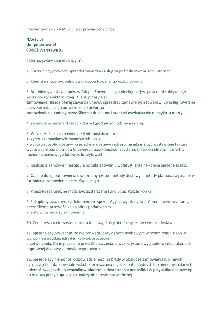 Internetowy sklep NAVEL.pl jest prowadzony przez: NAVEL.pl skr. pocztowa 16 00-981 Warszawa 91 dalej nazywany „Sprzedającym”. 1. Sprzedający prowadzi sprzedaż towarów i usług za pośrednictwem sieci Internet. 2. Klientem może być pełnoletnia osoba fizyczna lub osoba prawna. 3. Do dokonywania zakupów w Sklepie Sprzedającego niezbędne jest posiadanie aktywnego konta poczty elektronicznej. Klient, przesyłając zamówienie, składa ofertę zawarcia umowy sprzedaży zamawianych towarów lub usług. Wysłane przez Sprzedającego potwierdzenie przyjęcia zamówienia na podany przez Klienta adres e-mail stanowi oświadczenie o przyjęciu oferty. 4. Zamówienia można składać 7 dni w tygodniu 24 godziny na dobę. 5. W celu złożenia zamówienia Klient musi dokonać: • wyboru zamawianych towarów lub usług, • wyboru sposobu dostawy oraz adresu dostawy i adresu, na jaki ma być wystawiona faktura, wyboru sposobu płatności (przelew za pośrednictwem systemu płatności elektronicznych z rachunku bankowego lub karty kredytowej) 6. Realizacja zamówień następuje po zaksięgowaniu wpłaty Klienta na koncie Sprzedającego. 7. Czas realizacji zamówienia uzależniony jest od metody dostawy i metody płatności wybranej w formularzu zamówienia przez Kupującego. 8. Przesyłki zagraniczne mogą być dostarczane tylko przez Pocztę Polską. 9. Zakupiony towar wraz z dokumentem sprzedaży jest wysyłany za pośrednictwem wybranego przez Klienta przewoźnika na adres podany przez Klienta w formularzu zamówienia. 10. Cena towaru nie zawiera kosztu dostawy, który określony jest w cenniku dostaw. 11. Sprzedający oświadcza, że nie prowadzi bazy danych osobowych w rozumieniu ustawy o tychże i nie poddaje ich jakimkolwiek procesom przetwarzania. Dane przesłane przez Klienta zostaną wykorzystane wyłącznie w celu dokonania poprawnej dostawy zamówionego towaru. 12. Sprzedający nie ponosi odpowiedzialności za błędy w obsłudze zamówienia lub innych dyspozycji Klienta, powstałe wskutek przekazania przez Klienta błędnych lub niepełnych danych, uniemożliwiających przewoźnikowi skuteczne dostarczenie przesyłki. (W przypadku dostawy np. do miejsca pracy Kupującego, należy dookreślić nazwę firmy). 13. Sprzedający zapewnia Klientowi poprawność działania sklepu internetowego w następujących przeglądarkach: IE wersja 7 lub nowsza, FireFox wersja 3 lub nowsza, Opera wersja 9 lub nowsza, Chrome, Safari z zainstalowanymi najnowszymi wersjami JAVA i FLASH, na ekranach o rozdzielczości poziomej powyżej 1024 px. Używanie oprogramowania firm trzecich mających wpływ na funkcjonowanie i funkcjonalność przeglądarek: Internet Explorer, FireFox, Opera, Chrome, Safari może mieć wpływ na poprawne wyświetlanie sklepu, dlatego w celu uzyskania pełnej funkcjonalności sklepu, należy je wszystkie wyłączyć. 14. W sprawach nieuregulowanych niniejszym regulaminem stosuje się odpowiednie obowiązujące przepisy prawne. Kwestie sporne rozpatruje sąd właściwy miejscowo i rzeczowo. ZWROTY I REKLAMACJE Adres do zwrotów i reklamacji: NAVEL.pl skr. pocztowa 16 00-981 Warszawa 91 ZWROTY 1. Klient ma prawo do odstąpienia od umowy bez podania przyczyn, według ogólnych zasad wynikających z przepisów dotyczących zawierania umów na odległość, w okresie dziesięciu dni od dostarczenia zamówionego towaru. 2. Zwrotowi nie podlega towar po usunięciu przez Klienta oryginalnego opakowania (foliowanie). 3. Sprzedający w ciągu pięciu dni dokona zwrotu przesyłki dokona zwrotu pieniędzy na rachunek, z którego dokonano płatności. Zwrot pieniędzy dokonywany jest na podstawie formularza zwrotu załączonego do zwrotnej przesyłki. 4. Zwrotowi nie podlegają koszty dostawy a koszty przesyłki zwrotnej obciążają Klienta. REKLAMACJE 1. Klient ma prawo reklamowania zakupionego towaru, jeśli ten posiada wady fabryczne, został uszkodzony w trakcie transportu bądź nie został dostarczony przez przewoźnika. 2. W celu dokonania reklamacji wadliwego towaru należy go odesłać przesyłką poleconą ekonomiczną na adres Sprzedającego wraz z wypełnionym protokołem reklamacji. 3. Czas na ustosunkowanie się do reklamacji wynosi 14 dni od momentu dostarczenia do Sprzedającego reklamowanego towaru lub 14 dni od momentu otrzymania przez Sprzedającego prawidłowo wypełnionego protokołu reklamacji. 4. W przypadku pozytywnego rozpatrzenia reklamacji produkt zostanie wymieniony na pełnowartościowy. Jeżeli z powodu jego braku będzie to nie możliwe zwrócimy pieniądze wraz z kosztami dostawy. 5. Koszty związane z przesłaniem reklamacji zostaną zwrócone, jeżeli do reklamacji zostanie dołączone oświadczenie wraz z określeniem wartości poniesionych kosztów. Uwaga! Zarówno w przypadku zwrotów jak i reklamacji Sprzedający nie przyjmuje przesyłek za pobraniem. Protokół reklamacyjny formularz zwrotu DOSTAWA Koszt dostawy zależy od wybranej metody dostawy. Wysyłamy najszybciej, jak to możliwe, zazwyczaj w ciągu 1 dnia roboczego od dnia zaksięgowania wpłaty na nasze konto. Książki wysyłamy zapakowane w kopertę bąbelkową. Koszty dostawy na terenie Polski: - list polecony ekonomiczny (Poczta Polska): 9zł - list polecony priorytetowy (Poczta Polska): 11 zł - paczkomaty In Post: 9 zł - kurier: 17 zł Czas doręczenia na terenie Polski: - list polecony ekonomiczny (Poczta Polska): 3-5 dni - list polecony priorytetowy (Poczta Polska): 2 dni - paczkomaty In Post: 2 dni - kurier: 1-2 dni Koszty dostawy do Europy (łącznie z Cyprem, całą Rosją i Izraelem): - list polecony priorytetowy (Poczta Polska): 21 zł Koszty dostawy poza granice Europy: - list polecony priorytetowy (Poczta Polska): 25 zł Czas doręczenia do Europy (łącznie z Cyprem, całą Rosją i Izraelem) oraz do Ameryki Północnej i Afryki zgodnie z wykazem zamieszczonym przez Pocztę Polską: http://cennik.poczta-polska.pl/plik,1/Cennik_Zagraniczny_Informacje_dodatkowe.pdf