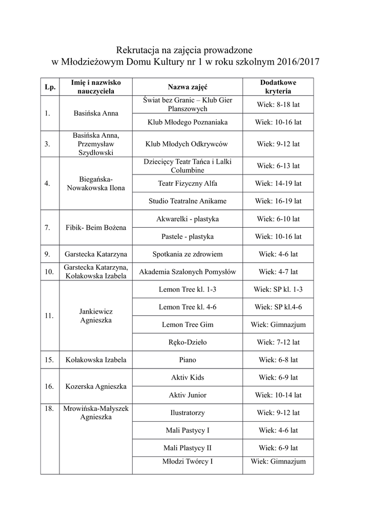 Rekrutacja na zajęcia prowadzone w Młodzieżowym Domu Kultury nr 1 w roku szkolnym 2016/2017 Lp. 1. 3. 4. 7. Imię i nazwisko nauczyciela Basińska Anna Basińska Anna, Przemysław Szydłowski BiegańskaNowakowska Ilona Nazwa zajęć Dodatkowe kryteria Świat bez Granic – Klub Gier Planszowych Wiek: 8-18 lat Klub Młodego Poznaniaka Wiek: 10-16 lat Klub Młodych Odkrywców Wiek: 9-12 lat Dziecięcy Teatr Tańca i Lalki Columbine Wiek: 6-13 lat Teatr Fizyczny Alfa Wiek: 14-19 lat Studio Teatralne Anikame Wiek: 16-19 lat Akwarelki - plastyka Wiek: 6-10 lat Pastele - plastyka Wiek: 10-16 lat Fibik- Beim Bożena 9. Garstecka Katarzyna Spotkania ze zdrowiem Wiek: 4-6 lat 10. Garstecka Katarzyna, Kołakowska Izabela Akademia Szalonych Pomysłów Wiek: 4-7 lat Lemon Tree kl. 1-3 Wiek: SP kl. 1-3 Lemon Tree kl. 4-6 Wiek: SP kl.4-6 Lemon Tree Gim Wiek: Gimnazjum Ręko-Dzieło Wiek: 7-12 lat Piano Wiek: 6-8 lat Aktiv Kids Wiek: 6-9 lat Aktiv Junior Wiek: 10-14 lat Ilustratorzy Wiek: 9-12 lat Mali Pastycy I Wiek: 4-6 lat Mali Plastycy II Wiek: 6-9 lat Młodzi Twórcy I Wiek: Gimnazjum 11. 15. 16. 18. Jankiewicz Agnieszka Kołakowska Izabela Kozerska Agnieszka Mrowińska-Małyszek Agnieszka Młodzi Twórcy II Wiek: GimnazjumLiceum Decoratio zespół scenograficzny Wiek: SP kl. 5-6 24. NowickaKompowska Marlena Pracownia Inicjatyw Społecznych TeXT Wiek: od 7 lat 25. Redlińska Katarzyna Dziupla Dobrych Słów Wiek: 9-13 lat Zespół wokalny Pauza Wiek: od 8 lat Zespół wokalno-instrumentalny Wiek: od 8 lat 26. Rogoża Paweł 28. Rowecka Anna Wesołe Nutki Wiek: Szkoła Podstawowa i Gimnazjum 29. Sidor Urszula Artystyczny Klub Przedszkolaka Wiek: 3-5 lat Dicte I – nauka śpiewu Wiek: od 14 lat 30. SobierańskaMatuszkiewicz Dorota Dicte II – zajęcia aktorskie Wiek: od 9 lat 32. Stypa Łukasz Siłownia Wiek: Gimnazjum i Szkoła Ponadgimnazjalna 33. Szydłowski Przemyslaw Fotoplastikon Wiek: 9-12 lat Tenis gr. początkująca Wiek: 6-12 lat 34. Woźny Paweł Tenis gr. zaawansowana Wiek: od 12 lat Sekcja Piłki Nożnej Wiek: 6-11 lat Klub Spartanina Wiek: od 13 lat Bounce gr początkująca Wiek: 8-9 lat Bounce gr średniozaawansowana Wiek: 12-14 lat 36. 38. Zachara Rafał Żeberska-Kowalska Kornelia