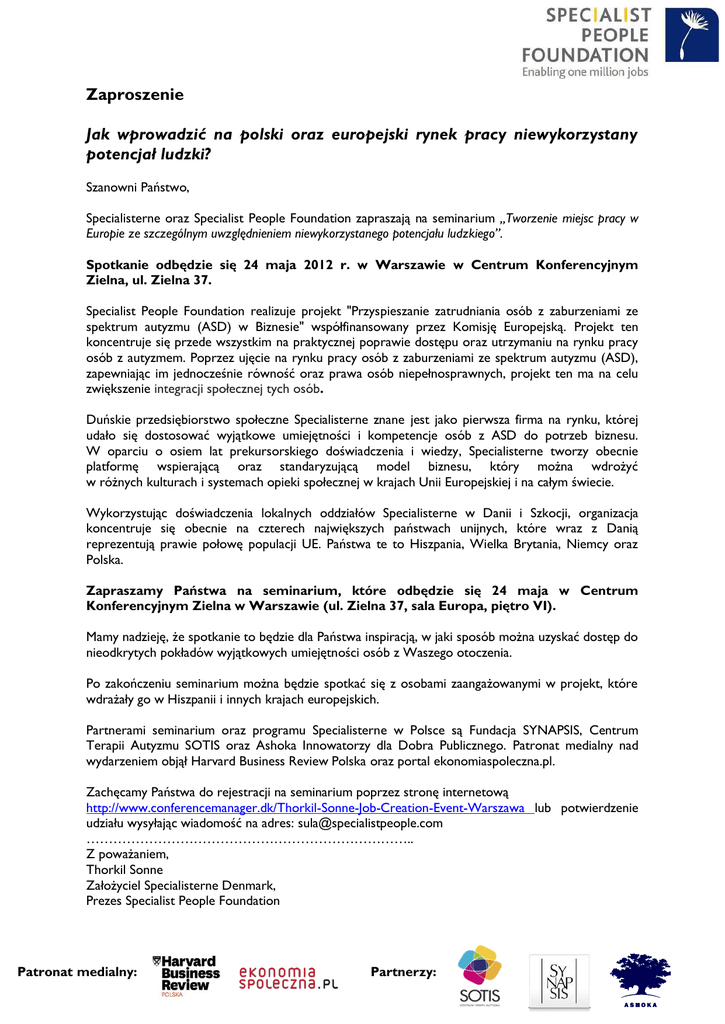 Zaproszenie Jak wprowadzić na polski oraz europejski rynek pracy niewykorzystany potencjał ludzki? Szanowni Państwo, Specialisterne oraz Specialist People Foundation zapraszają na seminarium „Tworzenie miejsc pracy w Europie ze szczególnym uwzględnieniem niewykorzystanego potencjału ludzkiego”. Spotkanie odbędzie się 24 maja 2012 r. w Warszawie w Centrum Konferencyjnym Zielna, ul. Zielna 37. Specialist People Foundation realizuje projekt "Przyspieszanie zatrudniania osób z zaburzeniami ze spektrum autyzmu (ASD) w Biznesie" współfinansowany przez Komisję Europejską. Projekt ten koncentruje się przede wszystkim na praktycznej poprawie dostępu oraz utrzymaniu na rynku pracy osób z autyzmem. Poprzez ujęcie na rynku pracy osób z zaburzeniami ze spektrum autyzmu (ASD), zapewniając im jednocześnie równość oraz prawa osób niepełnosprawnych, projekt ten ma na celu zwiększenie integracji społecznej tych osób. Duńskie przedsiębiorstwo społeczne Specialisterne znane jest jako pierwsza firma na rynku, której udało się dostosować wyjątkowe umiejętności i kompetencje osób z ASD do potrzeb biznesu. W oparciu o osiem lat prekursorskiego doświadczenia i wiedzy, Specialisterne tworzy obecnie platformę wspierającą oraz standaryzującą model biznesu, który można wdrożyć w różnych kulturach i systemach opieki społecznej w krajach Unii Europejskiej i na całym świecie. Wykorzystując doświadczenia lokalnych oddziałów Specialisterne w Danii i Szkocji, organizacja koncentruje się obecnie na czterech największych państwach unijnych, które wraz z Danią reprezentują prawie połowę populacji UE. Państwa te to Hiszpania, Wielka Brytania, Niemcy oraz Polska. Zapraszamy Państwa na seminarium, które odbędzie się 24 maja w Centrum Konferencyjnym Zielna w Warszawie (ul. Zielna 37, sala Europa, piętro VI). Mamy nadzieję, że spotkanie to będzie dla Państwa inspiracją, w jaki sposób można uzyskać dostęp do nieodkrytych pokładów wyjątkowych umiejętności osób z Waszego otoczenia. Po zakończeniu seminarium można będzie spotkać się z osobami zaangażowanymi w projekt, które wdrażały go w Hiszpanii i innych krajach europejskich. Partnerami seminarium oraz programu Specialisterne w Polsce są Fundacja SYNAPSIS, Centrum Terapii Autyzmu SOTIS oraz Ashoka Innowatorzy dla Dobra Publicznego. Patronat medialny nad wydarzeniem objął Harvard Business Review Polska oraz portal ekonomiaspoleczna.pl. Zachęcamy Państwa do rejestracji na seminarium poprzez stronę internetową http://www.conferencemanager.dk/Thorkil-Sonne-Job-Creation-Event-Warszawa lub potwierdzenie udziału wysyłając wiadomość na adres: [email protected] ……………………………………………………………….. Z poważaniem, Thorkil Sonne Założyciel Specialisterne Denmark, Prezes Specialist People Foundation Patronat medialny: Partnerzy: www.specialistpeople.com Specialisterne jest pierwszą, uznaną na forum międzynarodowym organizacją, która pokazuje, w jaki sposób można skutecznie zintegrować wysoko funkcjonujące osoby z autyzmem w społeczeństwie oraz świadczyć wysokiej jakości usługi ich pracodawcom. Wraz z lokalnym partnerem, fundacja Special People Foundation otworzyła swoją pierwszą międzynarodową placówkę poza obszarem Danii w Glasgow, w Szkocji w sierpniu 2010 roku. W kwietniu 2011 roku został otworzony kolejny oddział Specialisterne w Islandii, a w październiku tego samego roku w Szwajcarii. Oddział norweski został uruchomiony na początku tego roku jako partnerstwo SPF oraz Unicus of Norway, firmy powstałej w 2009 roku, której inspiracją było duńskie przedsiębiorstwo społeczne Specialisterne. Patronat medialny: Partnerzy: