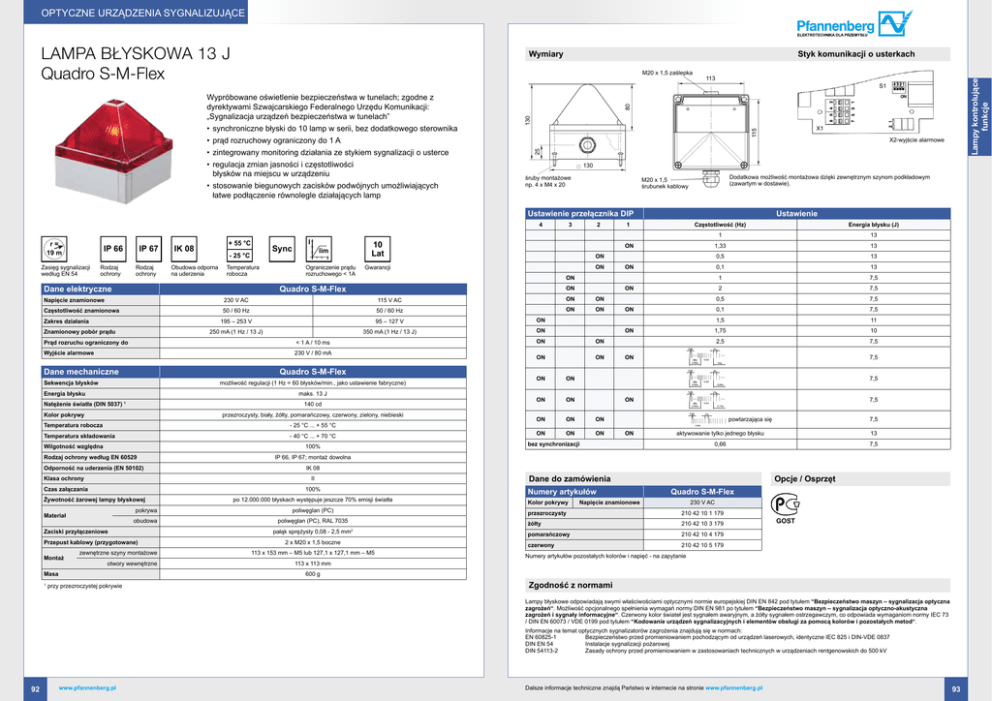Optyczne urządzenia sygnalizujące Wymiary M20 x 1,5 zaślepka Styk komunikacji o usterkach 113 130 • regulacja zmian jasności i częstotliwości błysków na miejscu w urządzeniu 130 • stosowanie biegunowych zacisków podwójnych umożliwiających łatwe podłączenie równolegle działających lamp śruby montażowe np. 4 x M4 x 20 Dodatkowa możliwość montażowa dzięki zewnętrznym szynom podkładowym (zawartym w dostawie). M20 x 1,5 śrubunek kablowy Ustawienie przełącznika DIP 4 IP 66 Zasięg sygnalizacji według EN 54 Rodzaj ochrony IP 67 Rodzaj ochrony + 55 °C IK 08 Sync - 25 °C Obudowa odporna na uderzenia Temperatura robocza Dane elektryczne I lim t Ograniczenie prądu rozruchowego < 1A Gwarancji ON Częstotliwość znamionowa 50 / 60 Hz 50 / 60 Hz Wyjście alarmowe 230 V / 80 mA Dane mechaniczne możliwość regulacji (1 Hz = 60 błysków/min., jako ustawienie fabryczne) Energia błysku maks. 13 J Natężenie światła (DIN 5037) 1 140 cd Kolor pokrywy przezroczysty, biały, żółty, pomarańczowy, czerwony, zielony, niebieski Temperatura robocza - 25 °C ... + 55 °C Temperatura składowania - 40 °C ... + 70 °C Wilgotność względna 100% Rodzaj ochrony według EN 60529 Odporność na uderzenia (EN 50102) Klasa ochrony pokrywa Materiał obudowa Zaciski przyłączeniowe Przepust kablowy (przygotowane) zewnętrzne szyny montażowe otwory wewnętrzne Masa Energia błysku (J) 1 13 1,33 13 0,5 13 0,1 13 1 7,5 ON ON ON ON ON ON ON ON ON ON ON ON ON ON ON ON ON ON ON ON ON ON 2 7,5 0,5 7,5 0,1 7,5 1,5 11 1,75 10 2,5 7,5 ON 7,5 7,5 ON 7,5 powtarzająca się ON 7,5 aktywowanie tylko jednego błysku 13 0,66 7,5 bez synchronizacji IK 08 100% Żywotność żarowej lampy błyskowej Częstotliwość (Hz) IP 66, IP 67; montaż dowolna II Czas załączania 1 350 mA (1 Hz / 13 J) ON Quadro S-M-Flex Sekwencja błysków Montaż 95 – 127 V ON 195 – 253 V < 1 A / 10 ms 1 ON ON 115 V AC 250 mA (1 Hz / 13 J) Ustawienie ON 230 V AC Prąd rozruchu ograniczony do 2 ON Napięcie znamionowe Znamionowy pobór prądu 3 10 Lat Quadro S-M-Flex Zakres działania X2-wyjście alarmowe 25 • prąd rozruchowy ograniczony do 1 A • zintegrowany monitoring działania ze stykiem sygnalizacji o usterce X1 115 • synchroniczne błyski do 10 lamp w serii, bez dodatkowego sterownika 80 S1 Wypróbowane oświetlenie bezpieczeństwa w tunelach; zgodne z dyrektywami Szwajcarskiego Federalnego Urzędu Komunikacji: „Sygnalizacja urządzeń bezpieczeństwa w tunelach” r= 19 m Lampy kontrolujące funkcje Lampa błyskowa 13 J Quadro S-M-Flex po 12.000.000 błyskach występuje jeszcze 70% emisji światła poliwęglan (PC) poliwęglan (PC), RAL 7035 pałąk sprężysty 0,08 - 2,5 mm2 2 x M20 x 1,5 boczne 113 x 153 mm – M5 lub 127,1 x 127,1 mm – M5 113 x 113 mm Dane do zamówienia Numery artykułów Kolor pokrywy Opcje / Osprzęt Quadro S-M-Flex Napięcie znamionowe 230 V AC przezroczysty 210 42 10 1 179 żółty 210 42 10 3 179 pomarańczowy 210 42 10 4 179 czerwony 210 42 10 5 179 GOST Numery artykułów pozostałych kolorów i napięć - na zapytanie 600 g przy przezroczystej pokrywie Zgodność z normami Lampy błyskowe odpowiadają swymi właściwościami optycznymi normie europejskiej DIN EN 842 pod tytułem “Bezpieczeństwo maszyn – sygnalizacja optyczna zagrożeń“. Możliwość opcjonalnego spełnienia wymagań normy DIN EN 981 po tytułem “Bezpieczeństwo maszyn – sygnalizacja optyczno-akustyczna zagrożeń i sygnały informacyjne“. Czerwony kolor świateł jest sygnałem awaryjnym, a żółty sygnałem ostrzegawczym, co odpowiada wymaganiom normy IEC 73 / DIN EN 60073 / VDE 0199 pod tytułem “Kodowanie urządzeń sygnalizacyjnych i elementów obsługi za pomocą kolorów i pozostałych metod“. Informacje na temat optycznych sygnalizatorów zagrożenia znajdują się w normach: EN 60825-1 Bezpieczeństwo przed promieniowaniem pochodzącym od urządzeń laserowych, identyczne IEC 825 i DIN-VDE 0837 DIN EN 54Instalacje sygnalizacji pożarowej DIN 54113-2Zasady ochrony przed promieniowaniem w zastosowaniach technicznych w urządzeniach rentgenowskich do 500 kV 92 www.pfannenberg.pl Dalsze informacje techniczne znajdą Państwo w internecie na stronie www.pfannenberg.pl 93