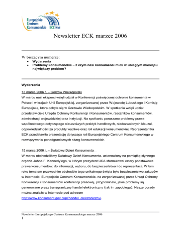 Newsletter ECK marzec 2006 W bieżącym numerze: · · Wydarzenia Problemy konsumenckie – z czym nasi konsumenci mieli w ubiegłym miesiącu największy problem? Wydarzenia 13 marca 2006 r. – Gorzów Wielkopolski W marcu nasi eksperci wzięli udział w Konferencji poświęconej ochronie konsumenta w Polsce i w krajach Unii Europejskiej, zorganizowanej przez Wojewodę Lubuskiego i Komisję Europejską, która odbyła się w Gorzowie Wielkopolskim. W spotkaniu wzięli udział przedstawiciele Urzędu Ochrony Konkurencji i Konsumentów, rzeczników konsumentów, administracji wojewódzkiej oraz instytucji. Na spotkaniu poruszano problemy prawa wspólnotowego dotyczącego nieuczciwych praktyk handlowych, niedozwolonych klauzul, odpowiedzialności za produkty wadliwe oraz roli edukacji konsumenckiej. Reprezentantka ECK przedstawiła prezentację dotycząca roli Europejskiego Centrum Konsumenckiego w rozwiązywaniu ponadgranicznych skarg konsumenckich. 15 marca 2006 r. – Światowy Dzień Konsumenta W marcu obchodziliśmy Światowy Dzień Konsumenta, ustanowiony na pamiątkę słynnego orędzia Johna F. Kennedy’ego, w którym prezydent USA sformułował cztery podstawowe prawa konsumentów: do informacji, wyboru, do bezpieczeństwa i do reprezentacji. W tym roku tematem przewodnim obchodów tego unikalnego święta było bezpieczeństwo zakupów w Internecie. Europejskie Centrum Konsumenckie, na zorganizowanej przez Urząd Ochrony Konkurencji i Konsumentów konferencji prasowej, przypominało, jakie problemy są generowane przez transgraniczny handel elektroniczny i jak im zapobiegać. Nasze porady można znaleźć w Internecie pod adresem http://www.konsument.gov.pl/pl/handel_elektroniczny/. Newsletter Europejskiego Centrum Konsumenckiego marzec 2006 1 22 marca 2006 r. – Wykład w CIE Nasz ekspert prawny, pan Piotr Stańczak, wystąpił w Centrum Informacji Europejskiej z wykładem z cyklu „ABC ochrony konsumenta w Unii Europejskiej”. Tematem wykładu było zagadnienie samoregulacji w biznesie. Streszczenie wystąpienia jest dostępne na stronie http://www.cie.gov.pl. Problemy konsumenckie – z czym nasi konsumenci mieli w ubiegłym miesiącu największy problem? Polscy konsumenci w dalszym ciągu sprowadzają używane samochody zza naszej zachodniej granicy skuszeni ich niską ceną. Niestety, wielu konsumentów rozczarowuje się co do nowego nabytku jeszcze zanim dojadą nim do granicy. Nieporozumienia między polskimi konsumentami a niemieckimi sprzedawcami dotyczą najczęściej warunków umowy oraz gwarancji. Niemieccy sprzedawcy używanych aut stosują w kontraktach z konsumentami wzory umów dla przedsiębiorców tj. takie, które są stosowane przy umowach zawieranych w celach związanych z działalnością zawodową lub gospodarczą. Takie umowy zawierają klauzule wyłączające gwarancję. Konsument, który podpisał taką umowę nie może potem dochodzić swoich praw i domagać się naprawy samochodu na podstawie gwarancji lub zwrotu kosztów takiej naprawy. Bardzo rzadko udaje się załatwić takie sprawy polubownie, konsument musi dochodzić swoich praw w sądzie. Do Europejskiego Centrum Konsumenckiego często trafiają poszkodowani w ten sposób konsumenci. Dlatego wszystkim, którzy planują zakup używanego auta w Niemczech doradzamy, aby zwracali szczególną uwagę na treść podpisywanej umowy, zwłaszcza gdy ma ona charakter wzorca i posiada nieuzgodnione z klientem klauzule. Przy zakupie używanego auta trzeba wyraźnie zaznaczyć, że jest ono przeznaczone do prywatnego użytku konsumenta. W takim przypadku konsument nie utraci prawa do ochrony prawnej a może ona być jedynie ograniczona maksymalnie do 1 roku, z tytułu dyrektywy o niezgodności towaru z umową. W przypadku, gdy treść umowy jest niezrozumiała, konsument nie powinien jej podpisywać! Newsletter Europejskiego Centrum Konsumenckiego marzec 2006 2