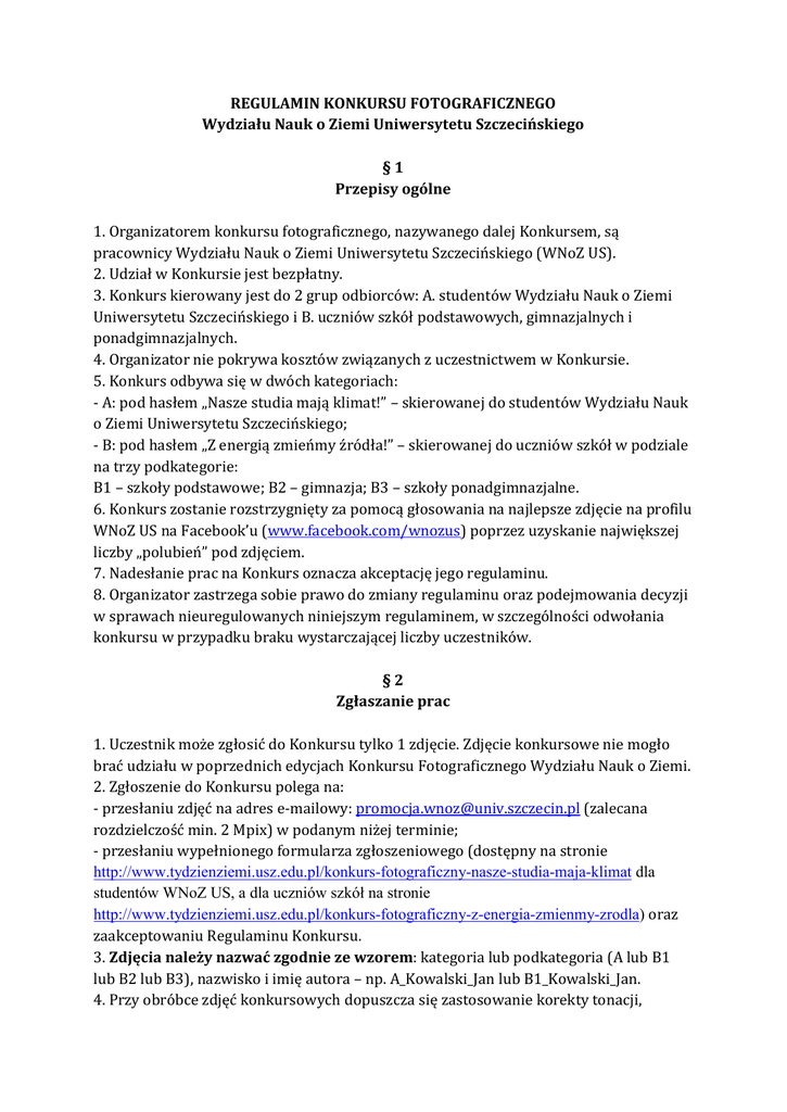 REGULAMIN KONKURSU FOTOGRAFICZNEGO Wydziału Nauk o Ziemi Uniwersytetu Szczecińskiego §1 Przepisy ogólne 1. Organizatorem konkursu fotograficznego, nazywanego dalej Konkursem, są pracownicy Wydziału Nauk o Ziemi Uniwersytetu Szczecińskiego (WNoZ US). 2. Udział w Konkursie jest bezpłatny. 3. Konkurs kierowany jest do 2 grup odbiorców: A. studentów Wydziału Nauk o Ziemi Uniwersytetu Szczecińskiego i B. uczniów szkół podstawowych, gimnazjalnych i ponadgimnazjalnych. 4. Organizator nie pokrywa kosztów związanych z uczestnictwem w Konkursie. 5. Konkurs odbywa się w dwóch kategoriach: - A: pod hasłem „Nasze studia mają klimat!” – skierowanej do studentów Wydziału Nauk o Ziemi Uniwersytetu Szczecińskiego; - B: pod hasłem „Z energią zmieńmy źródła!” – skierowanej do uczniów szkół w podziale na trzy podkategorie: B1 – szkoły podstawowe; B2 – gimnazja; B3 – szkoły ponadgimnazjalne. 6. Konkurs zostanie rozstrzygnięty za pomocą głosowania na najlepsze zdjęcie na profilu WNoZ US na Facebook’u (www.facebook.com/wnozus) poprzez uzyskanie największej liczby „polubień” pod zdjęciem. 7. Nadesłanie prac na Konkurs oznacza akceptację jego regulaminu. 8. Organizator zastrzega sobie prawo do zmiany regulaminu oraz podejmowania decyzji w sprawach nieuregulowanych niniejszym regulaminem, w szczególności odwołania konkursu w przypadku braku wystarczającej liczby uczestników. §2 Zgłaszanie prac 1. Uczestnik może zgłosić do Konkursu tylko 1 zdjęcie. Zdjęcie konkursowe nie mogło brać udziału w poprzednich edycjach Konkursu Fotograficznego Wydziału Nauk o Ziemi. 2. Zgłoszenie do Konkursu polega na: - przesłaniu zdjęć na adres e-mailowy: [email protected] (zalecana rozdzielczość min. 2 Mpix) w podanym niżej terminie; - przesłaniu wypełnionego formularza zgłoszeniowego (dostępny na stronie http://www.tydzienziemi.usz.edu.pl/konkurs-fotograficzny-nasze-studia-maja-klimat dla studentów WNoZ US, a dla uczniów szkół na stronie http://www.tydzienziemi.usz.edu.pl/konkurs-fotograficzny-z-energia-zmienmy-zrodla) oraz zaakceptowaniu Regulaminu Konkursu. 3. Zdjęcia należy nazwać zgodnie ze wzorem: kategoria lub podkategoria (A lub B1 lub B2 lub B3), nazwisko i imię autora – np. A_Kowalski_Jan lub B1_Kowalski_Jan. 4. Przy obróbce zdjęć konkursowych dopuszcza się zastosowanie korekty tonacji, kontrastu, konwersje do czerni-bieli, kadrowanie oraz drobny retusz. 5. Organizator zastrzega sobie prawo do dyskwalifikowania prac nie spełniających wymogów formalnych, w szczególności technicznych i tematycznych. 6. Uczestnik przystępując do Konkursu oświadcza, że jest autorem nadesłanych zdjęć oraz posiada do nich całość praw autorskich, majątkowych i osobistych. 7. Uczestnik przystępując do Konkursu zawiera umowę nieodpłatnego przekazania całości praw autorskich majątkowych na rzecz organizatora Konkursu. 8. Uczestnik zachowuje prawa autorskie osobiste do utworów zgłaszanych na Konkurs. 9. Organizator zachowuje prace konkursowe na portalu Facebook i w archiwum. §3 Terminy 1. Termin zgłoszenia do Konkursu upływa 26 kwietnia 2015 r. o północy. 2. Głosowanie na portalu Facebook będzie trwało od 27 kwietnia do 10 maja 2015 r. 3. Prace nadesłane po terminie nie będą brane pod uwagę w Konkursie. 4. Ogłoszenie wyników konkursu odbędzie się 11 maja 2015 r. §4 Nagrody i wyróżnienia 1. Zwycięskie prace zostaną opublikowane na portalach internetowych, a ich autorzy otrzymają pamiątkowe dyplomy i nagrody rzeczowe. 2. Nagrody przewidziane są dla zwycięzców zgodnie z poniższym schematem: - kategoria A – nagroda za zajęcie I miejsca, II i III miejsca; - podkategoria B1 – nagroda za zajęcie I miejsca dla autora pracy oraz jego klasy, nagrody pocieszenia za zajęcie II i III miejsca; - podkategoria B2 – nagroda za zajęcie I miejsca dla autora pracy oraz jego klasy, nagrody pocieszenia za zajęcie II i III miejsca; - podkategoria B3 – nagroda za zajęcie I miejsca dla autora pracy oraz jego klasy, nagrody pocieszenia za zajęcie II i III miejsca; 3. Wyniki zostaną ogłoszone po zakończeniu Konkursu na stronach: www.tydzienziemi.univ.szczecin.pl i www.facebook.com/wnozus. 4. Nagrody i dyplomy zostaną przekazane zwycięzcom w formie przesyłki pocztowej. §5 Postanowienia końcowe 1. Organizator ma prawo do zmiany postanowień niniejszego Regulaminu bez podawania przyczyny. Zmieniony Regulamin obowiązuje od czasu opublikowania go na stronie www.tydzienziemi.usz.edu.pl. 2. Organizator ma prawo do odwołania Konkursu, bez podawania przyczyny.