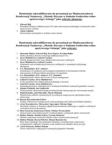 Doniesienia zakwalifikowane do prezentacji na Międzynarodowej Konferencji Naukowej: „Metody fizyczne w badaniu środowiska rolnospożywczego i leśnego” jako referaty plenarne: 1. Edward Rój Ekstrakcja biomasy nadkrytycznym CO2 jako innowacyjna technologia w przemyśle rolnospożywczym i leśnym. 2. Adam Lipiński Innowacyjne rozwiązania w technice siewu nasion. Doniesienia zakwalifikowane do prezentacji na Międzynarodowej Konferencji Naukowej: „Metody fizyczne w badaniu środowiska rolnospożywczego i leśnego” jako referaty: 1. Sławomir Bakier, Edward Rój, Ewa Zapora, Ewelina Bajko Efekty ekstrakcji drewna sosnowego nadkrytycznym CO2. 2. Jerzy Bohdziewicz, Gabriel Czachor Metody prognozowania czasu składowania surowców roślinnych. 3. Jerzy Bohdziewicz, Gabriel Czachor Zmienność cech reologicznych surowców roślinnych w warunkach cyklicznego obciążenia. 4. S.A. Buzmakhov, D.N. Andreev Examination of conditions and ecological remediation of environment with the measurement of photosynthetic parameters of vegetation. 5. S.A. Buzmakhov, D.N. Andreev, P.Y. Sannikov Unpiloted aerial vehicle and its uses in forest management. 6. Gabriel Czachor, Jerzy Bohdziewicz Cechy geometryczne cząstek pyłu pozyskanego z tuczarni. 7. Gabriel Czachor, Jerzy Bohdziewicz Dynamika procesów zachodzących w ściskanych tkankach wybranych gatunków warzyw. 8. Jolanta Fieducik, Jan Godlewski Wykorzystanie skoncentrowanego promieniowania słonecznego do wytwarzania energii. 9. Rafał Kobyłka, Józef Horabik, Marek Molenda Modelowanie efektów dynamicznych wywołanych rozpoczęciem opróżniania silosu zbożowego. 10. Renata Korzeniowska-Ginter Zmiany właściwości reologicznych ciasta pszennego pod wpływem dodatku trehalozy 11. Artur Kraszkiewicz, Mieczysław Szpryngiel, Marian Zając Zawartość celulozy w biomasie odpadowej pochodzenia rolniczego w aspekcie wybranych cech jakościowych dla peletów. 12. Deta Łuczycka, Katarzyna Pentoś, Tobiasz Wysoczański Zastosowanie cech elektrycznych w kontroli jakości wybranych soków owocowych. 13. Halina Makała, Monika Foltyn, Urszula Siekierko Metody oznaczania zawartości chlorku sodu w przetworach mięsnych. 14. Halina Makała, Ryszard Rezler, Hanna Baranowska Rola oleju roślinnego oraz preparatów błonnika w kształtowaniu właściwości reologicznych i zdolności wiązania wody modelowych układów tłuszczowych. 15. Aneta Ocieczek, Halina Makała Ocena właściwości sorpcyjnych wybranych preparatów błonnika. 16. Aneta Ocieczek, Magdalena Skotnicka, Kinga Baranowska Właściwości sorpcyjne modyfikowanych skrobi kukurydzianych w matematycznym opisie izoterm sorpcji. 17. Katarzyna Pentoś, Deta Łuczycka, Tobiasz Wysoczański Wpływ temperatury i stopnia krystalizacji miodu na jego cechy elektryczne. 18. Tomasz Pukszta, Piotr Palich, Skibińska Marzena Zawartość barwników karotenoidowych w papryce czerwonej w zależności od metody rozmrażania i czasu zamrażalniczego przechowywania. 19. Małgorzata Rauba Wpływ obszarów użytkowanych rolniczo na właściwości fizykochemiczne wód płynących na przykładzie rzeki Rokietnica. 20. Milena Ruszkowska Porównanie właściwości sorpcyjnych wybranych odmian komosy ryżowej (Quinoa). 21. Wojciech Rybiński, Wojciech Święcicki, Elżbieta Starzycka, Jan Bocianowski, Robert Rusinek Fizykochemiczne właściwości nasion łubinu ze szczególnym uwzględnieniem łubinu białego (Lupinus albus L.). 22. Małgorzata Serowik, Krzysztof Lech Wpływ metody i parametrów suszenia płatków róży na barwę naparu i jego właściwości przeciwutleniające. 23. Marek Sikora, Greta Adamczyk, Magdalena Krystyjan, Anna Dobosz, Edyta Maja Kutyła-Kupidura, Piotr Tomasik, Renata Sabat, Anna Wywrocka-Gurgul Czy można otrzymać kleiki o właściwościach reologicznych skrobi utlenionej poprzez mieszanie naturalnych hydrokoloidów polisacharydowych? 24. Magdalena Skotnicka, Aneta Ocieczek The influence of viscosity on the level of satiety index (IS) in tomato cream soup. 25. Mateusz Stasiak, Marek Molenda Biomasa sypka. Właściwości, problemy oraz nowa metoda badawcza. 26. Stanisław Tyszkiewicz Z krajowych badań nad pirolizą drewna w aspekcie uwarunkowań wędzarnictwa żywności. Badacze i ich dzieła. 27. Małgorzata Warechowska, Agnieszka Markowska, Katarzyna Wojtkowiak, Arkadiusz Stępień, Agnieszka Nawrocka Analiza właściwości fizycznych ziarna zbóż zróżnicowanego pod względem wielkości z zastosowaniem analizatora SKCS. 28. Piotr Wasieczko, Agata Bieńczak, Jacek Marcinkiewicz, Jan Szczepaniak Wielowariantowe analizy wytrzymałościowe konstrukcji sterylizatora spożywczego z wykorzystaniem metody elementów skończonych. 29. Tobiasz Wysoczański, Deta Łuczycka, Katarzyna Pentoś Ocena jakości drewna na podstawie analizy jego cech elektrycznych. Doniesienia zakwalifikowane do prezentacji na Międzynarodowej Konferencji Naukowej: „Metody fizyczne w badaniu środowiska rolnospożywczego i leśnego” jako postery: 1. Andrzej Anders, Zdzisław Kaliniewicz, Piotr Markowski Modelowanie numeryczne cech geometrycznych i fizycznych surowców rolnospożywczych na przykładzie wybranych gatunków owoców orzechów. 2. Patrycja Boguta Application of potentiometric methods to studies of physicochemical interactions between soil humic substances and zinc ions at wide ph range. 3. Patrycja Boguta, Zofia Sokołowska Analysis of sorption properties of humic and fulvic acids originating from different soils using potentiometric titration method. 4. Witold Danelski, Teresa Badowska-Czubik Agrotechniczne metody ograniczania liczebności nasionnicy trześniówki (Rhagoletis cerasi L.) jako czynnik umożliwiający zmniejszenie zużycia pestycydów w ochronie czereśni. 5. Anna Dobosz, Marek Sikora, Greta Adamczyk, Magdalena Krystyjan, Edyta Maja Kutyła-Kupidura, Piotr Tomasik, Renata Sabat, Anna Wywrocka-Gurgul Właściwości reologiczne mieszanin normalnej skrobi ziemniaczanej z gumą arabską. 6